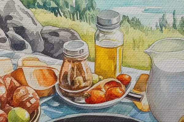 Image Petit déjeuner esthétique près du lac, style aquarelle Nr r42432