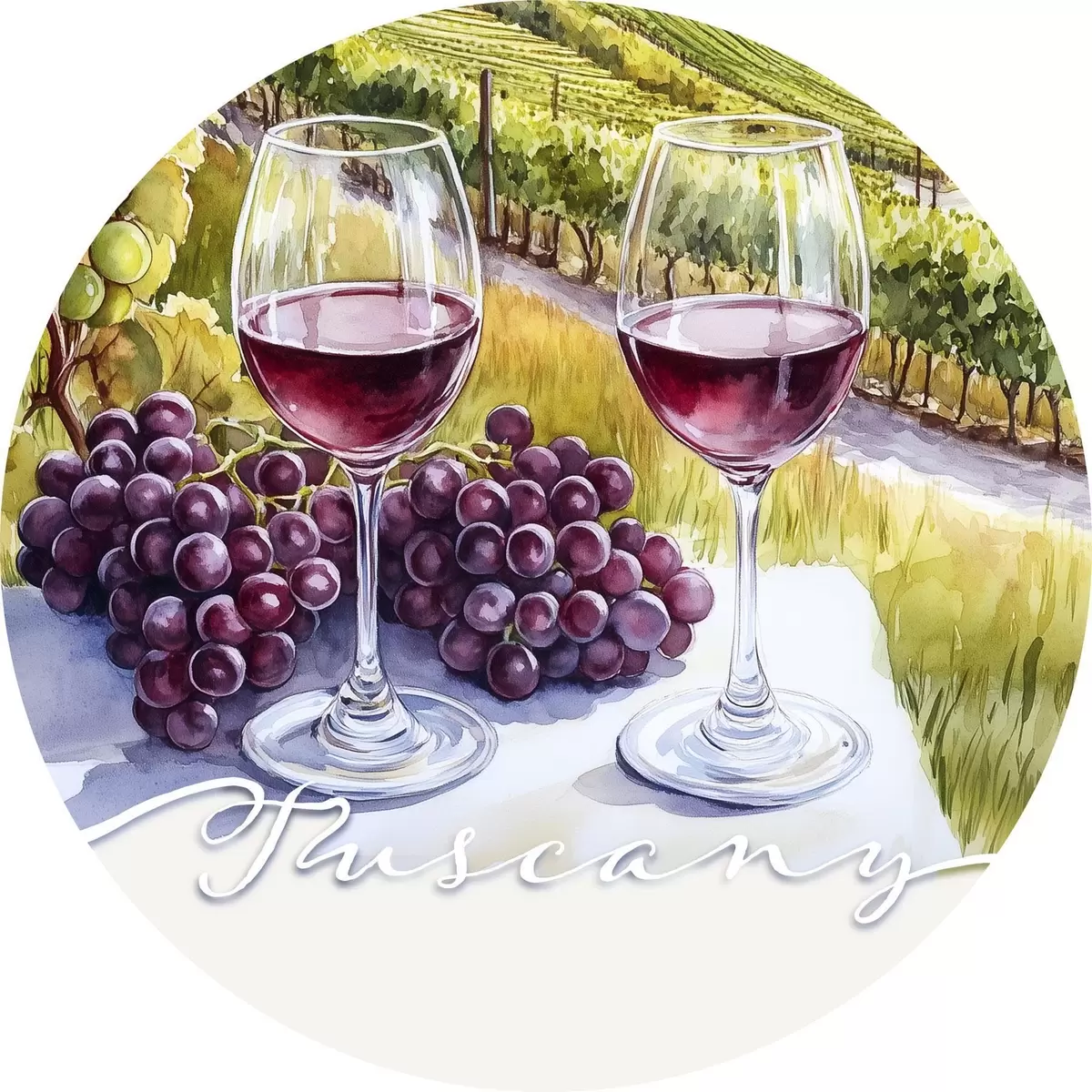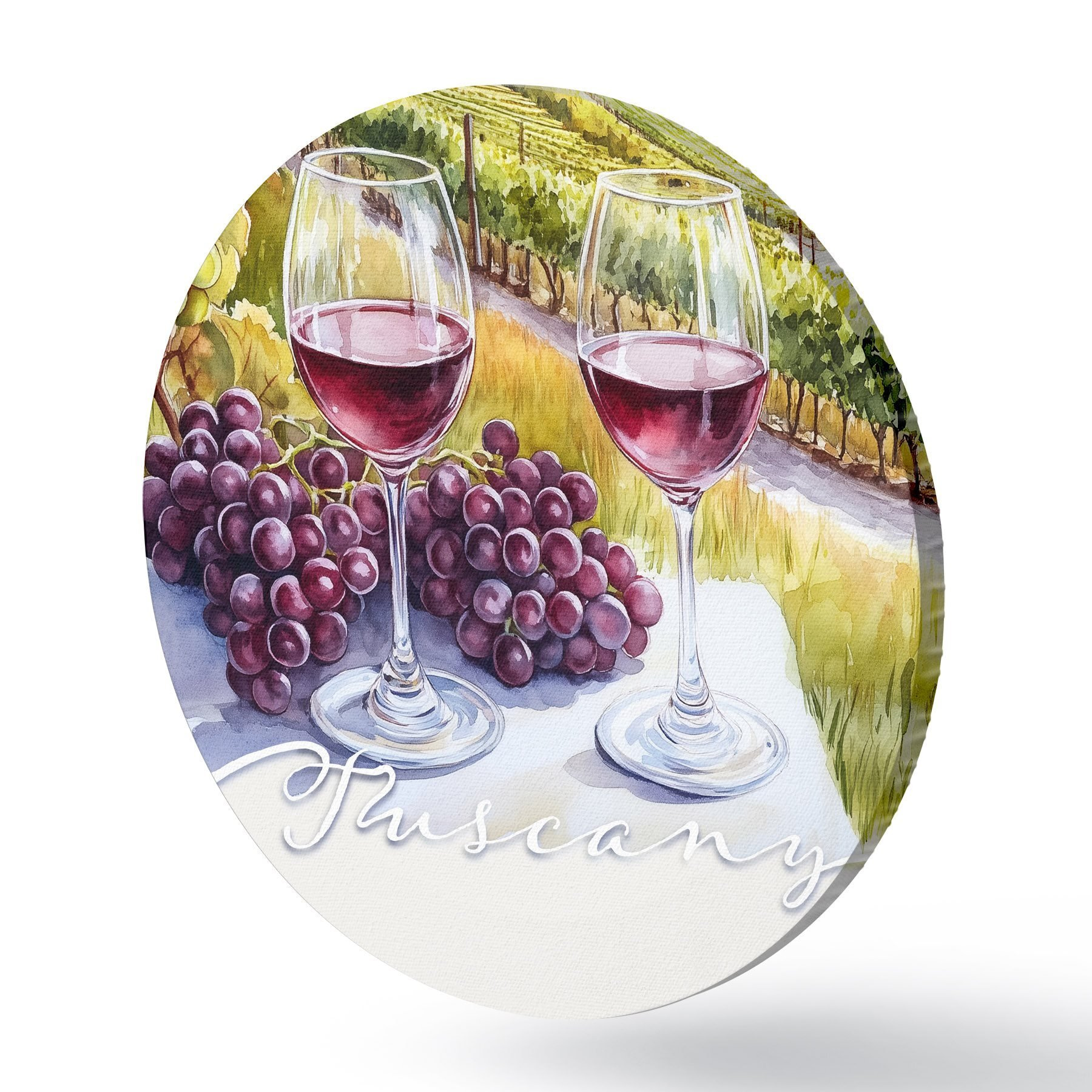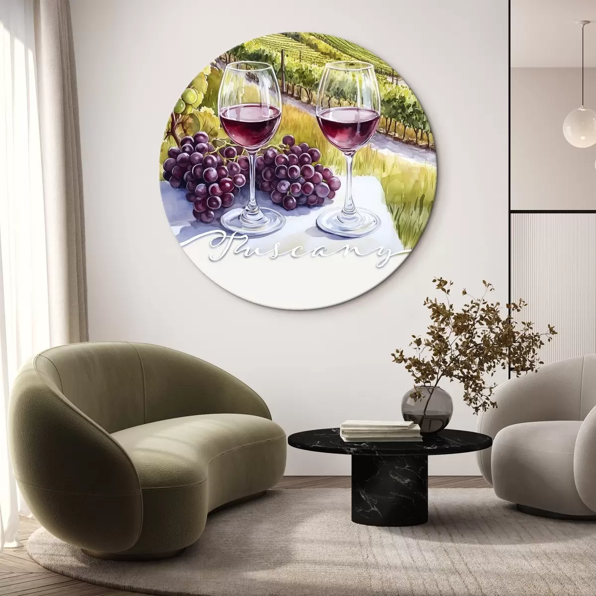 Tableaux ronds Paysages de Toscane, style aquarelle, verres à vin, raisins, coucher de soleil r42439