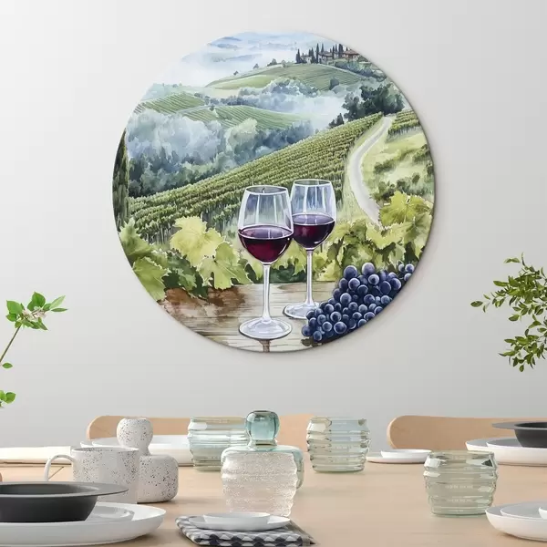 Tableaux ronds Paysage de Toscane, vignobles, verres à vin, style aquarelle r42445