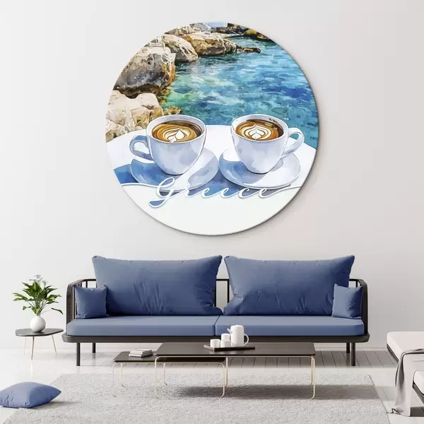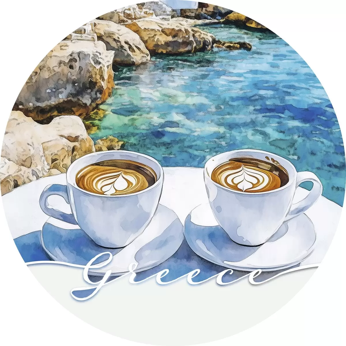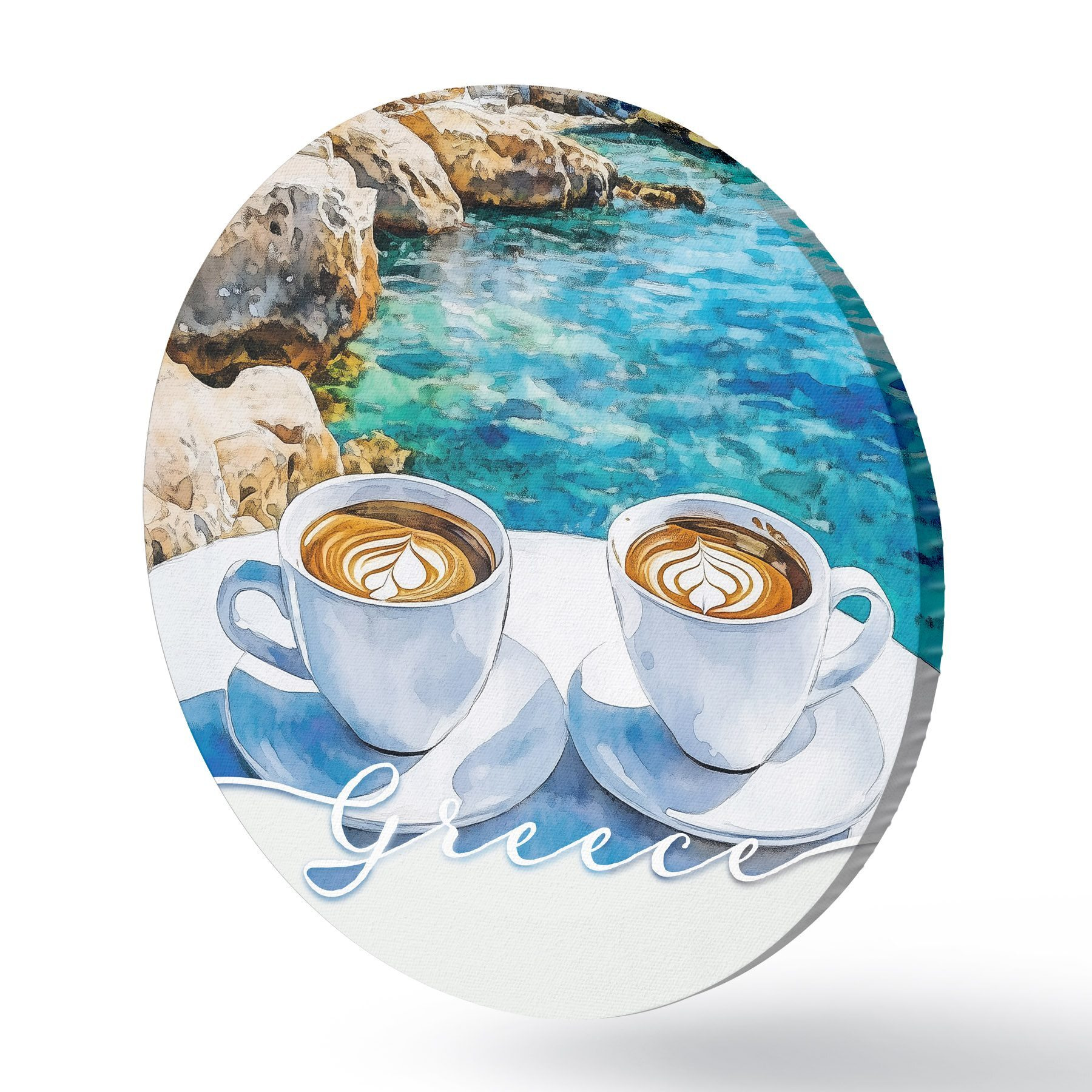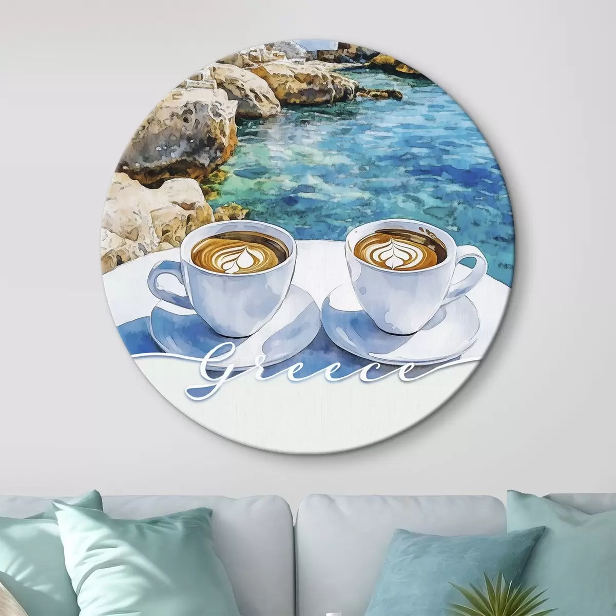 Tableaux ronds Grèce esthétique, tasses de café, mer bleue, vieille ville, voyage r42447