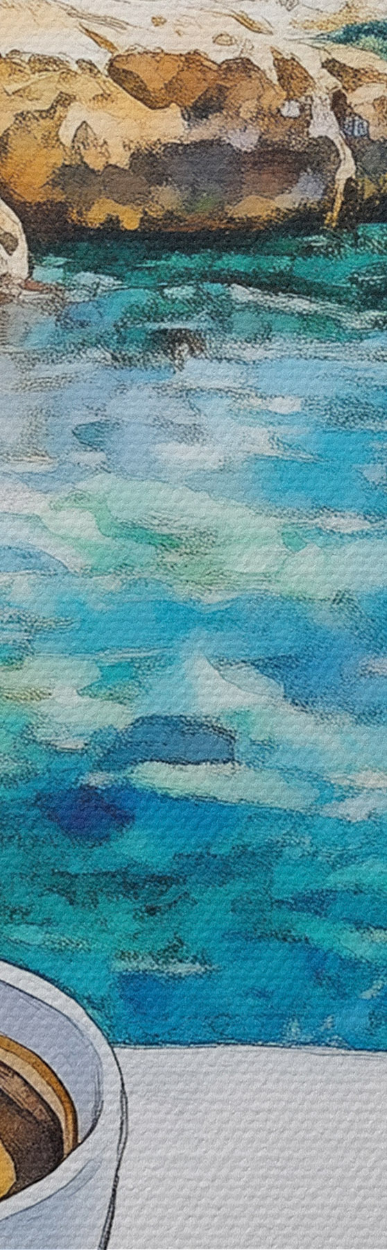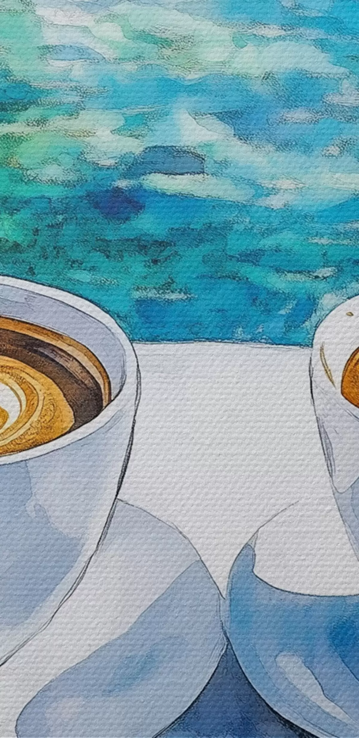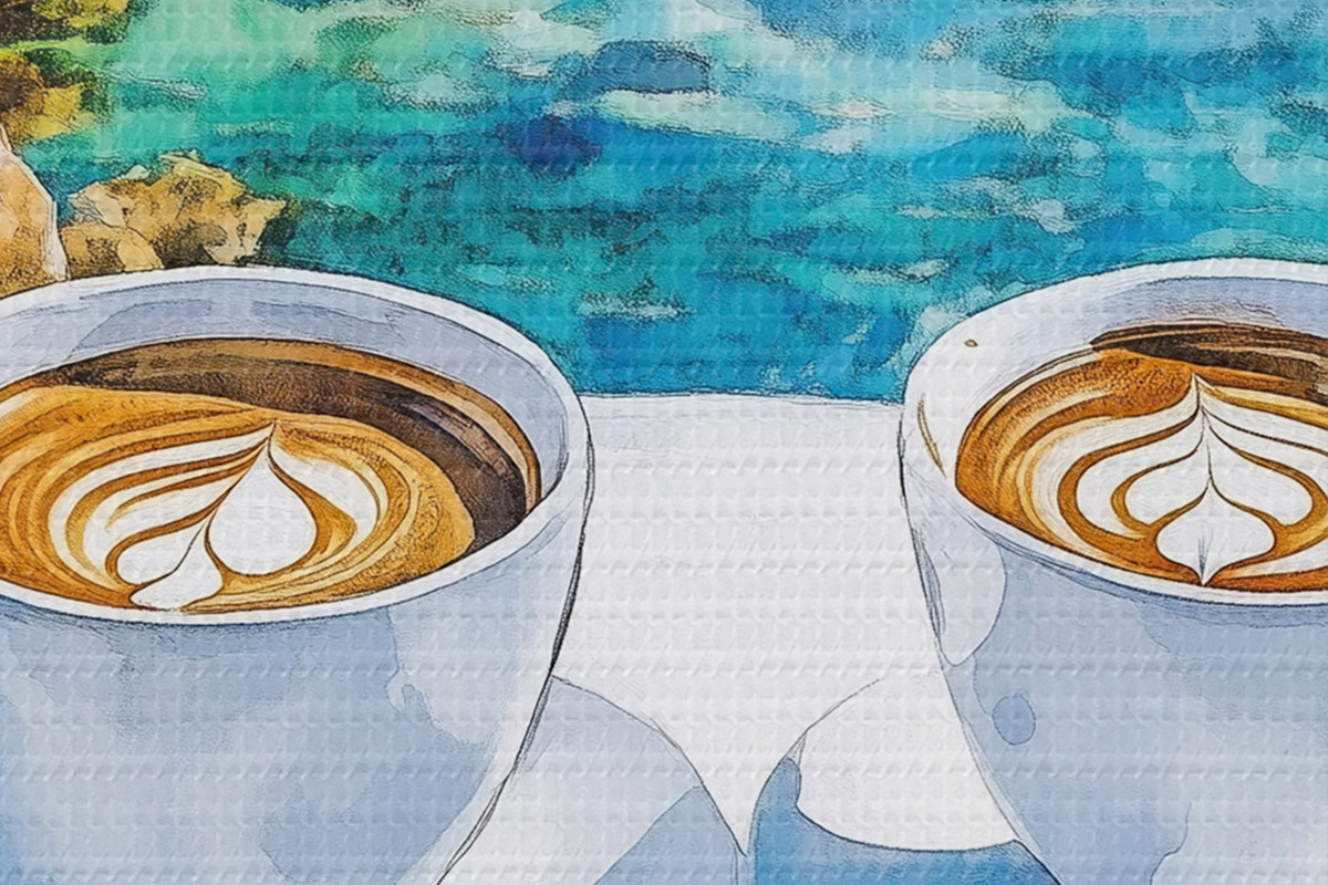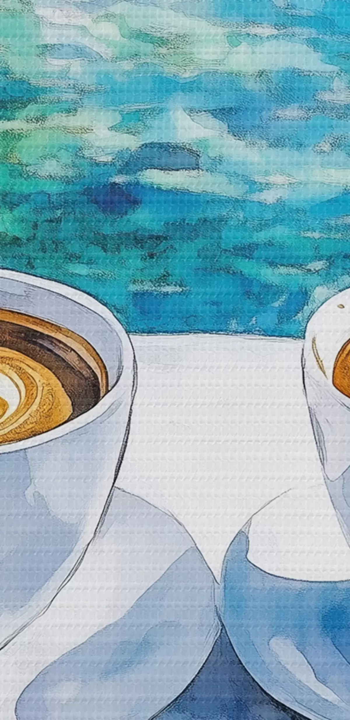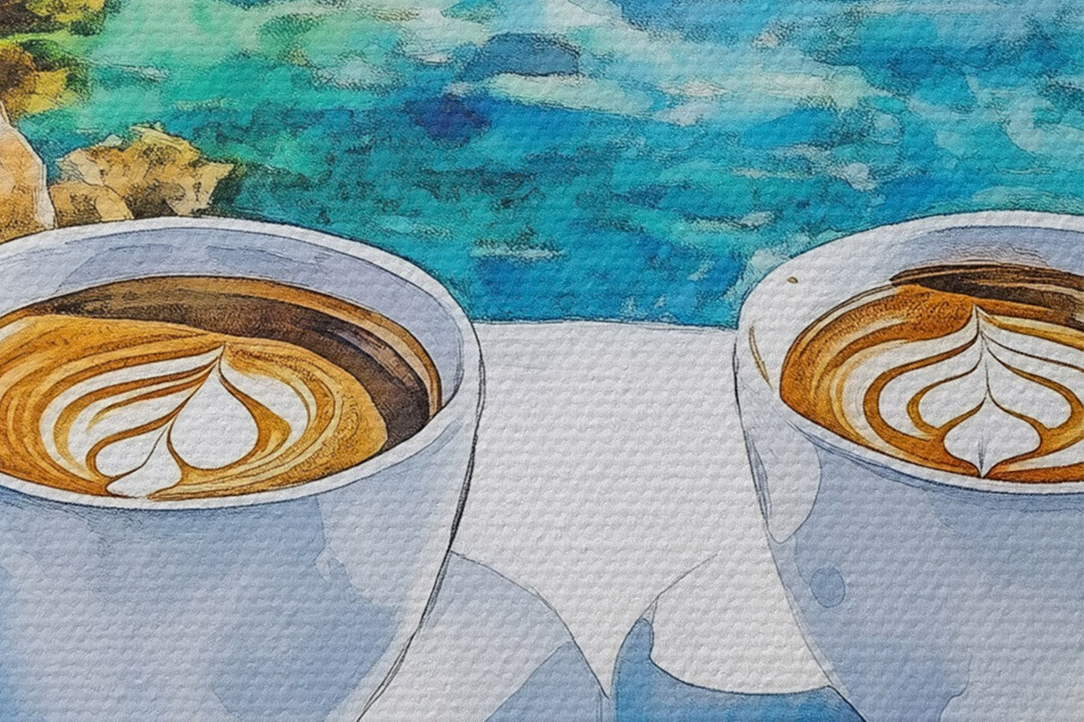 Image Grèce esthétique, tasses de café, mer bleue, vieille ville, voyage Nr r42447
