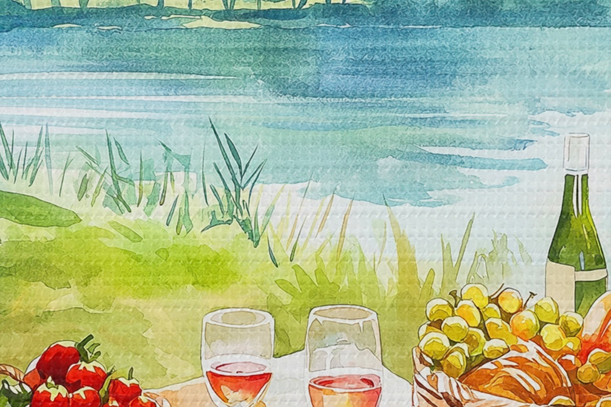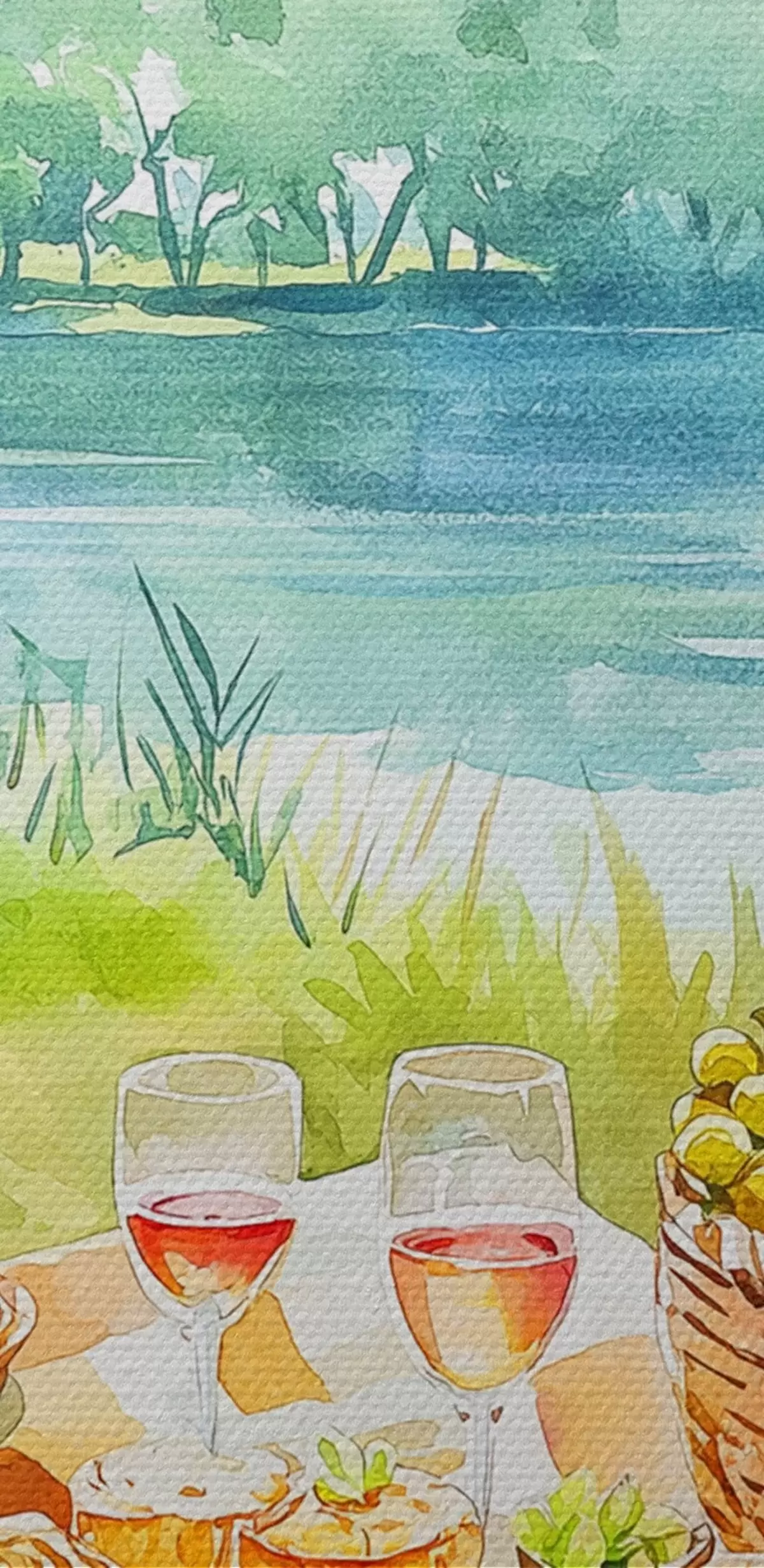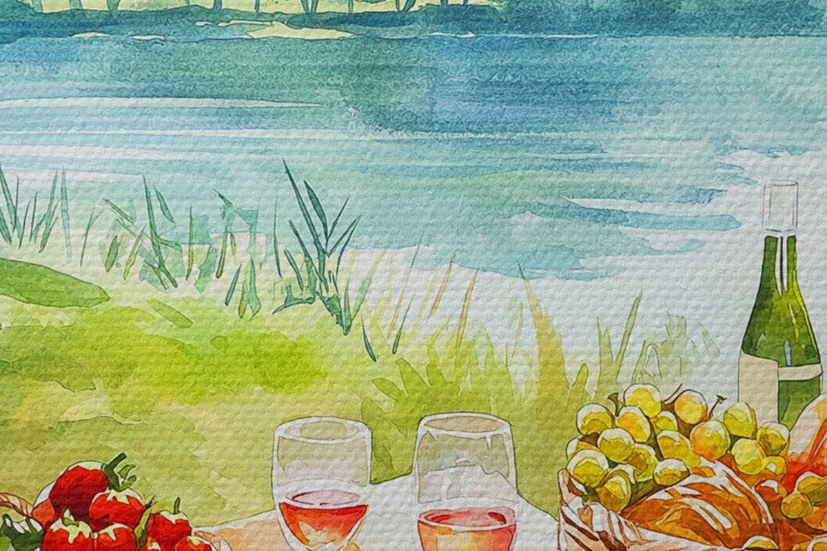 Image Esthétique du pique-nique, nature estivale, lac, romantique, style aquarelle Nr r42450