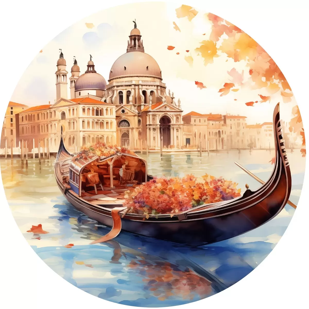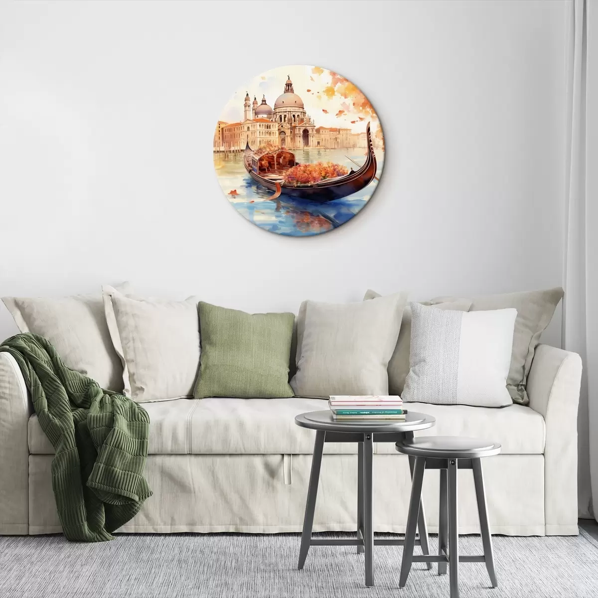 Tableaux ronds Vue automnale de Venise avec une gondole entourée de feuilles orange et rouge vif, avec les reflets des bâtiments dans l'eau calme du canal r42576
