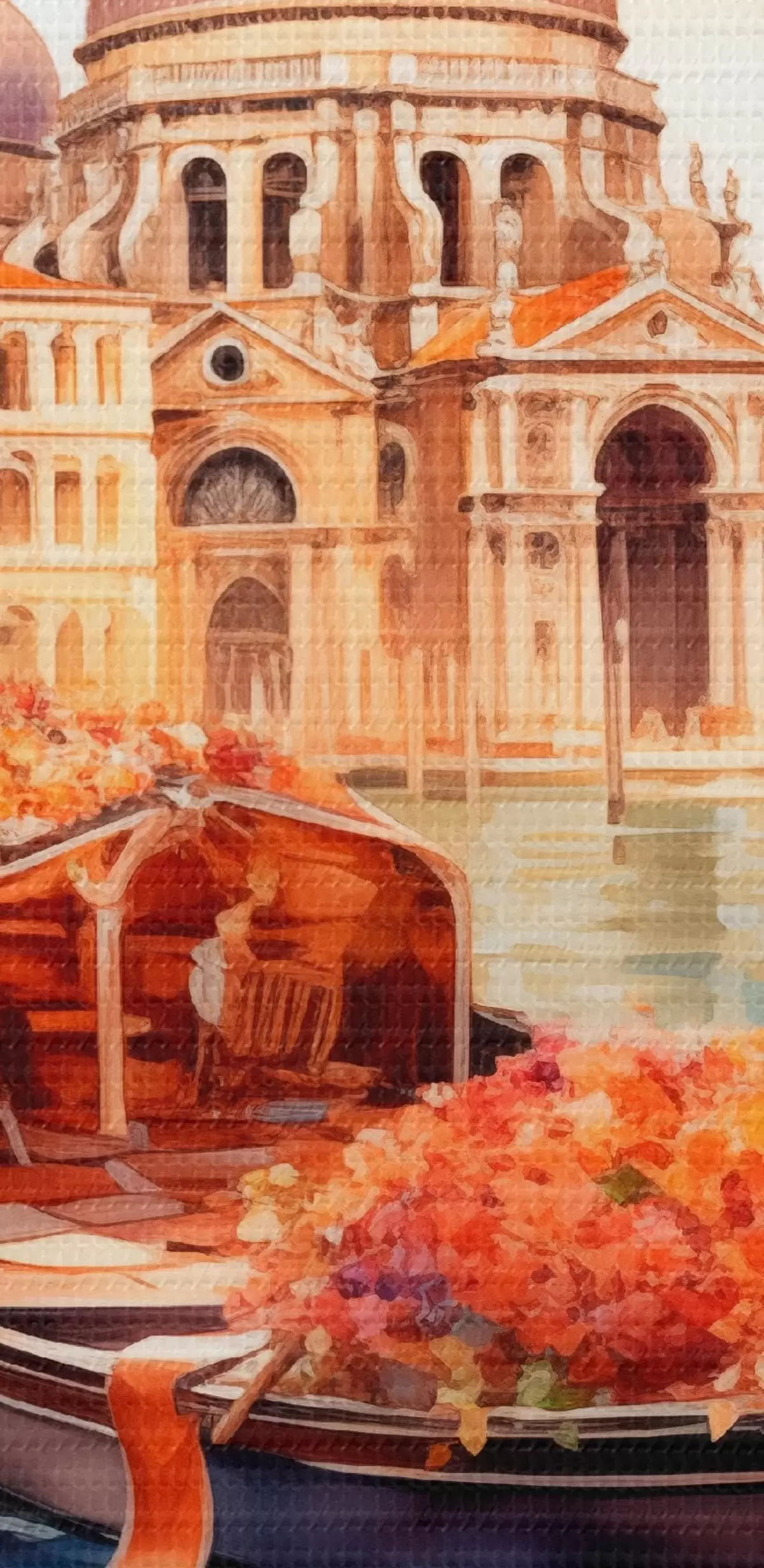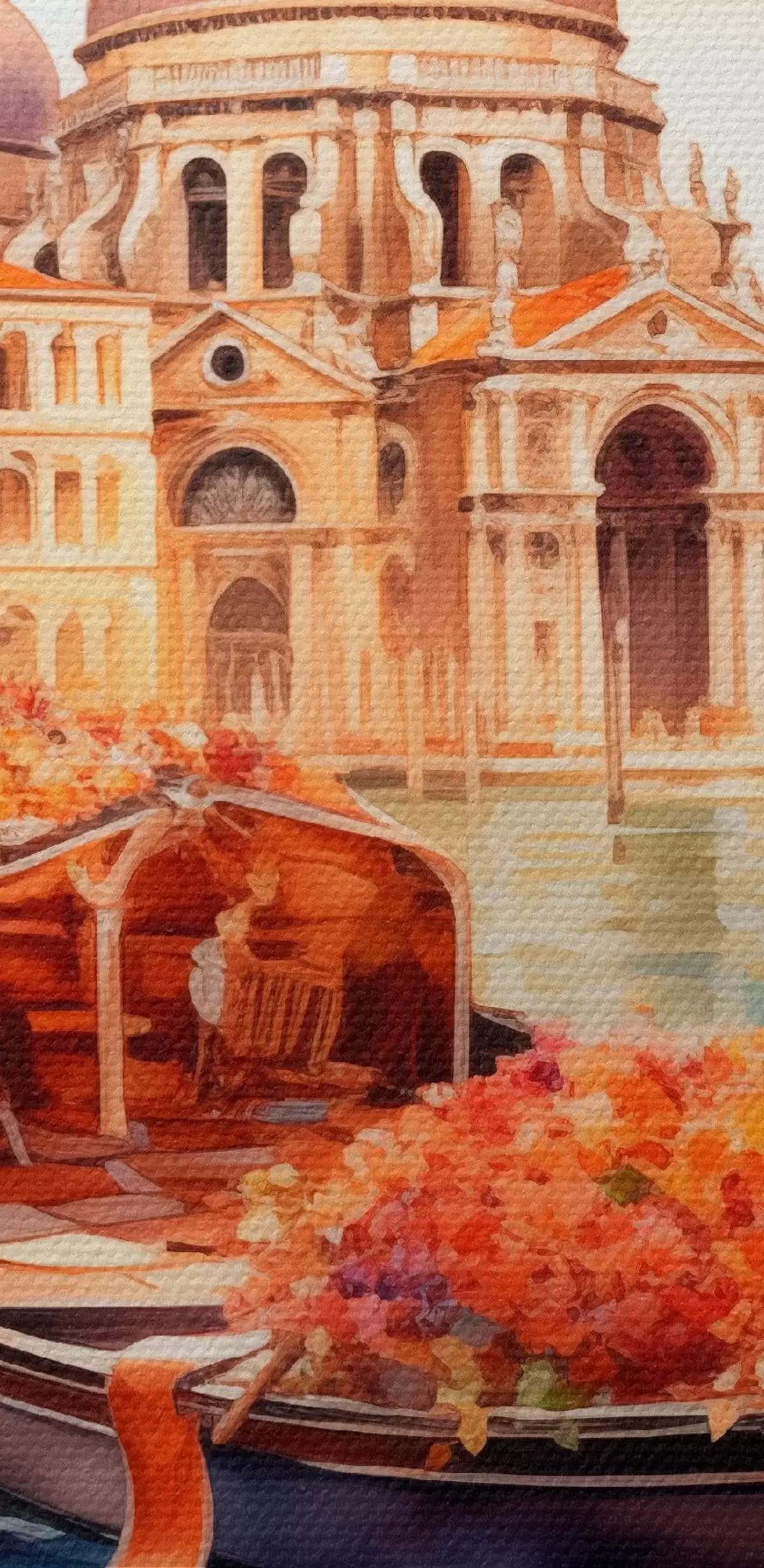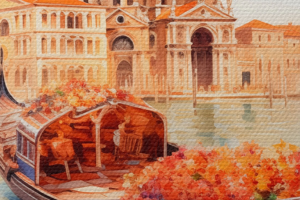 Image Vue automnale de Venise avec une gondole entourée de feuilles orange et rouge vif, avec les reflets des bâtiments dans l'eau calme du canal Nr r42576