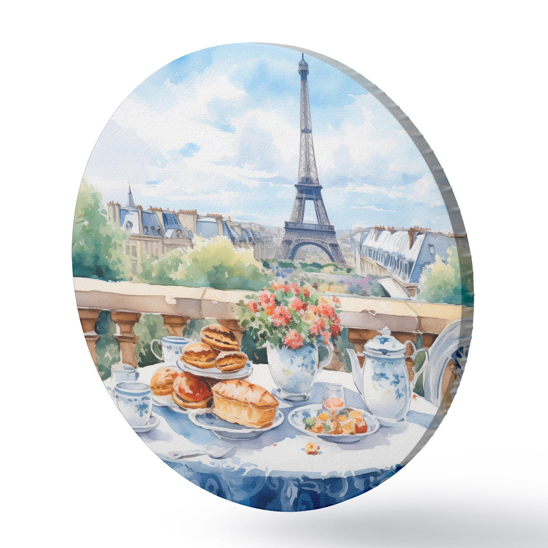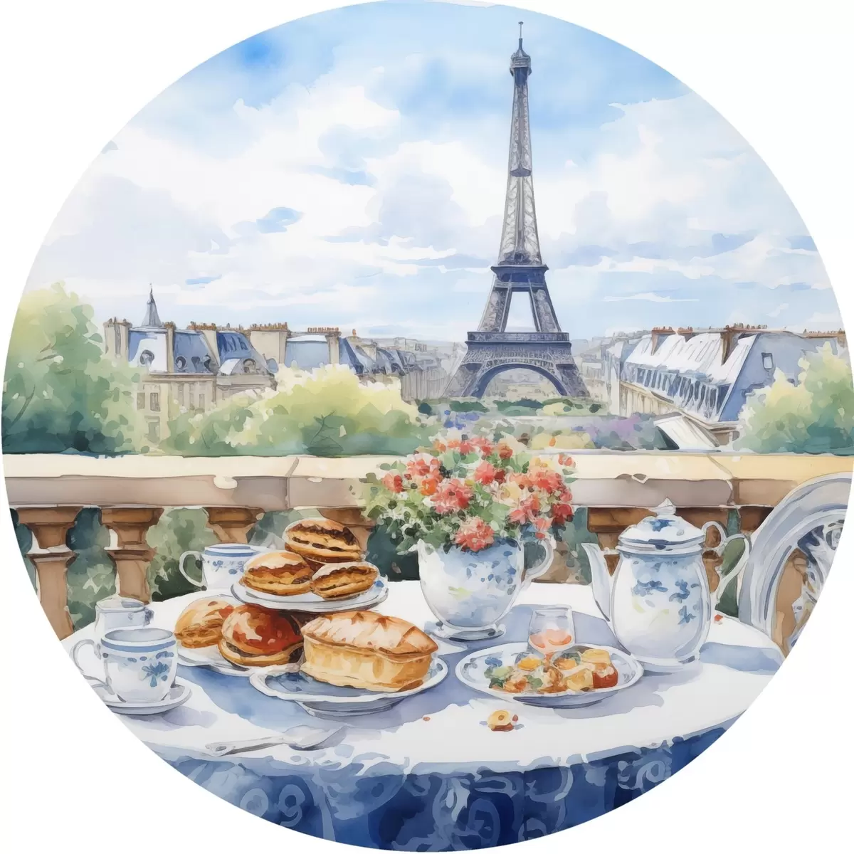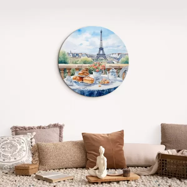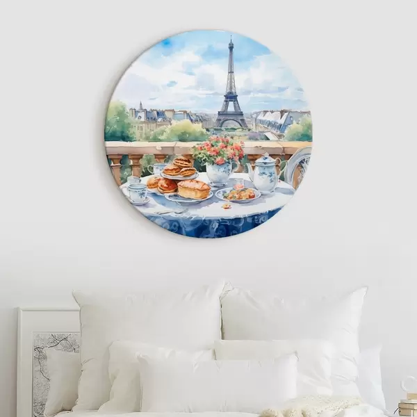 Tableaux ronds Une vue romantique de la Tour Eiffel depuis un balcon avec une table garnie de desserts, de thé et de fleurs dans une ambiance estivale r42579