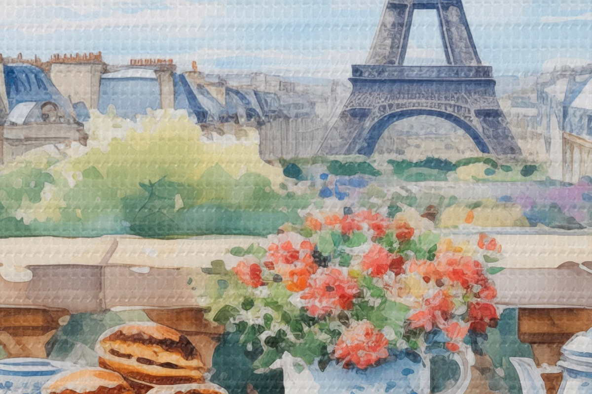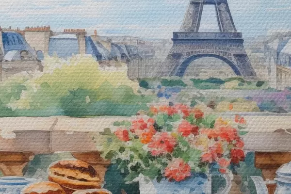 Image Une vue romantique de la Tour Eiffel depuis un balcon avec une table garnie de desserts, de thé et de fleurs dans une ambiance estivale Nr r42579