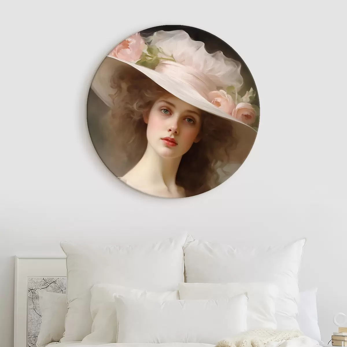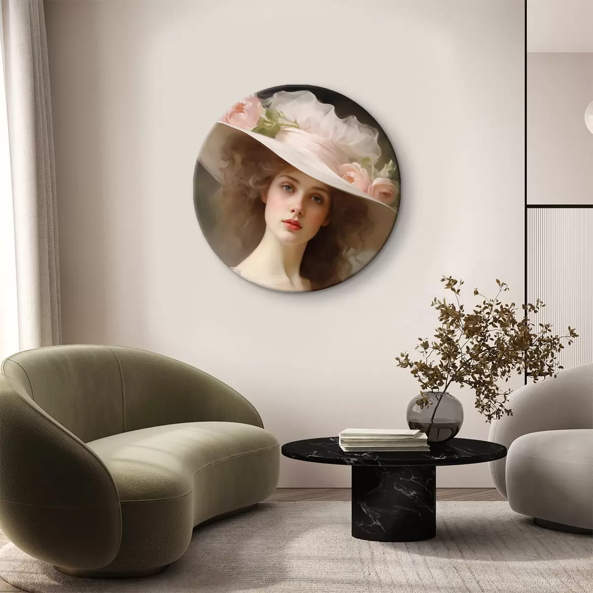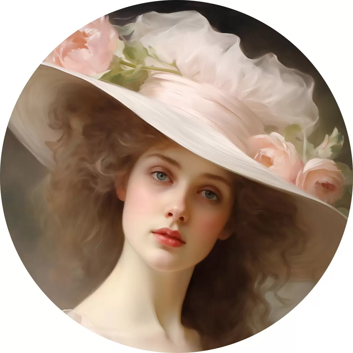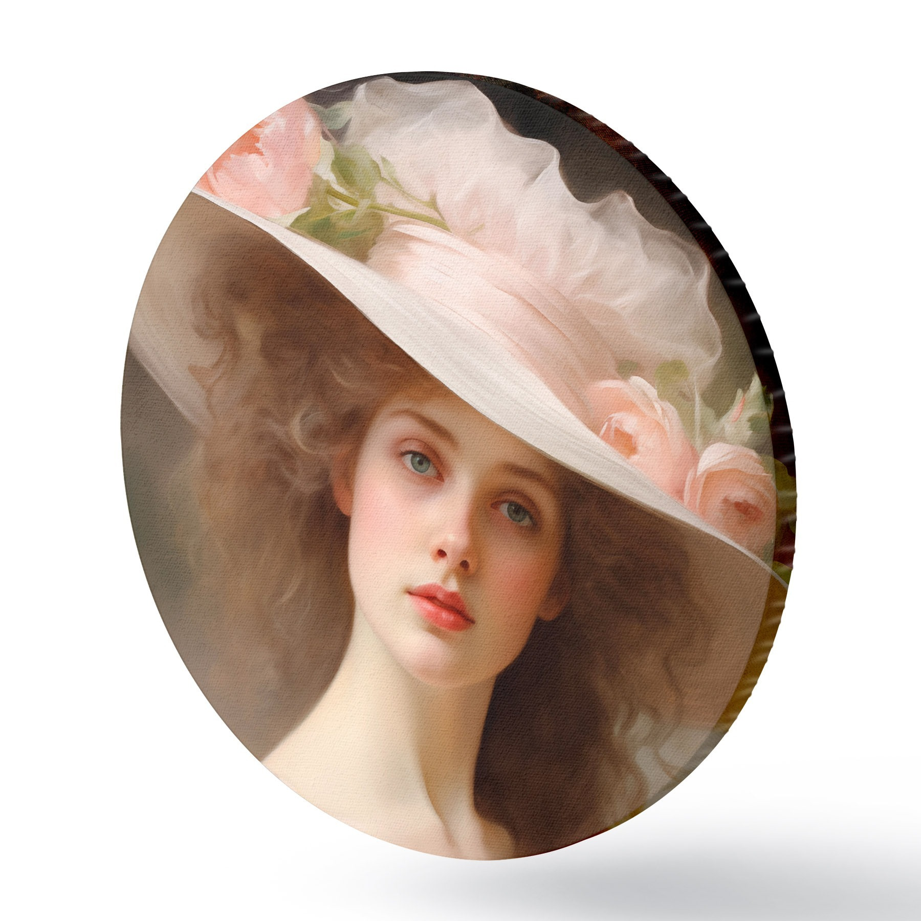 Tableaux ronds Portrait d'une jeune femme vêtue d'une délicate robe rose et d'un chapeau orné de fleurs, à l'expression romantique et raffinée. r42581