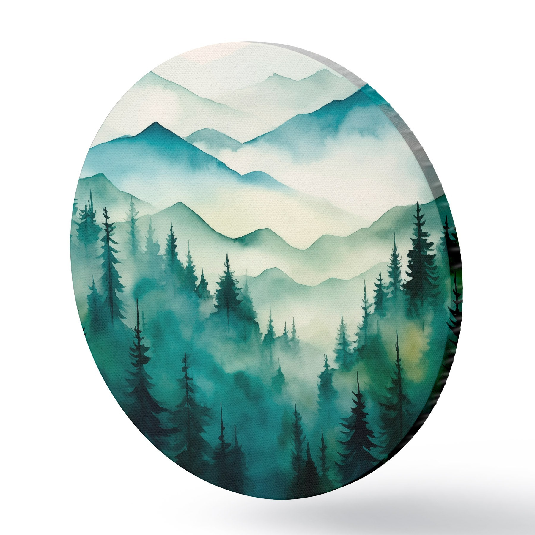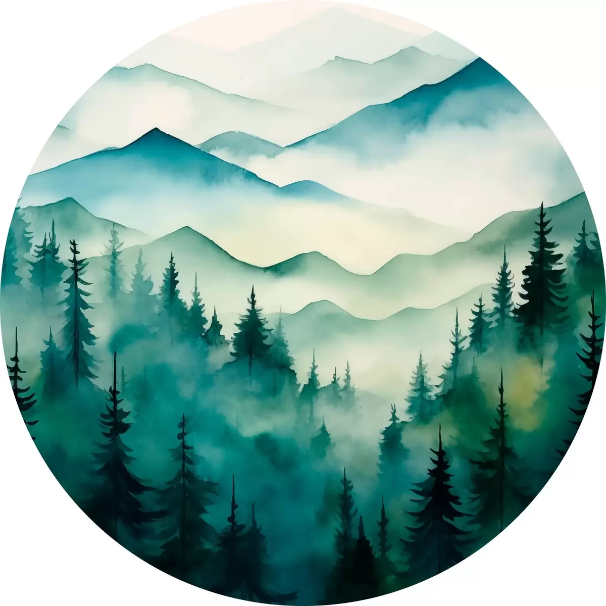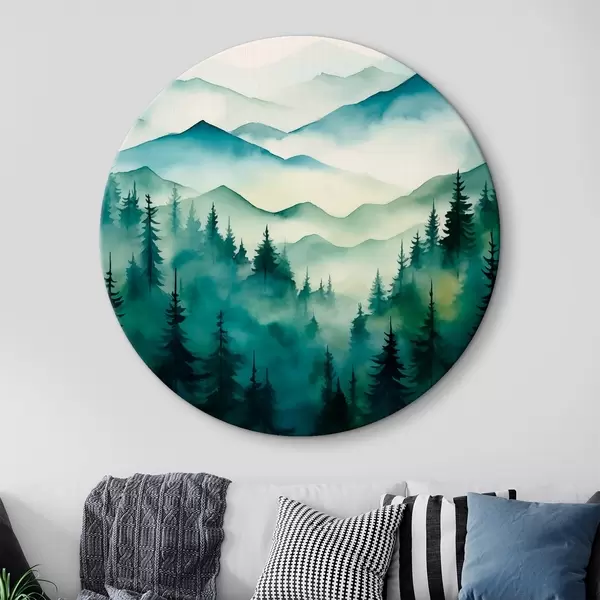 Tableaux ronds Paysage brumeux avec montagnes et forêt r42662