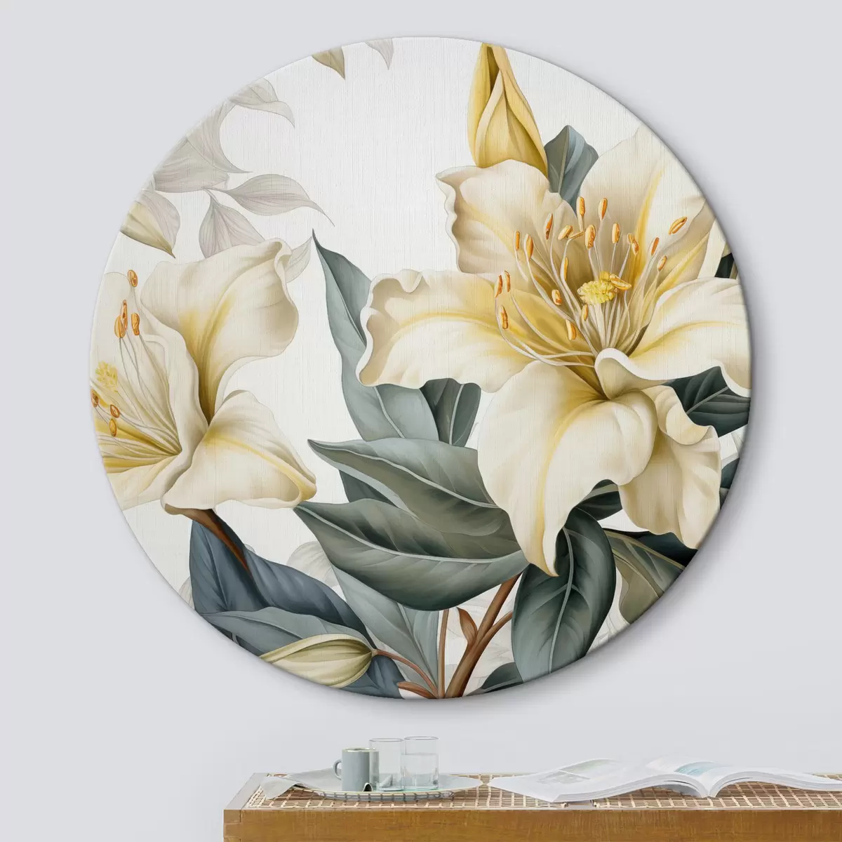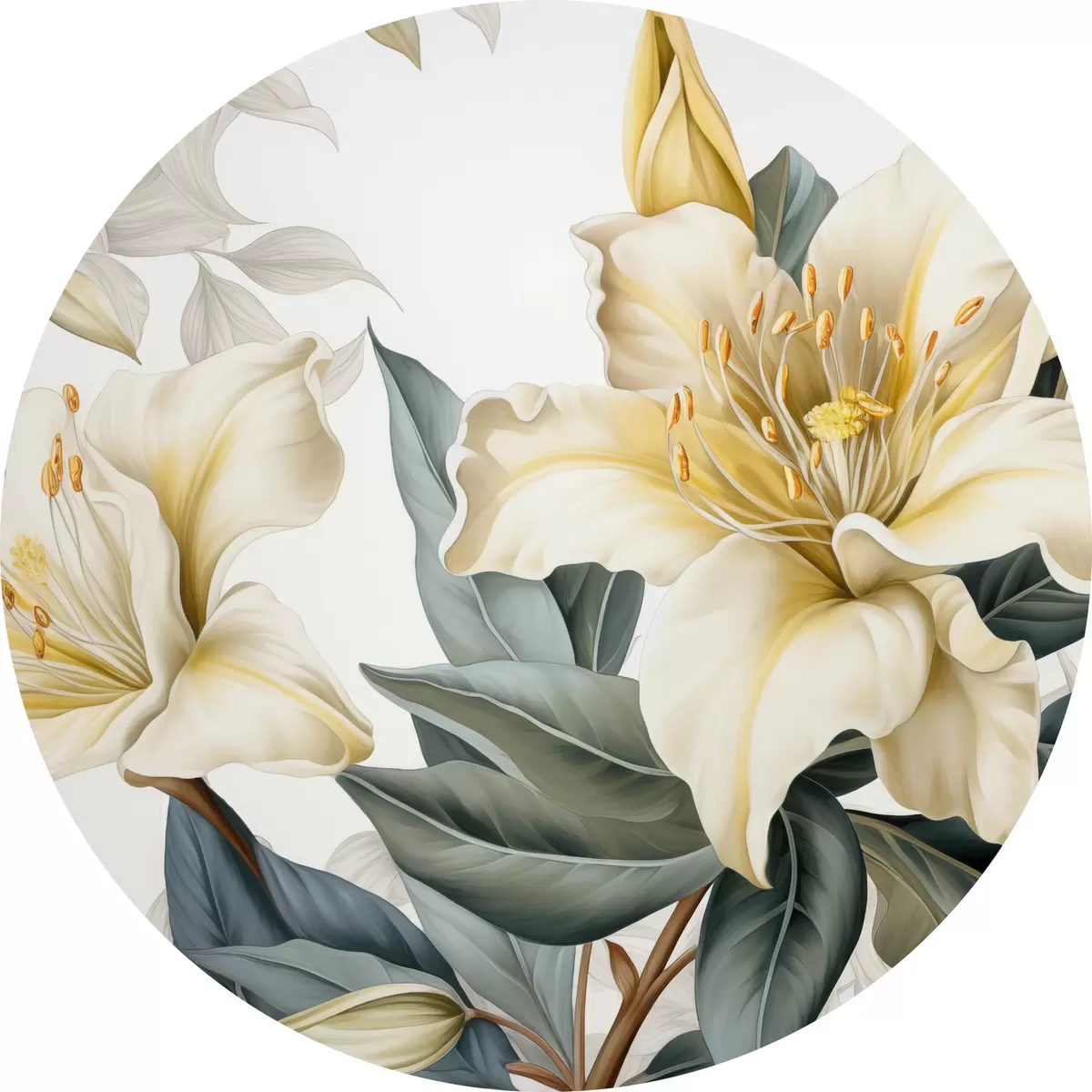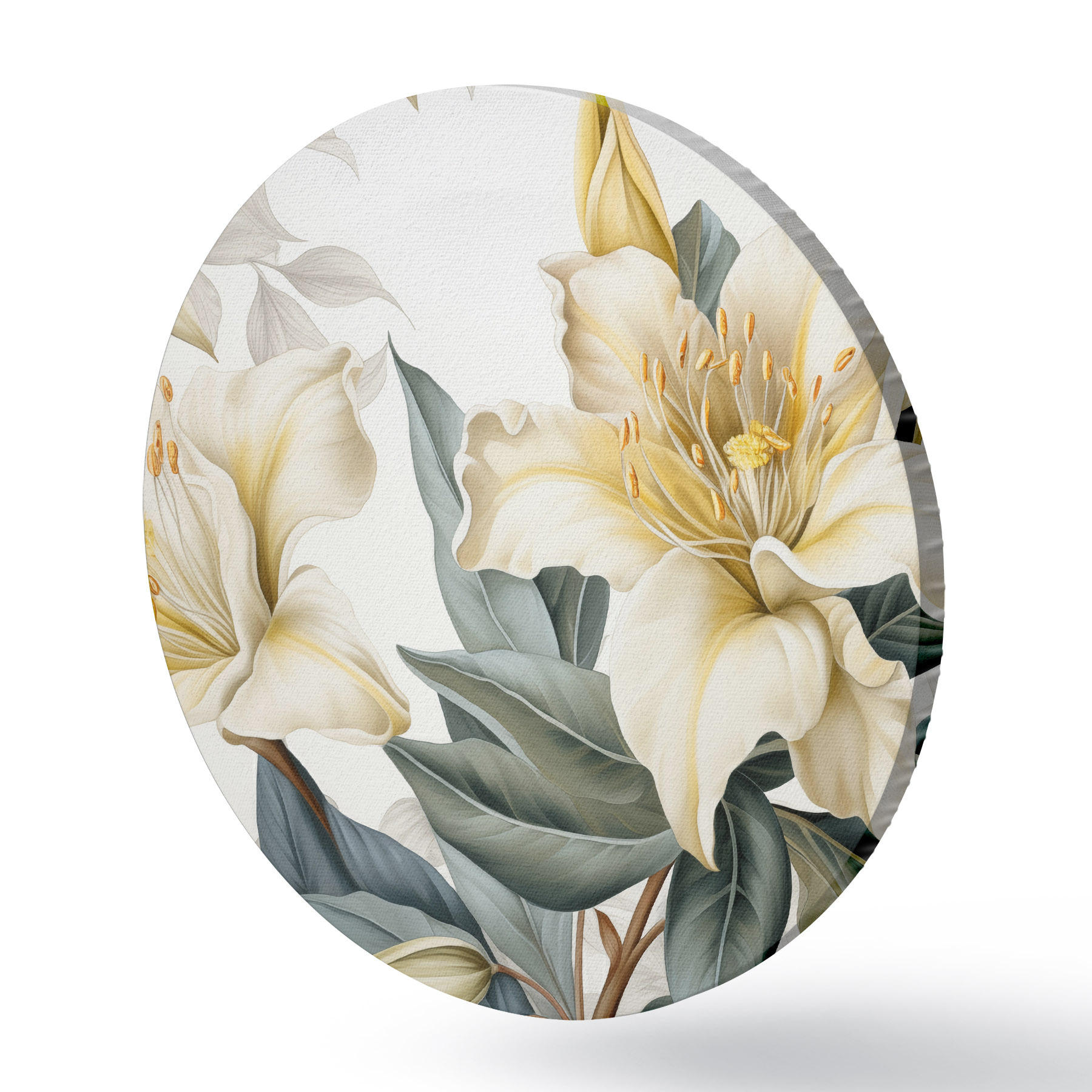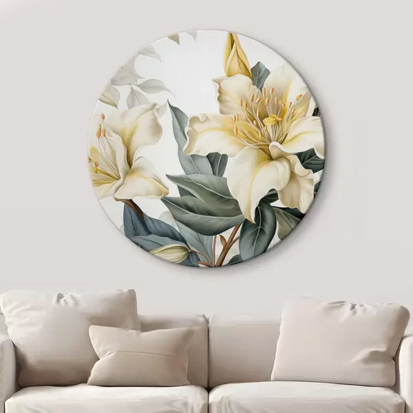 Tableaux ronds Illustration botanique de fleurs blanches et jaunes pâles aux pétales complexes, entourées de feuilles vertes r42712