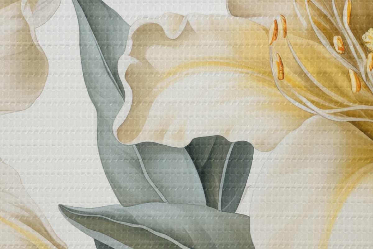 Image Illustration botanique de fleurs blanches et jaunes pâles aux pétales complexes, entourées de feuilles vertes Nr r42712