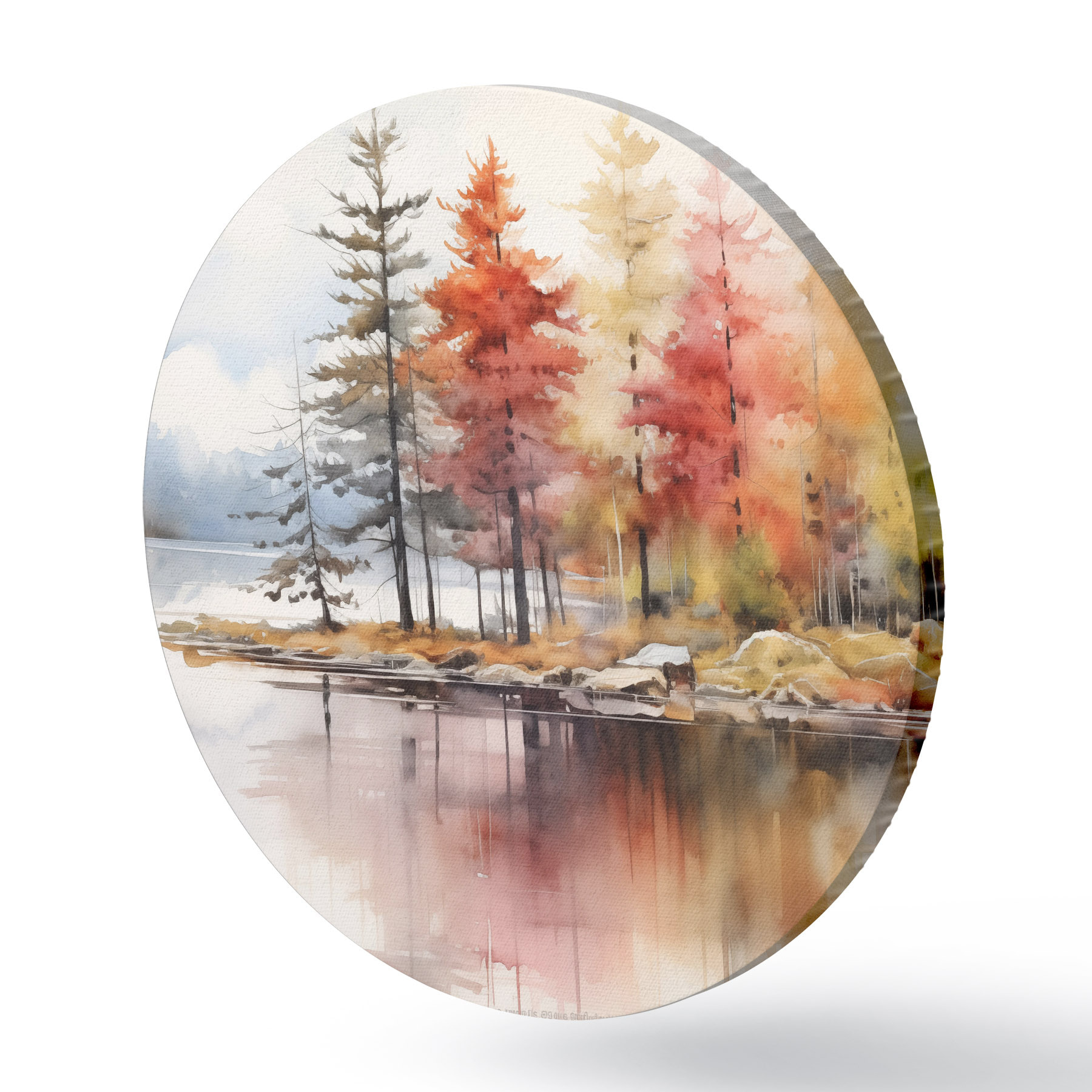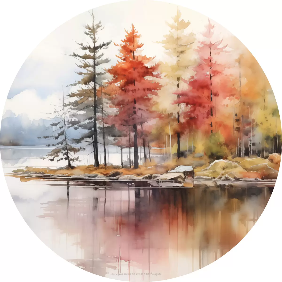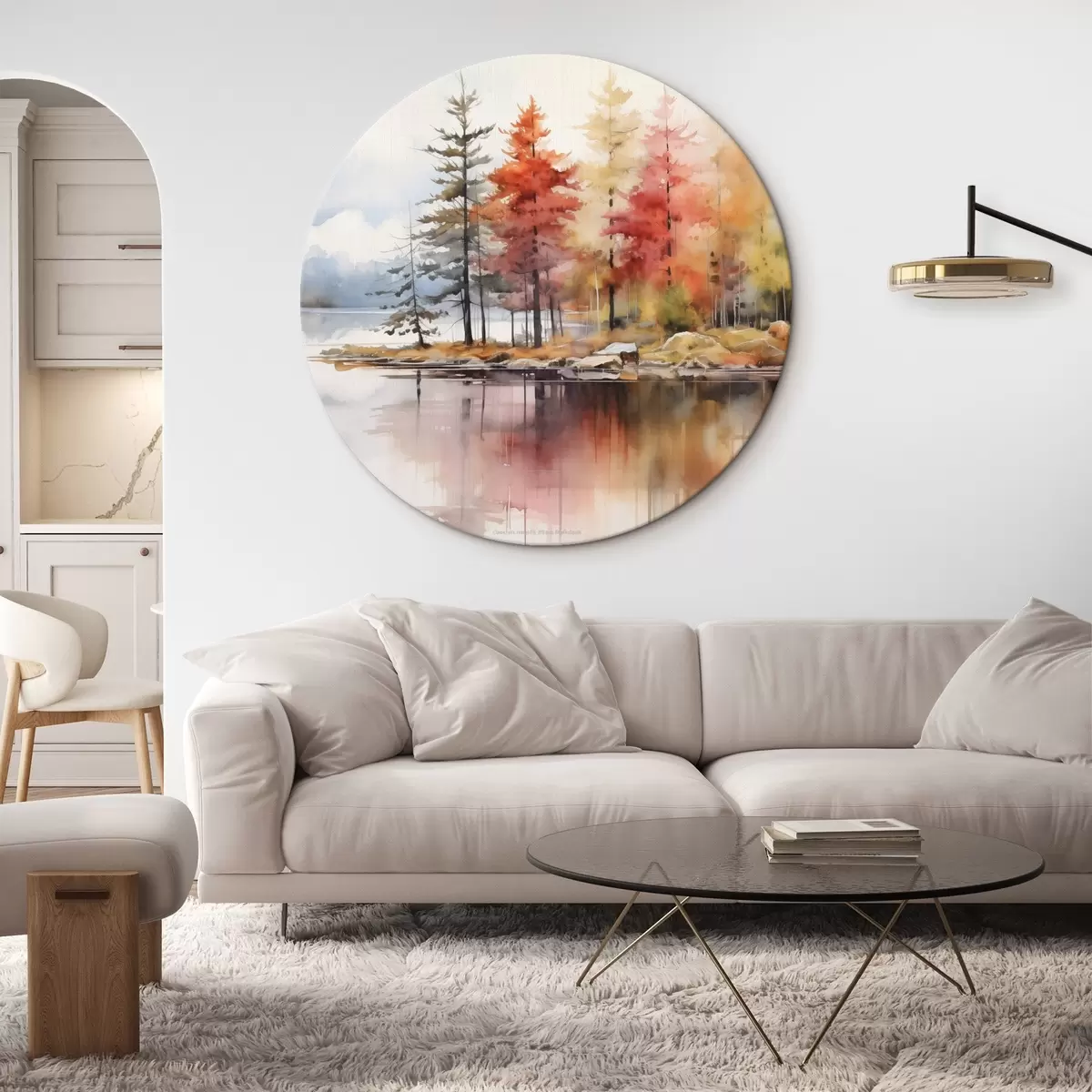 Tableaux ronds Paysage de type aquarelle avec un lac entouré d'arbres aux couleurs d'automne éclatantes r42727