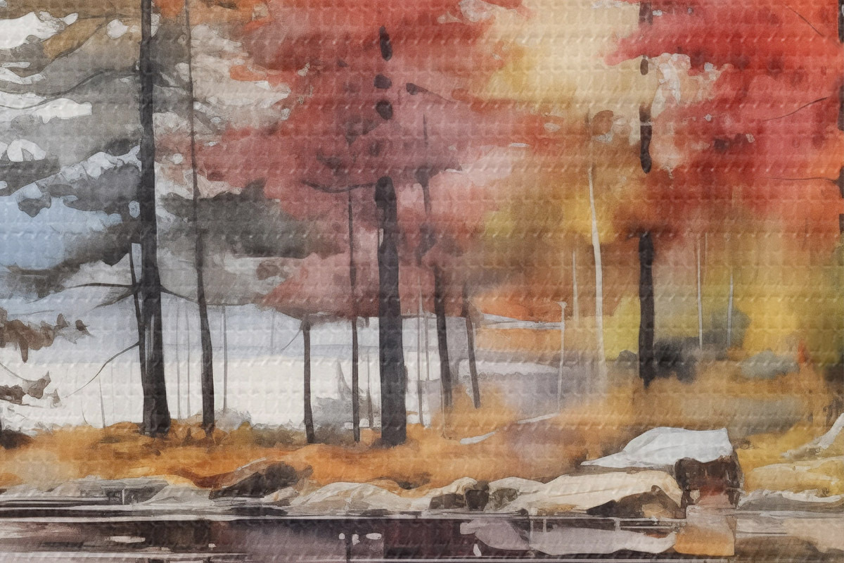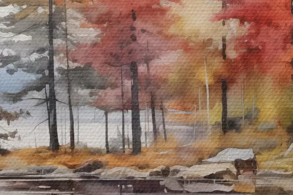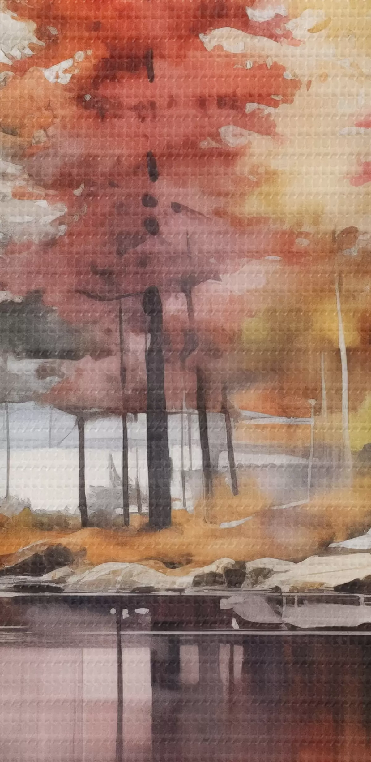 Image Paysage de type aquarelle avec un lac entouré d'arbres aux couleurs d'automne éclatantes Nr r42727