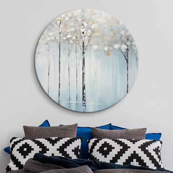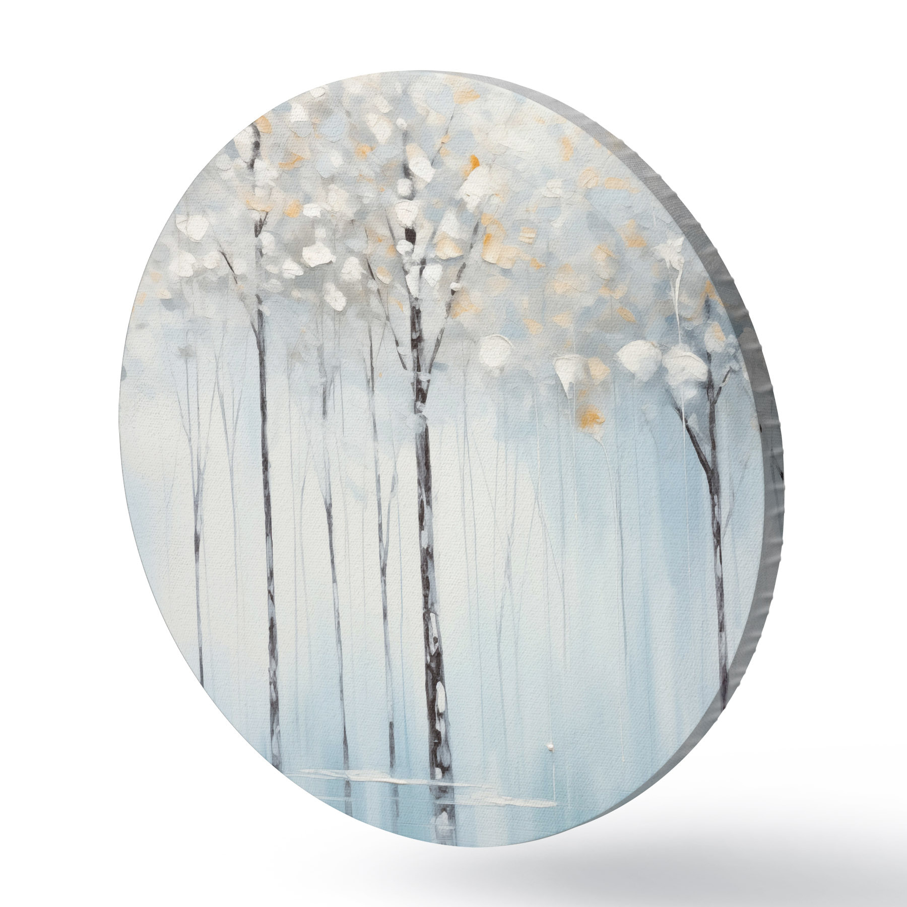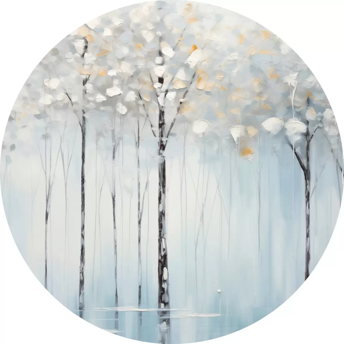 Tableaux ronds Grands arbres élancés avec des feuilles bleues et des touches de jaune sur un fond bleu tendre, imitation peinture à l'huile r42731