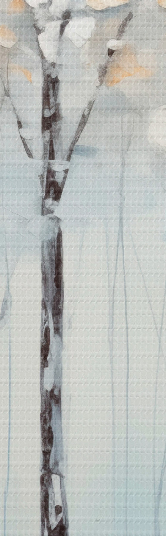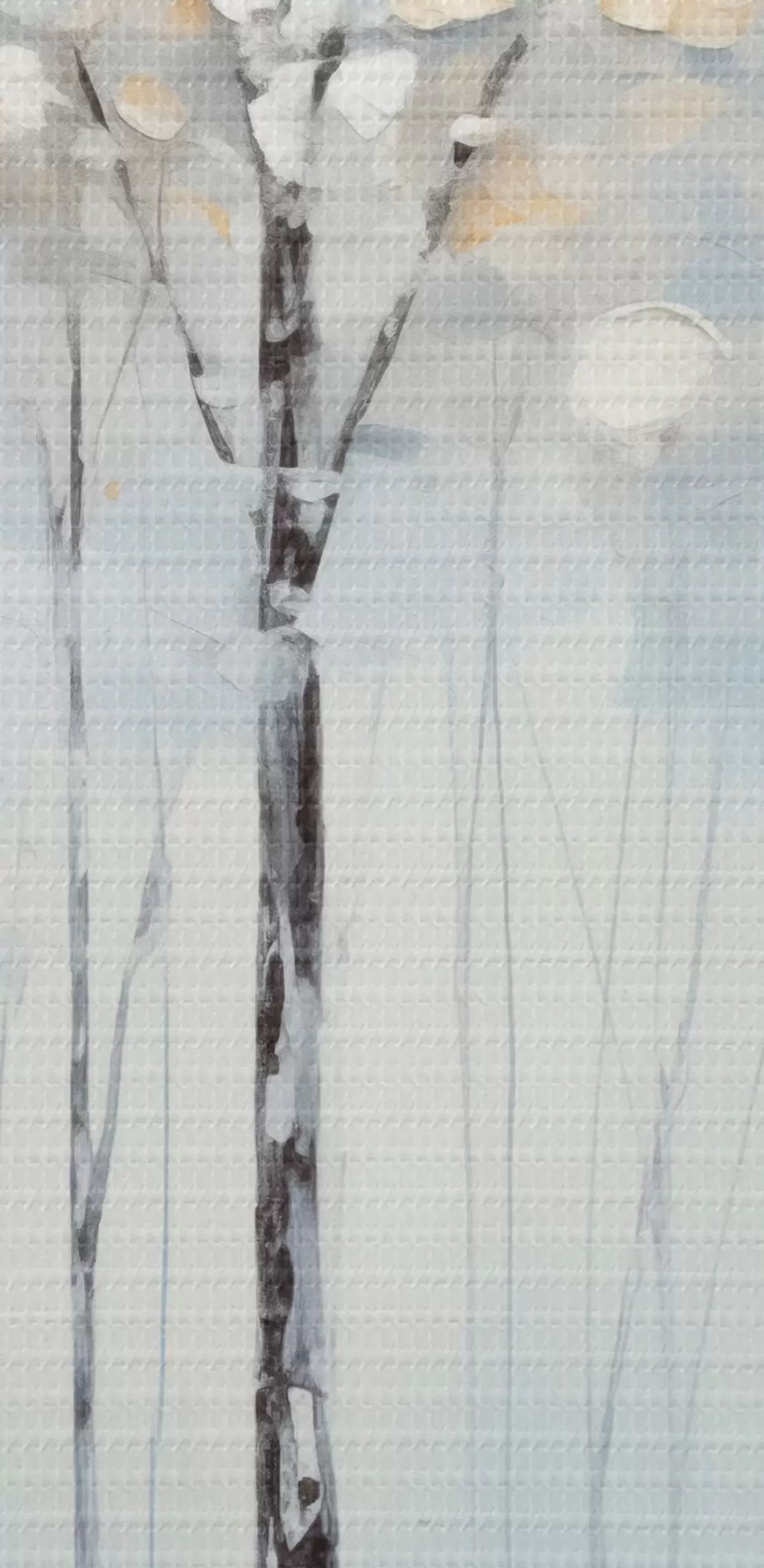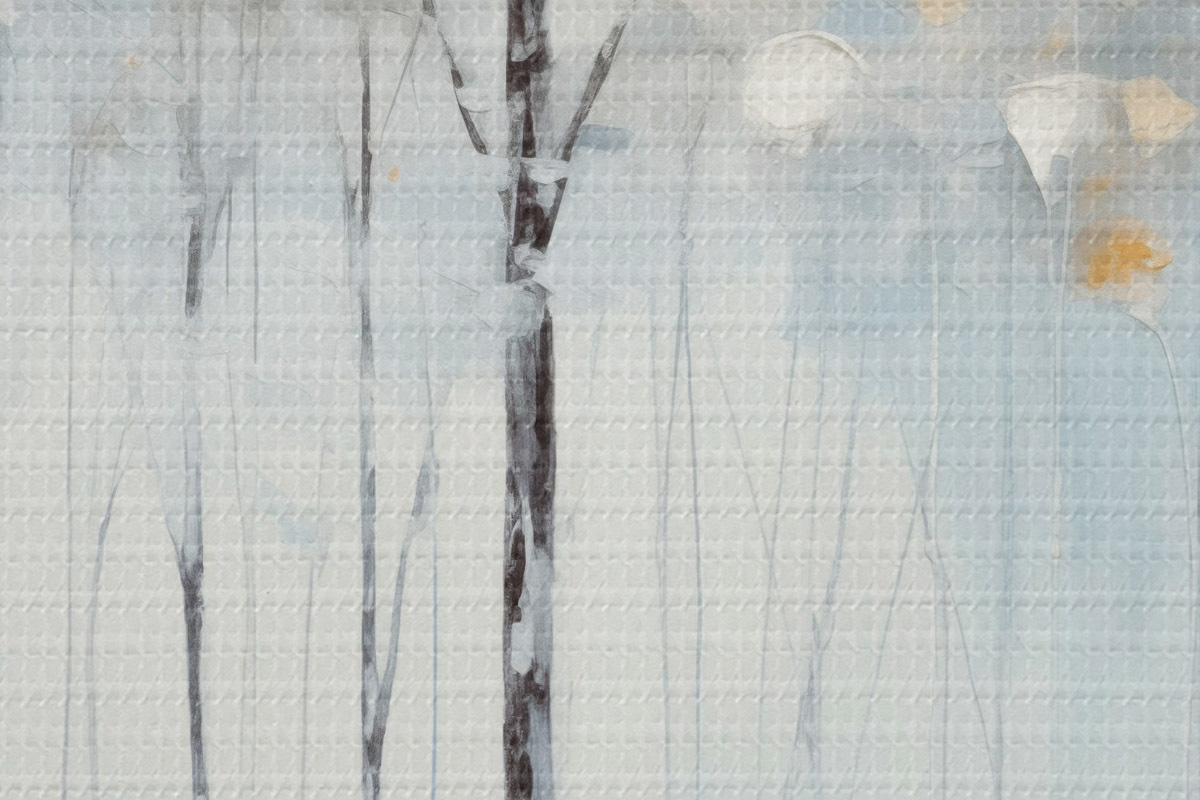 Image Grands arbres élancés avec des feuilles bleues et des touches de jaune sur un fond bleu tendre, imitation peinture à l'huile Nr r42731