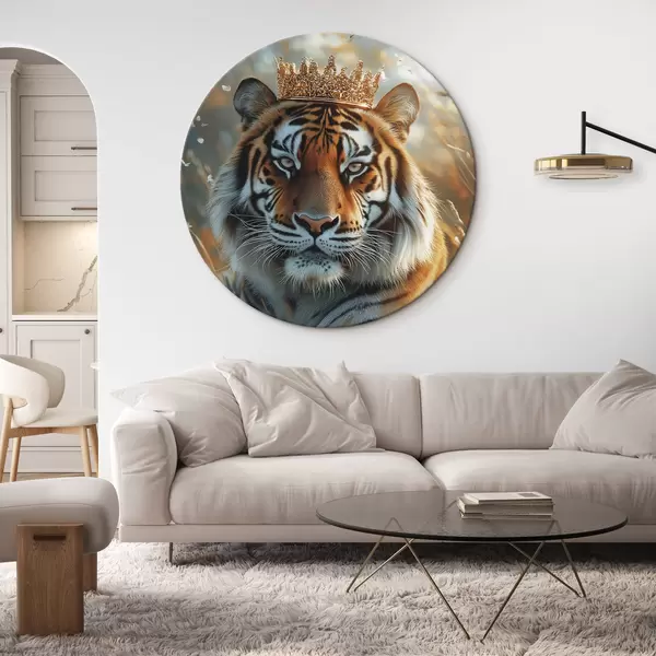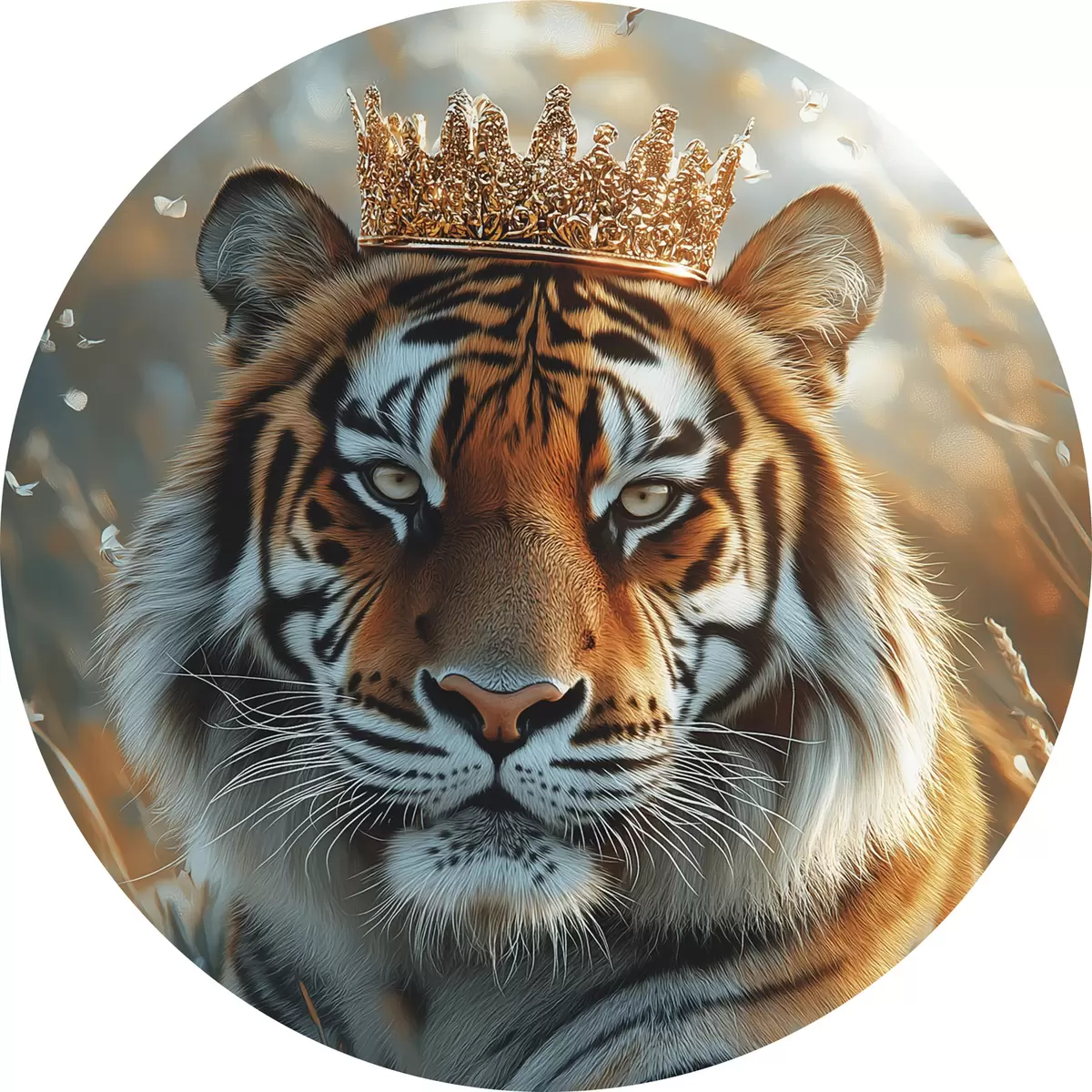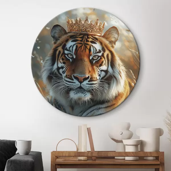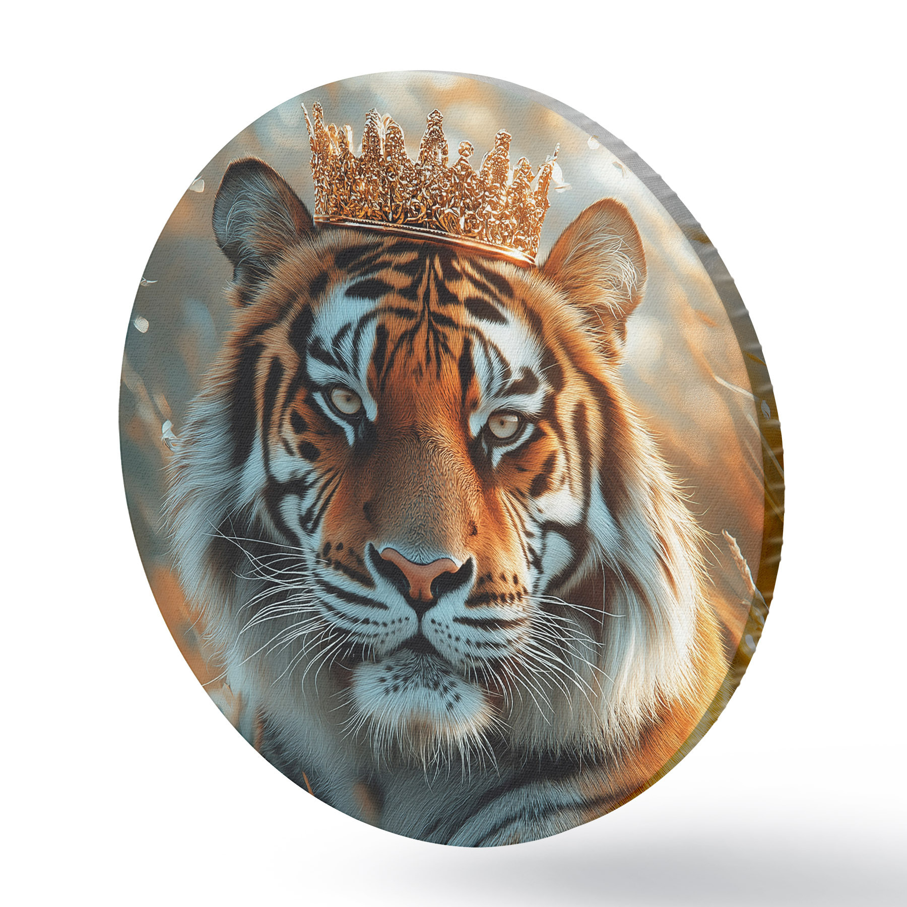 Tableaux ronds Beau tigre avec une couronne, prairie estivale, réalisme r42786