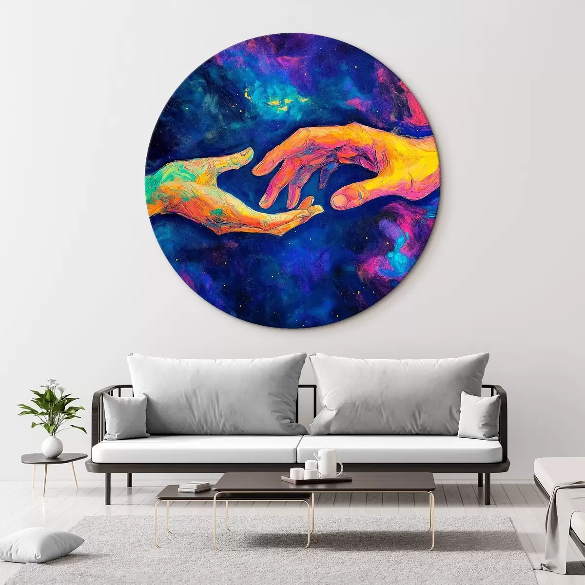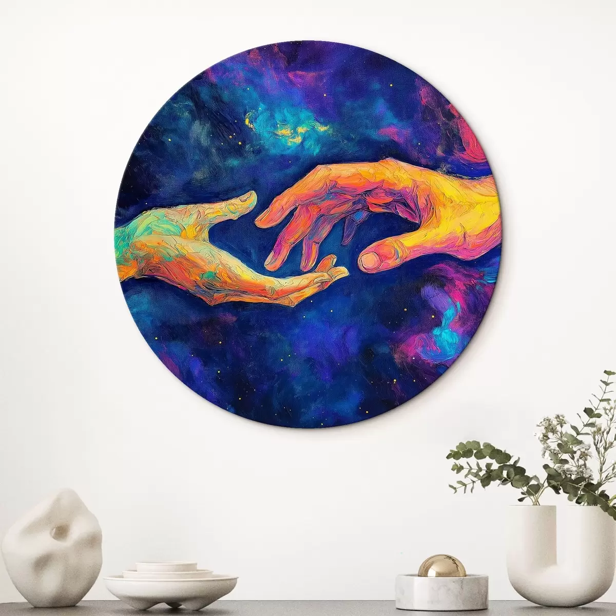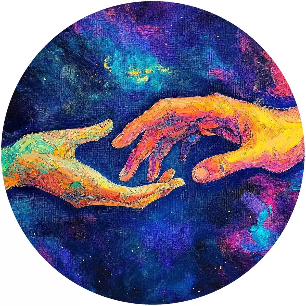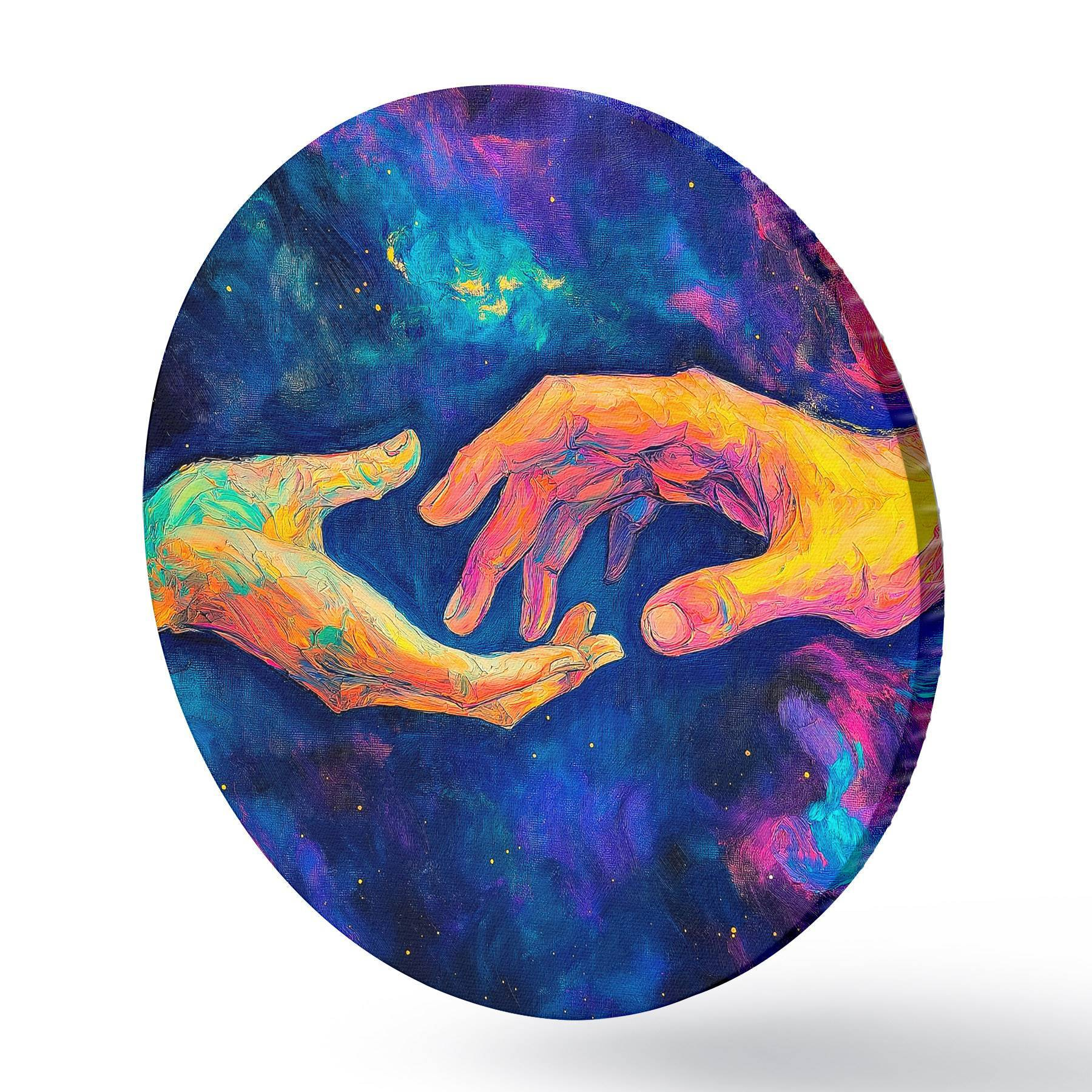 Tableaux ronds Composition abstraite de deux mains qui se tendent l'une vers l'autre, dans une palette de couleurs vibrantes sur un fond cosmique r42937