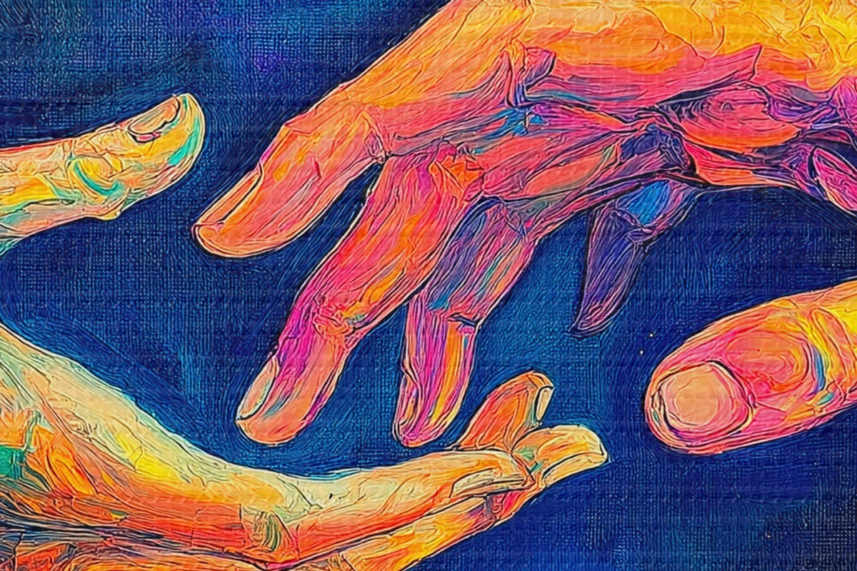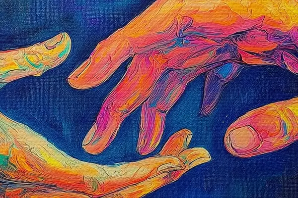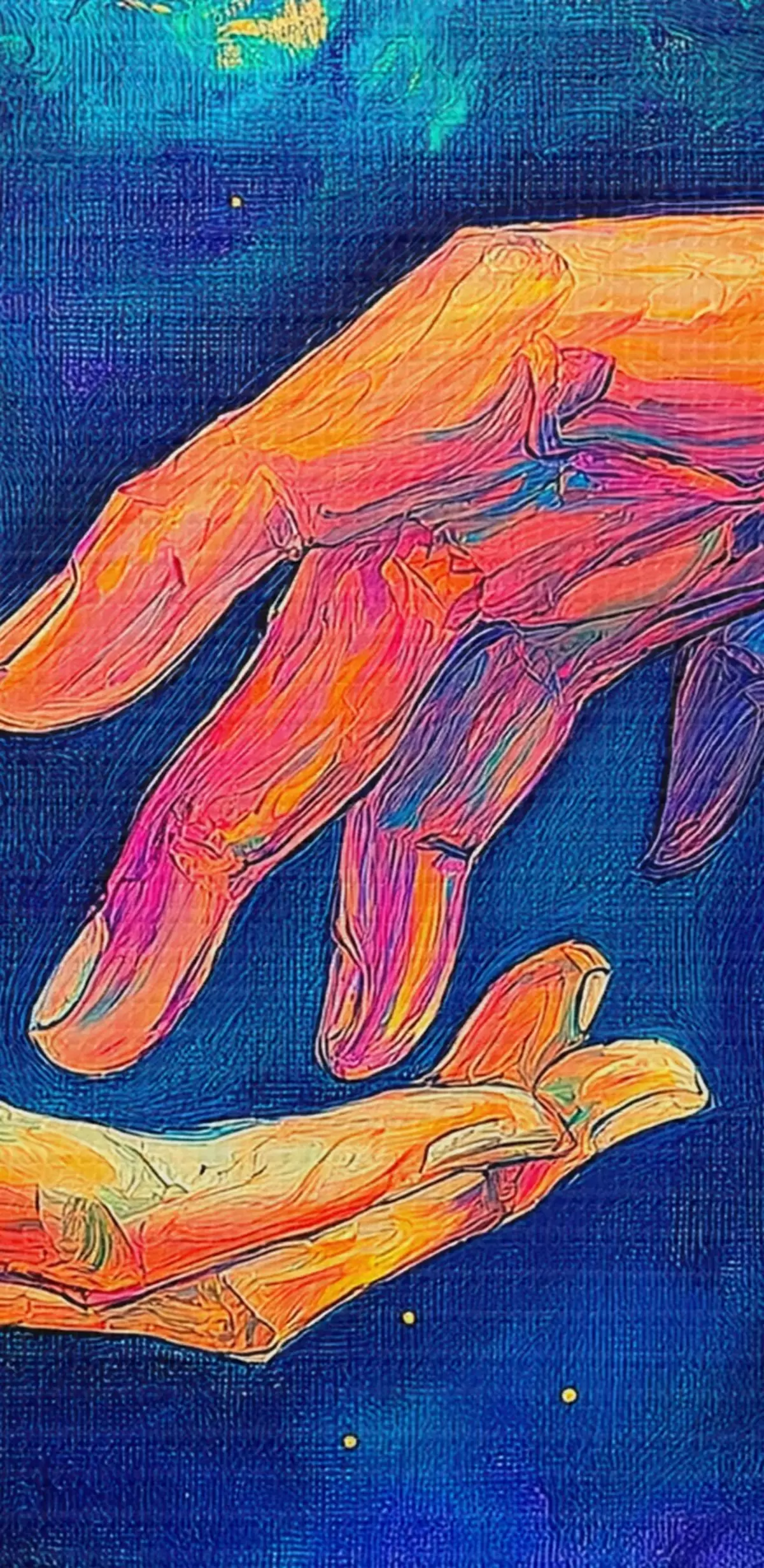 Image Composition abstraite de deux mains qui se tendent l'une vers l'autre, dans une palette de couleurs vibrantes sur un fond cosmique Nr r42937