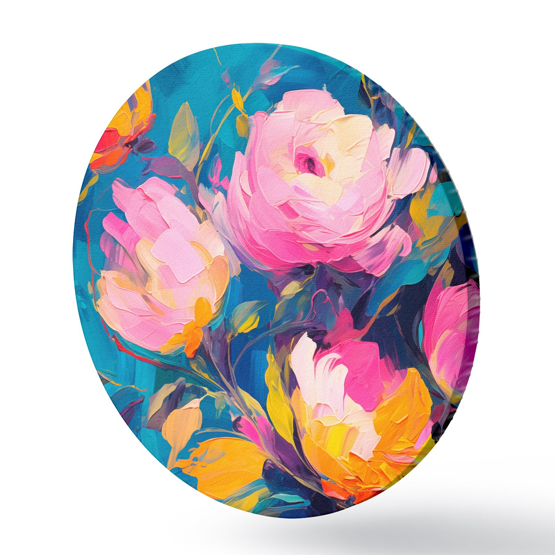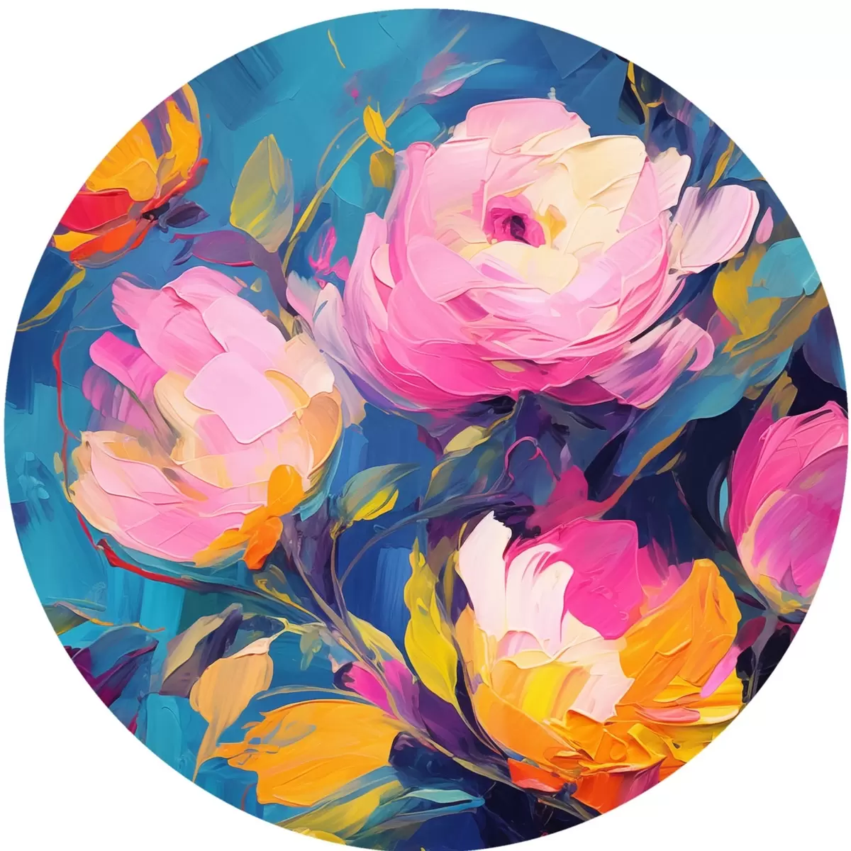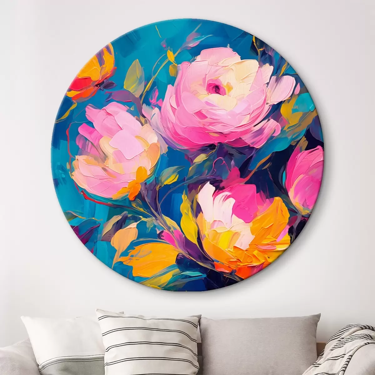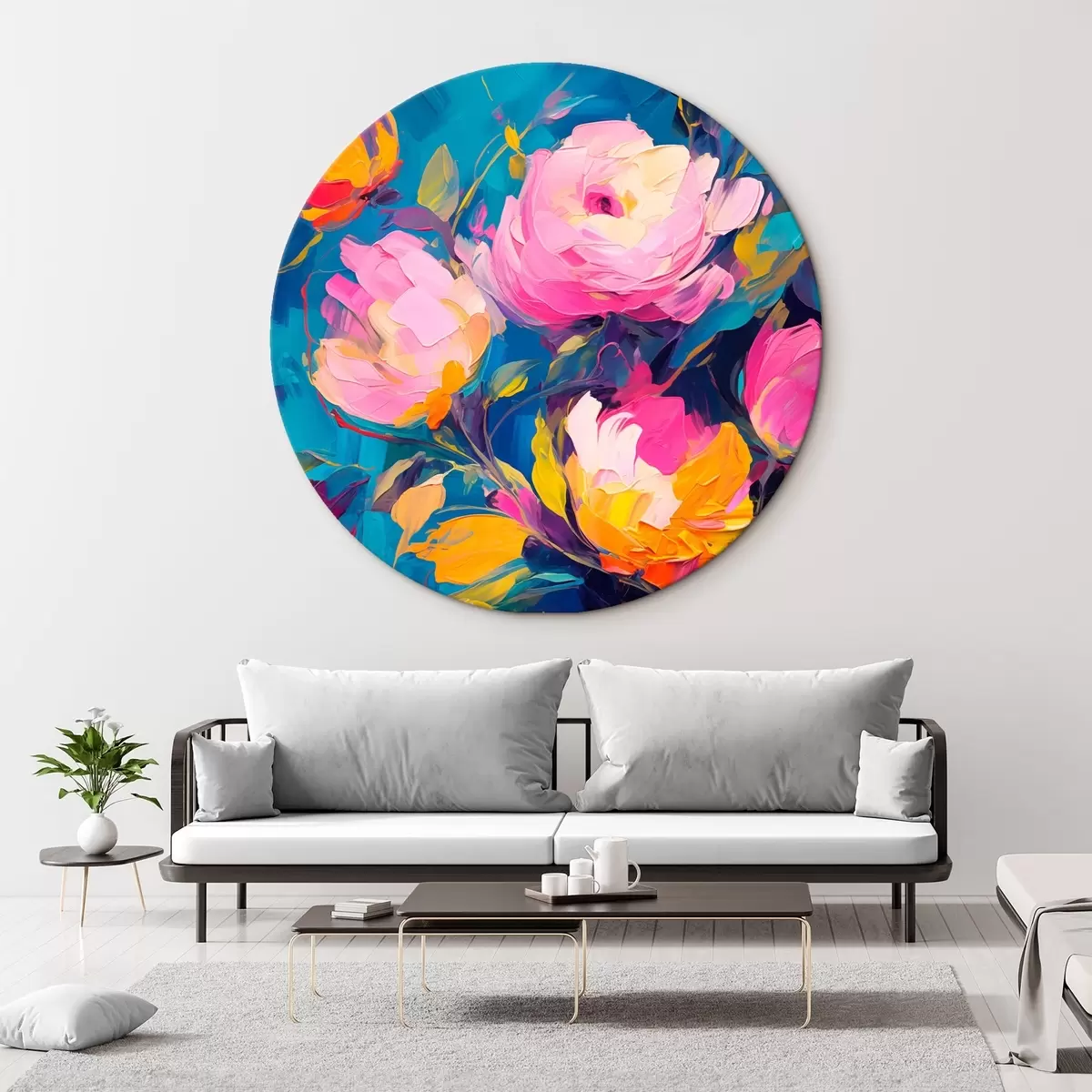 Tableaux ronds Peinture abstraite avec des fleurs vibrantes sur fond bleu r42941