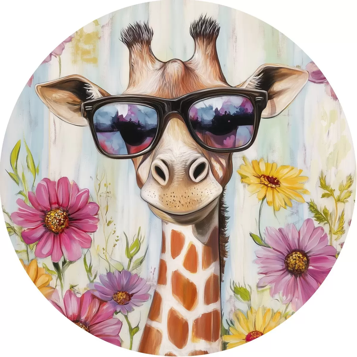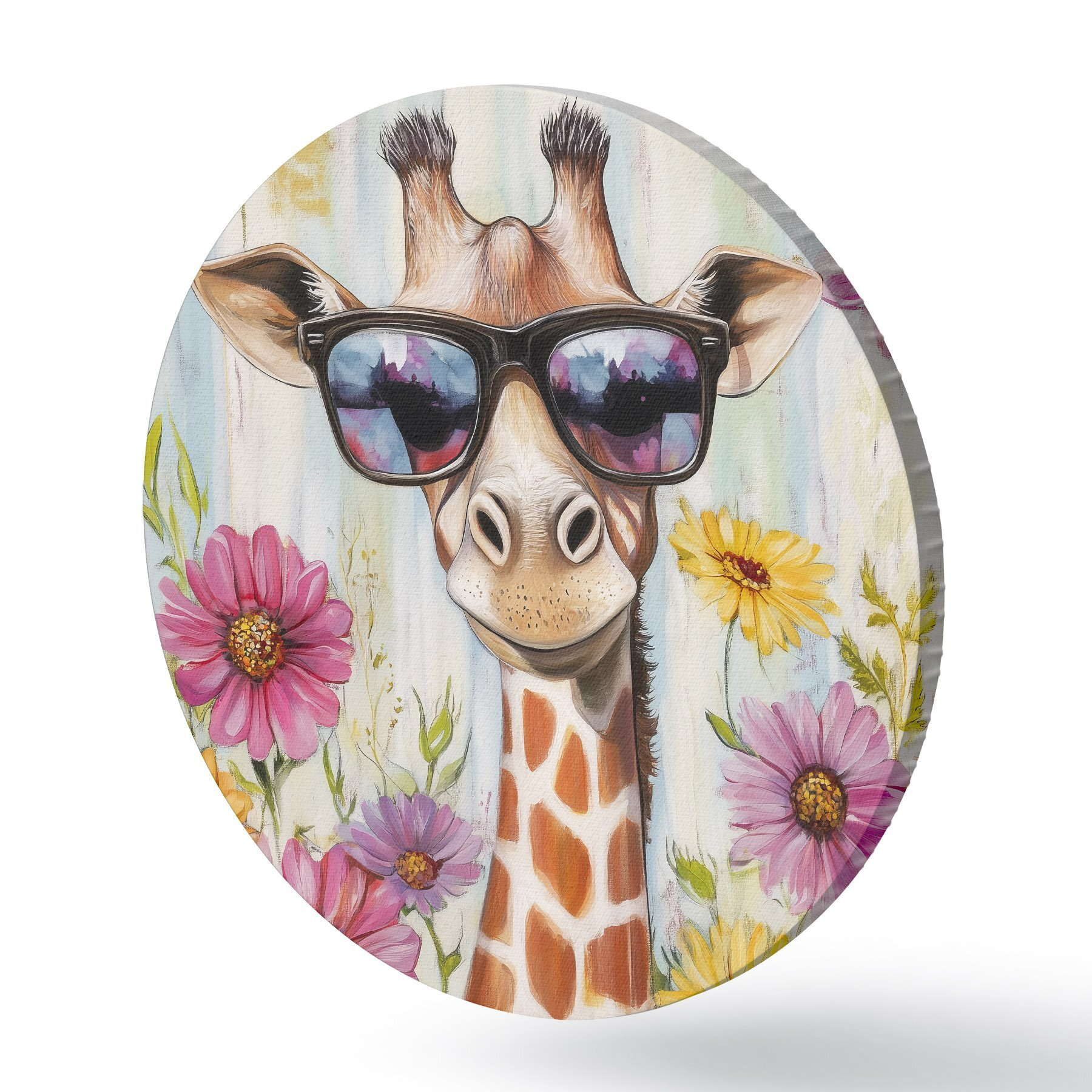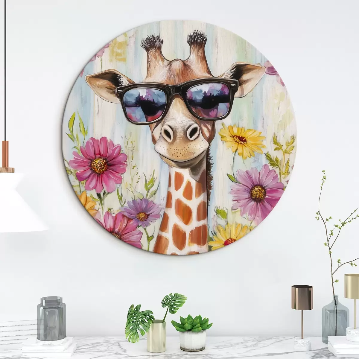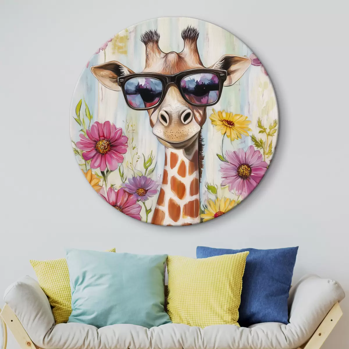 Tableaux ronds Girafe avec lunettes près de fleurs r42991