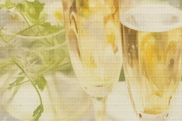 Image Verres à champagne avec fraises sur le plateau, fleurs de camomille, été Nr r43054