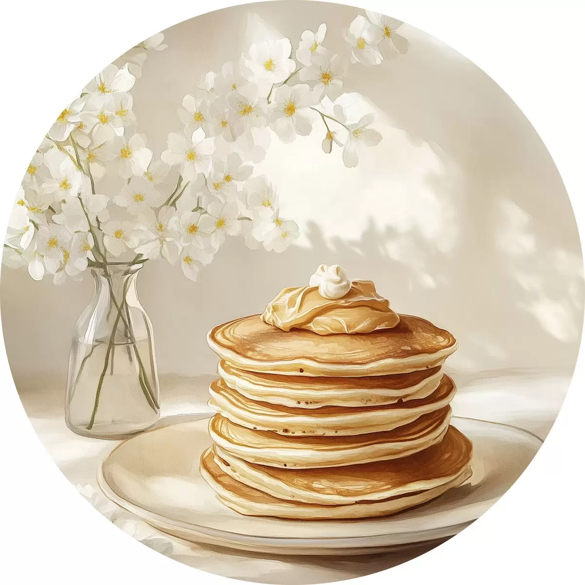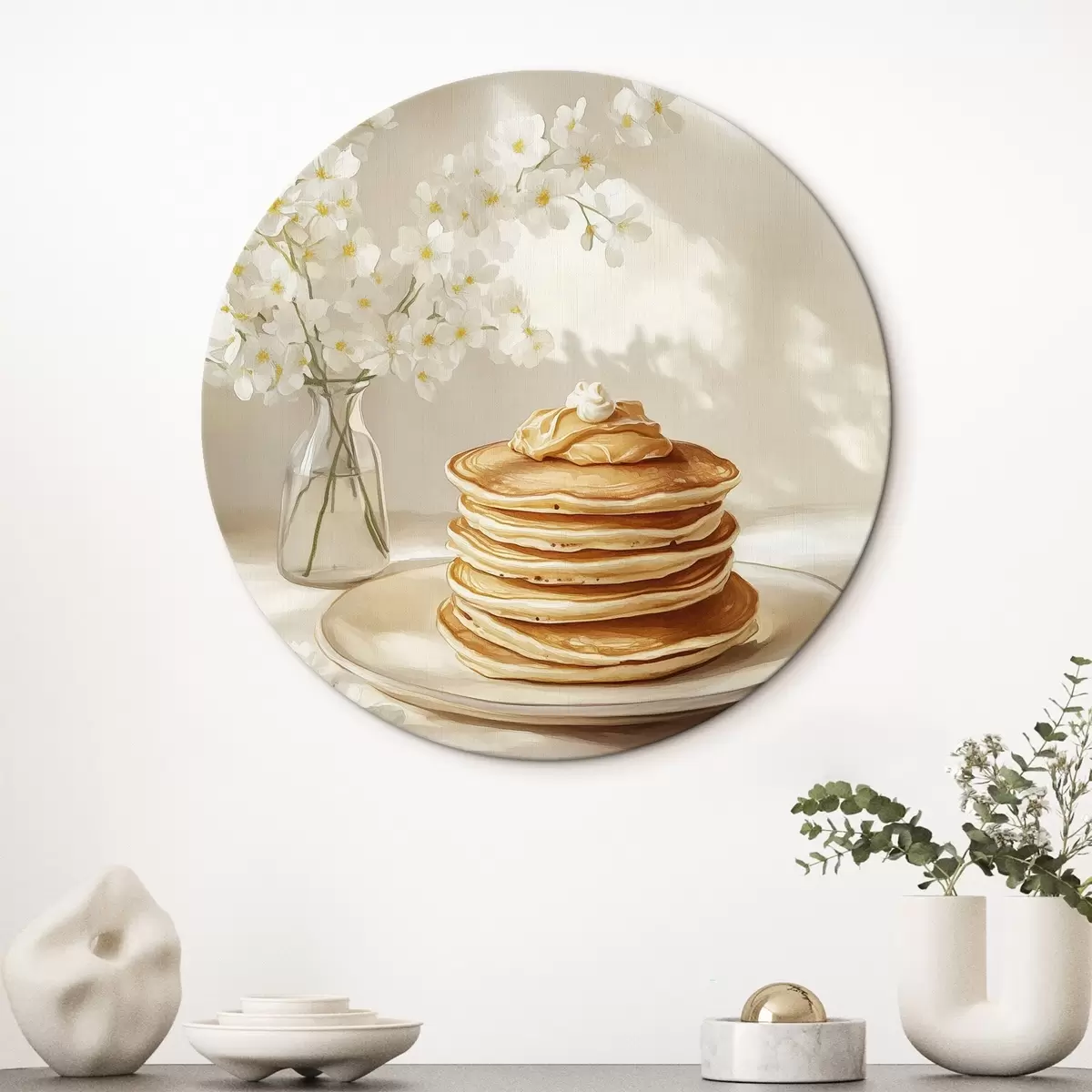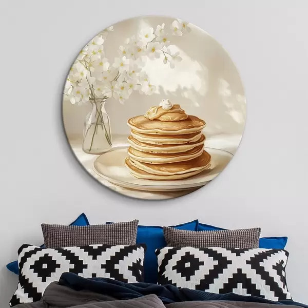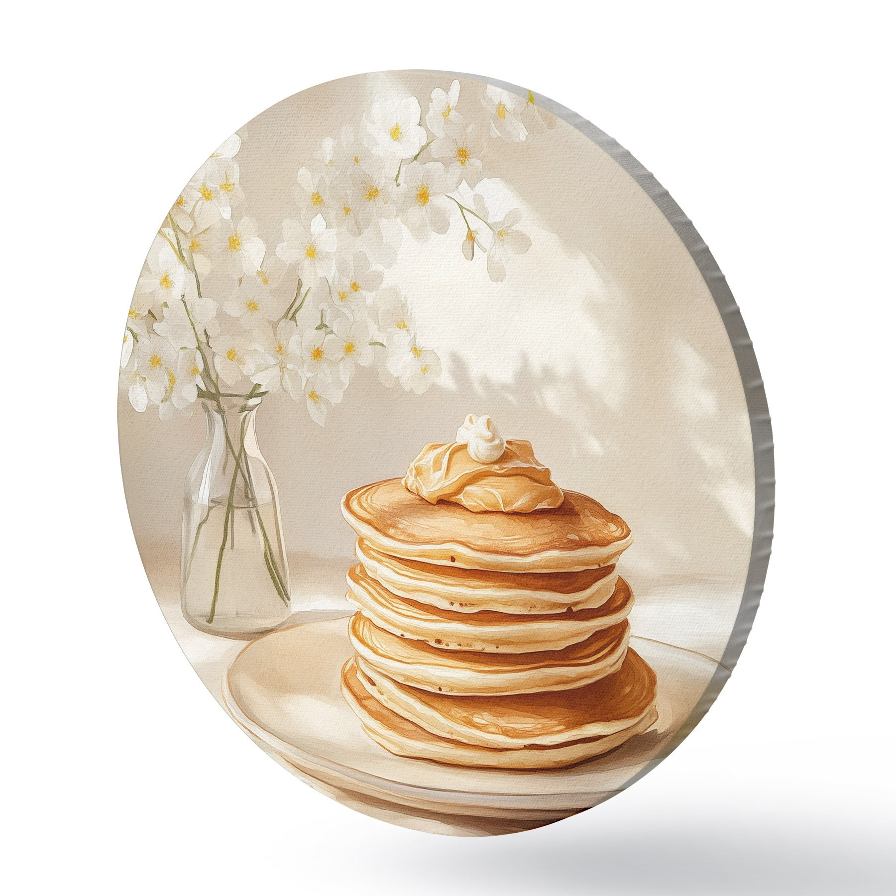Tableaux ronds Délicieuses crêpes au beurre de cacahuètes, style aquarelle, vase avec fleurs blanches r43063