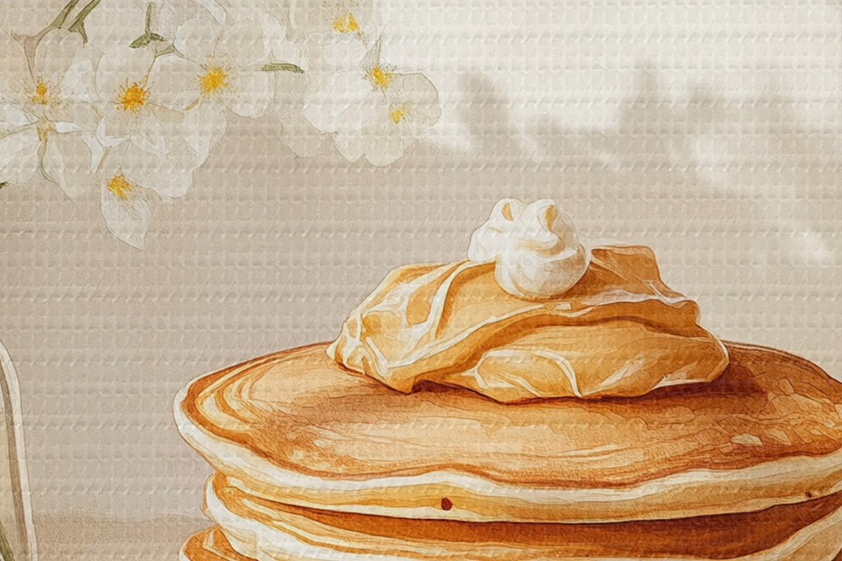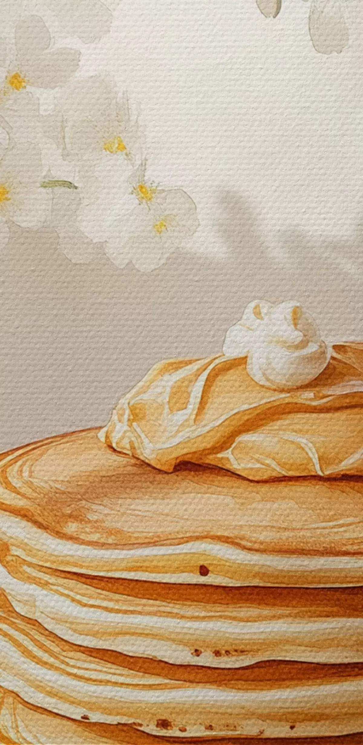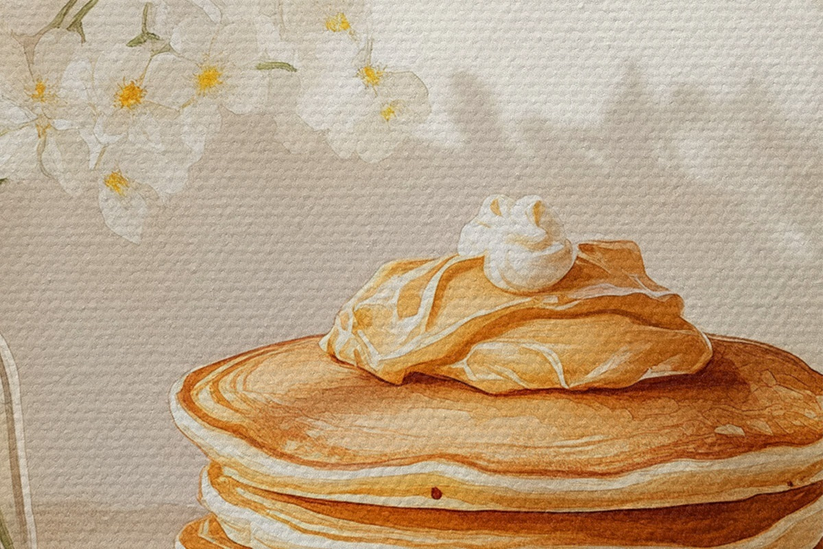 Image Délicieuses crêpes au beurre de cacahuètes, style aquarelle, vase avec fleurs blanches Nr r43063