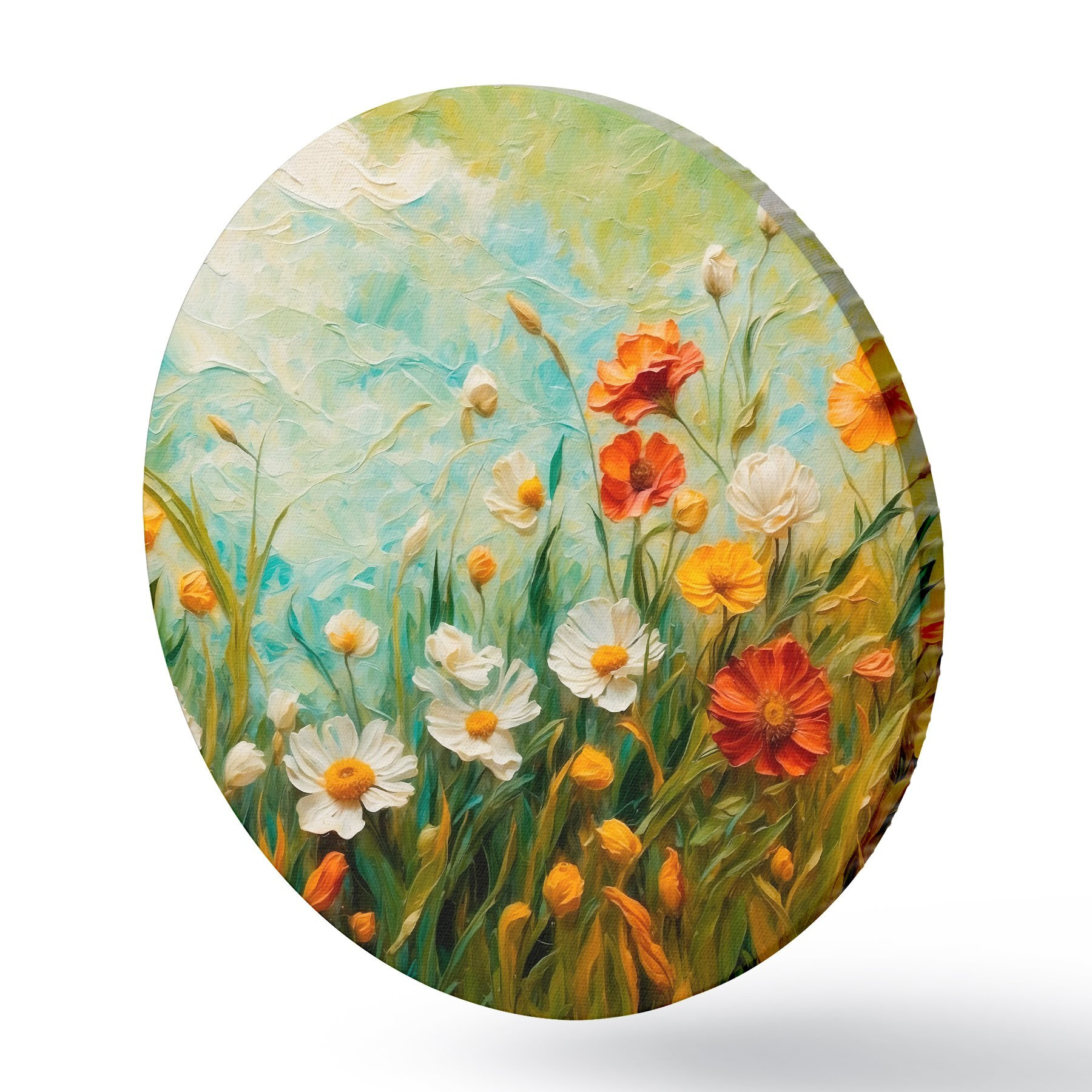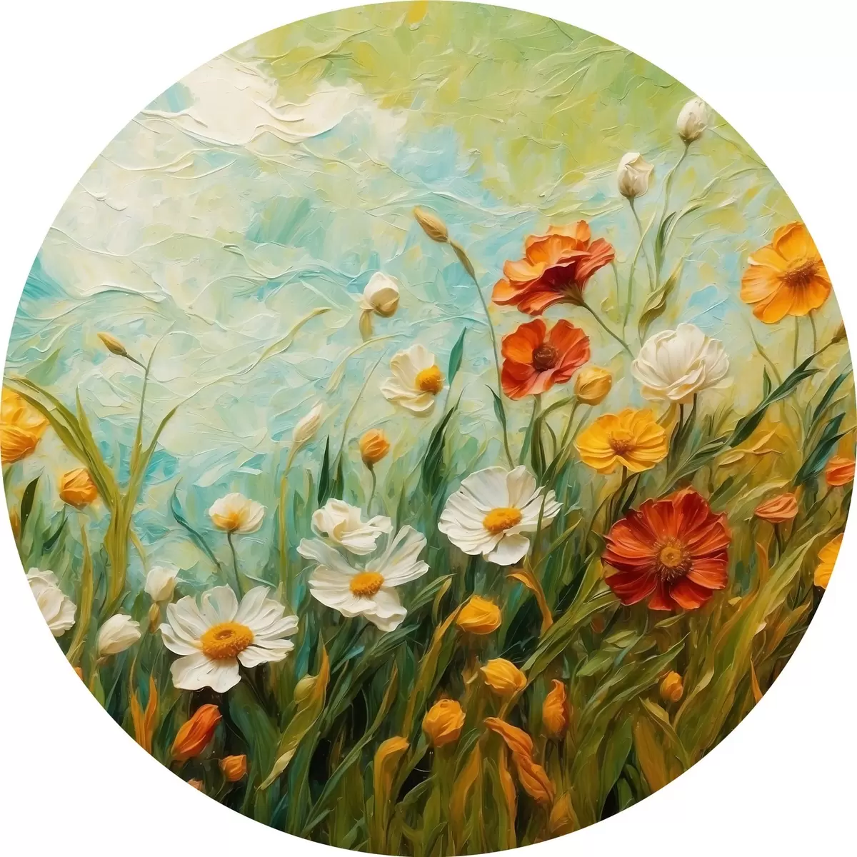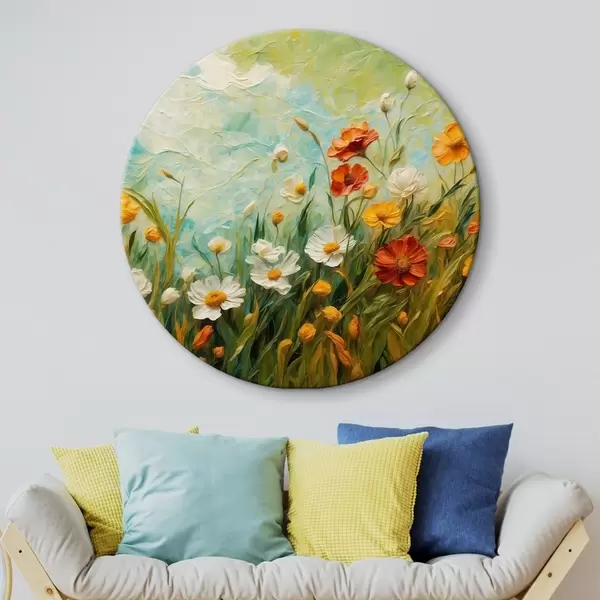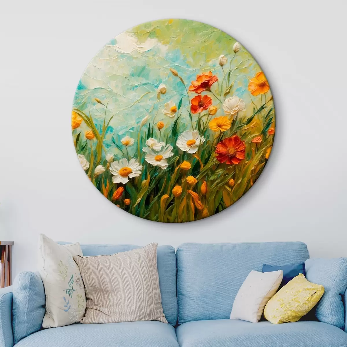 Tableaux ronds Champ de fleurs sur fond de ciel bleu abstrait r43100