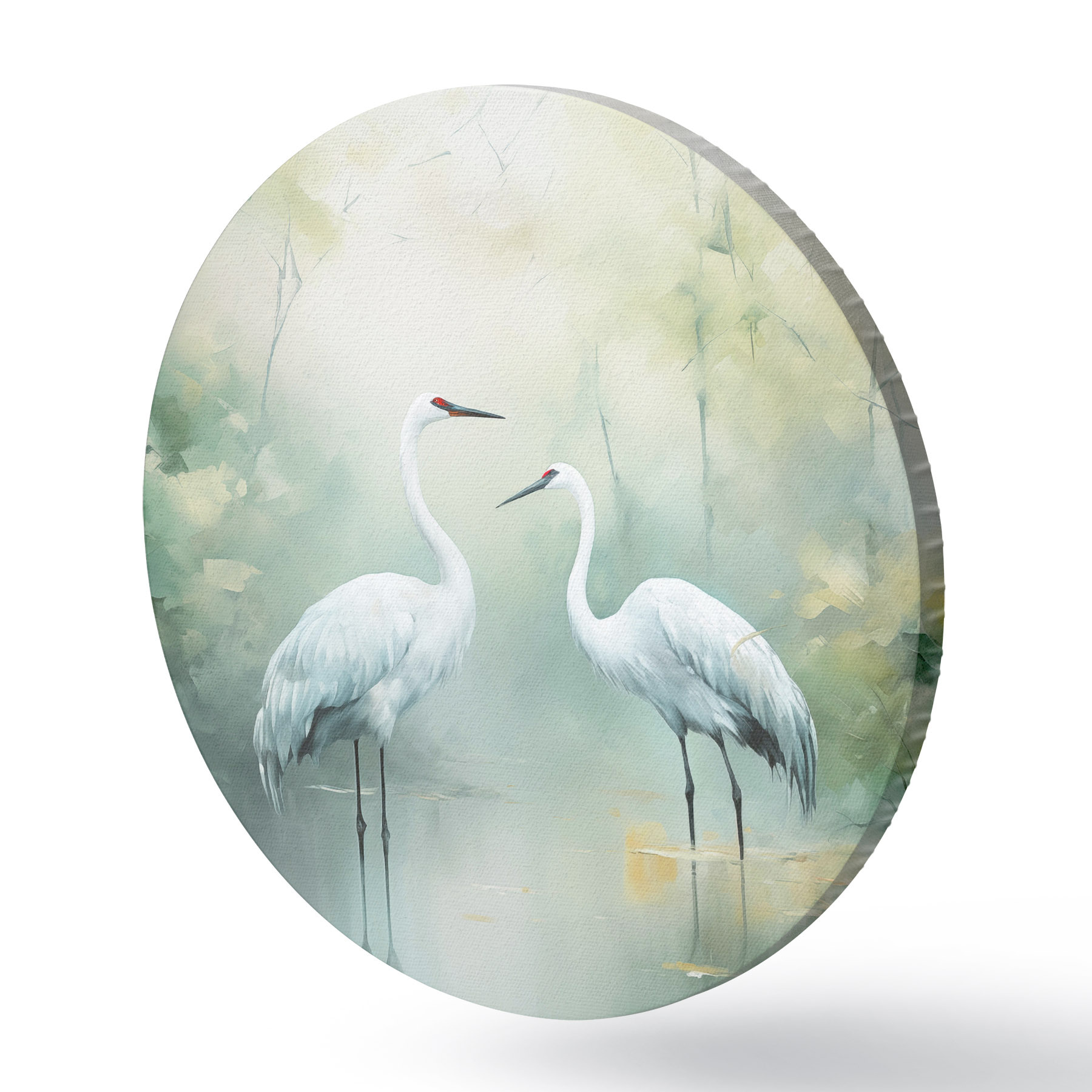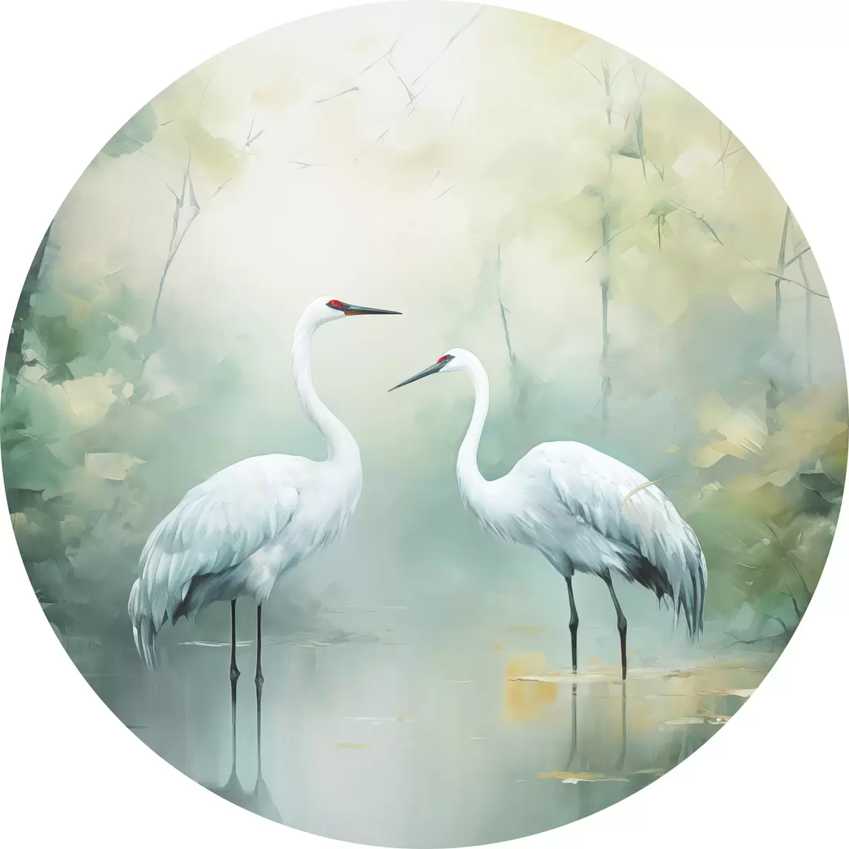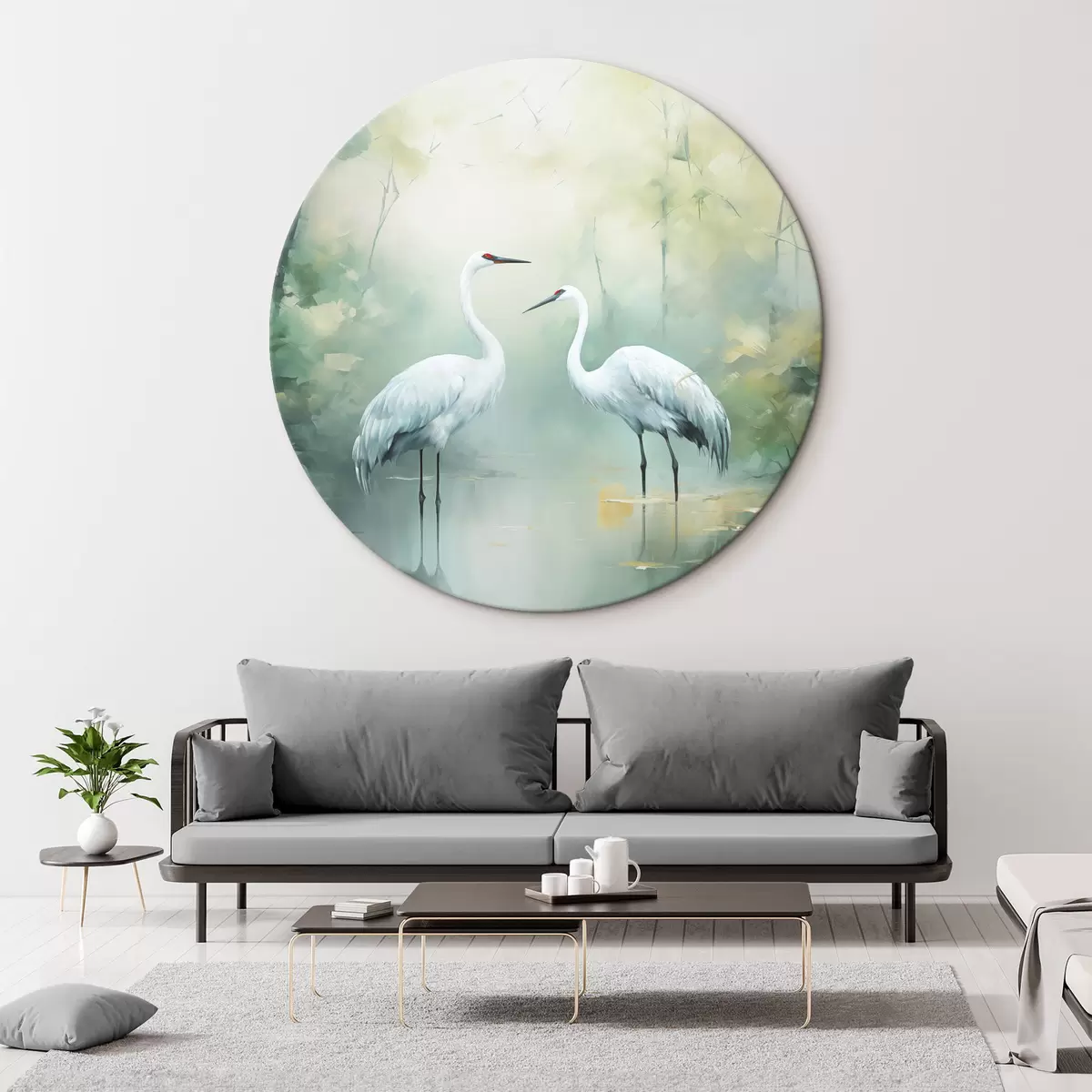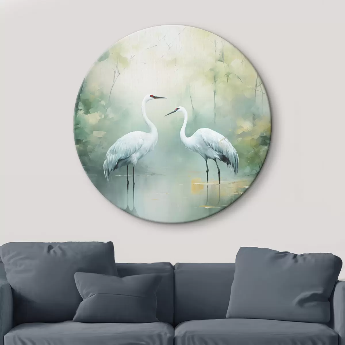 Tableaux ronds Deux grues blanches se tenant dans un étang, entourées d'une forêt verdoyante avec un éclairage doux et diffus r43166