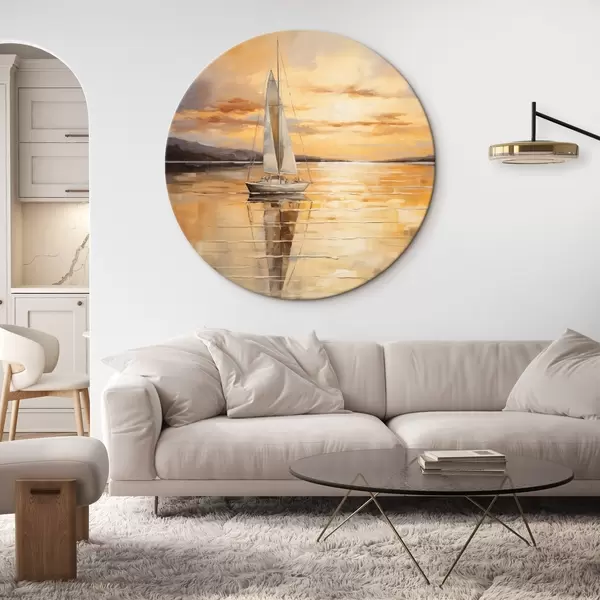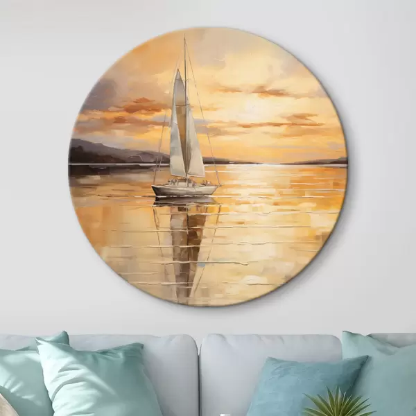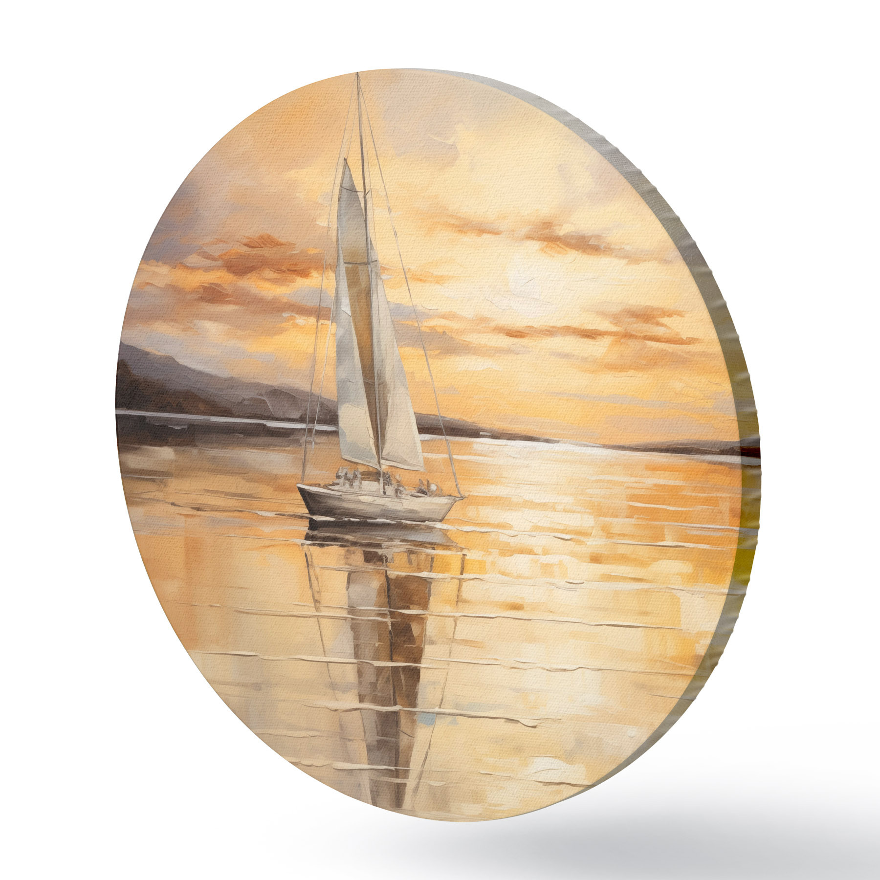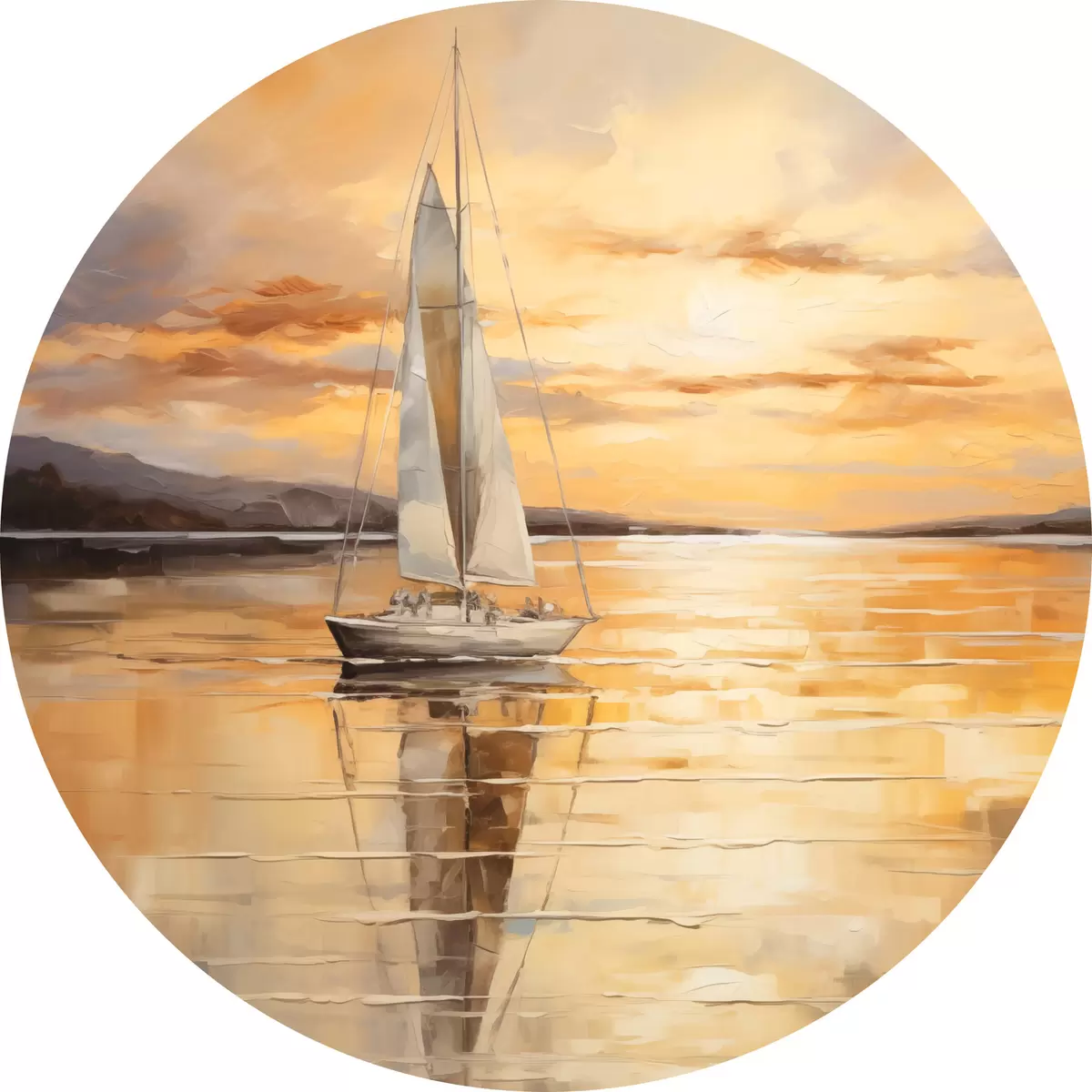 Tableaux ronds Peinture de paysage avec un voilier sur une mer calme, ciel orange et jaune, montagnes lointaines r43169