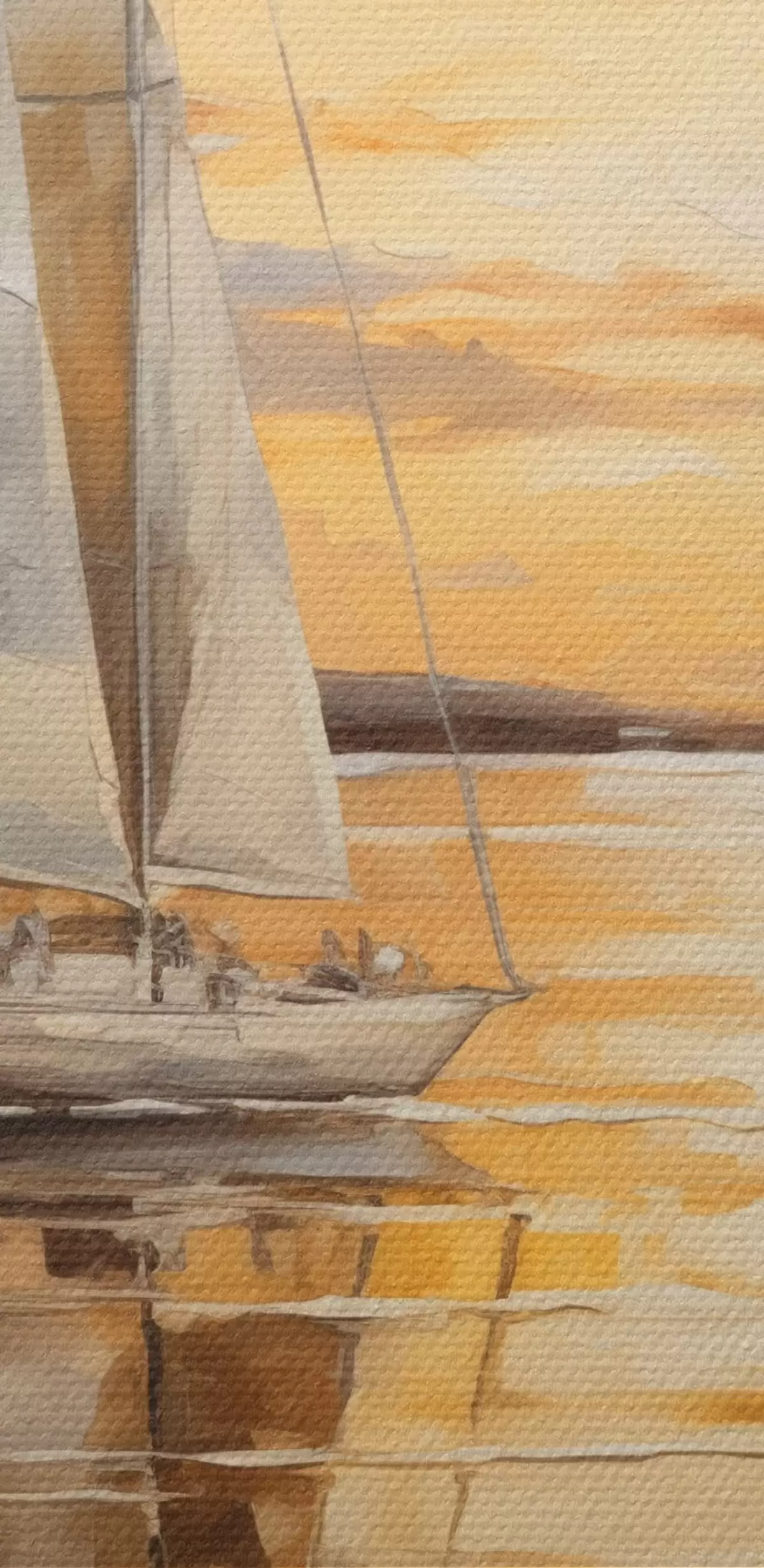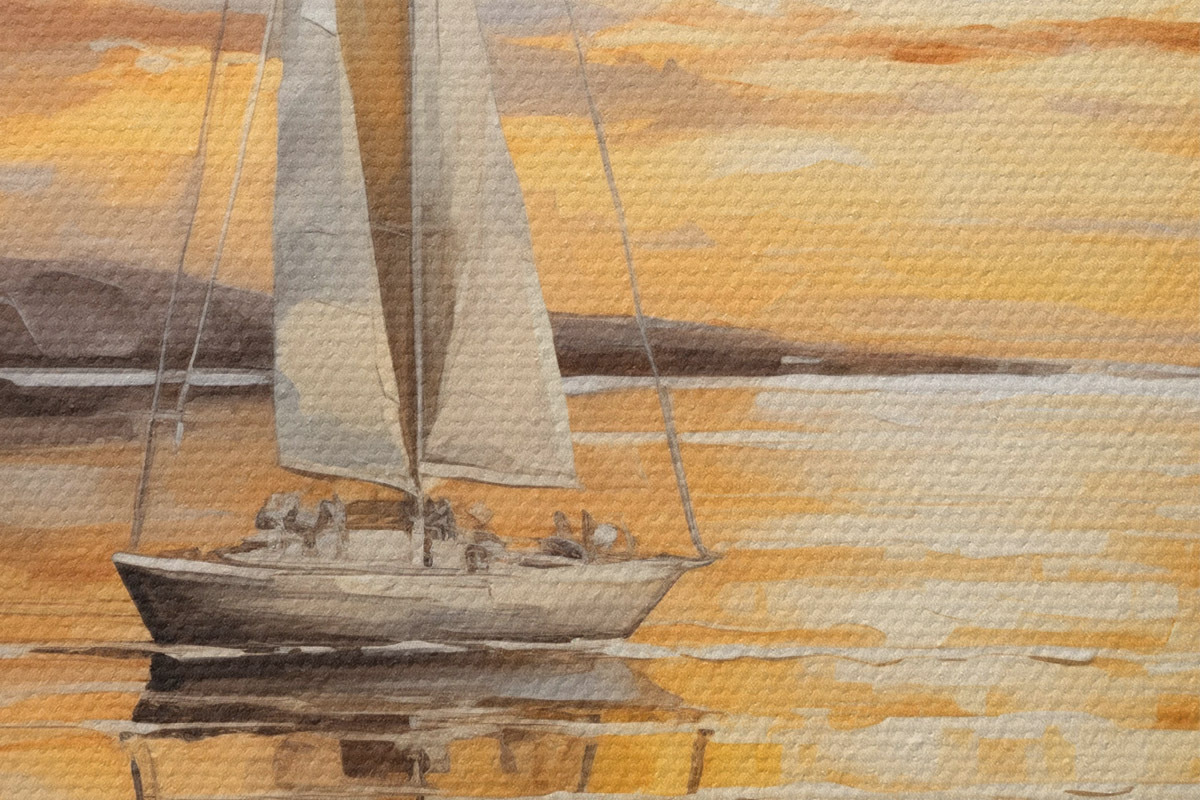 Image Peinture de paysage avec un voilier sur une mer calme, ciel orange et jaune, montagnes lointaines Nr r43169