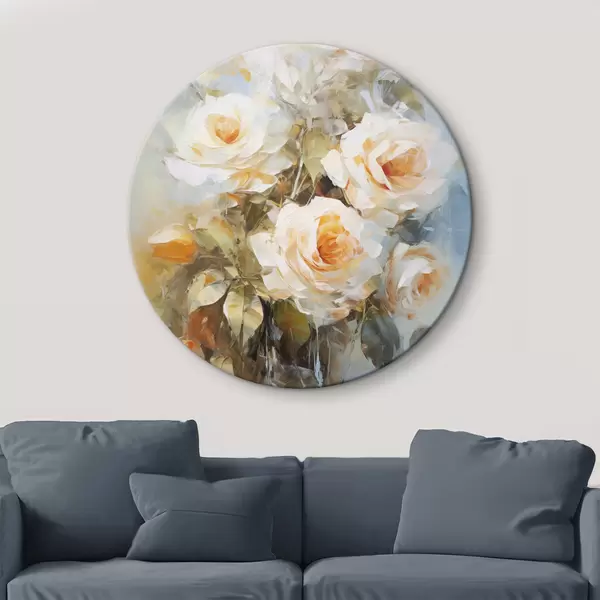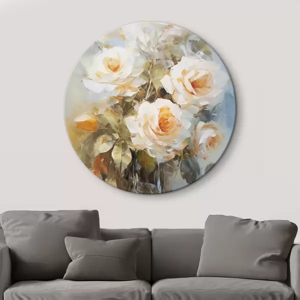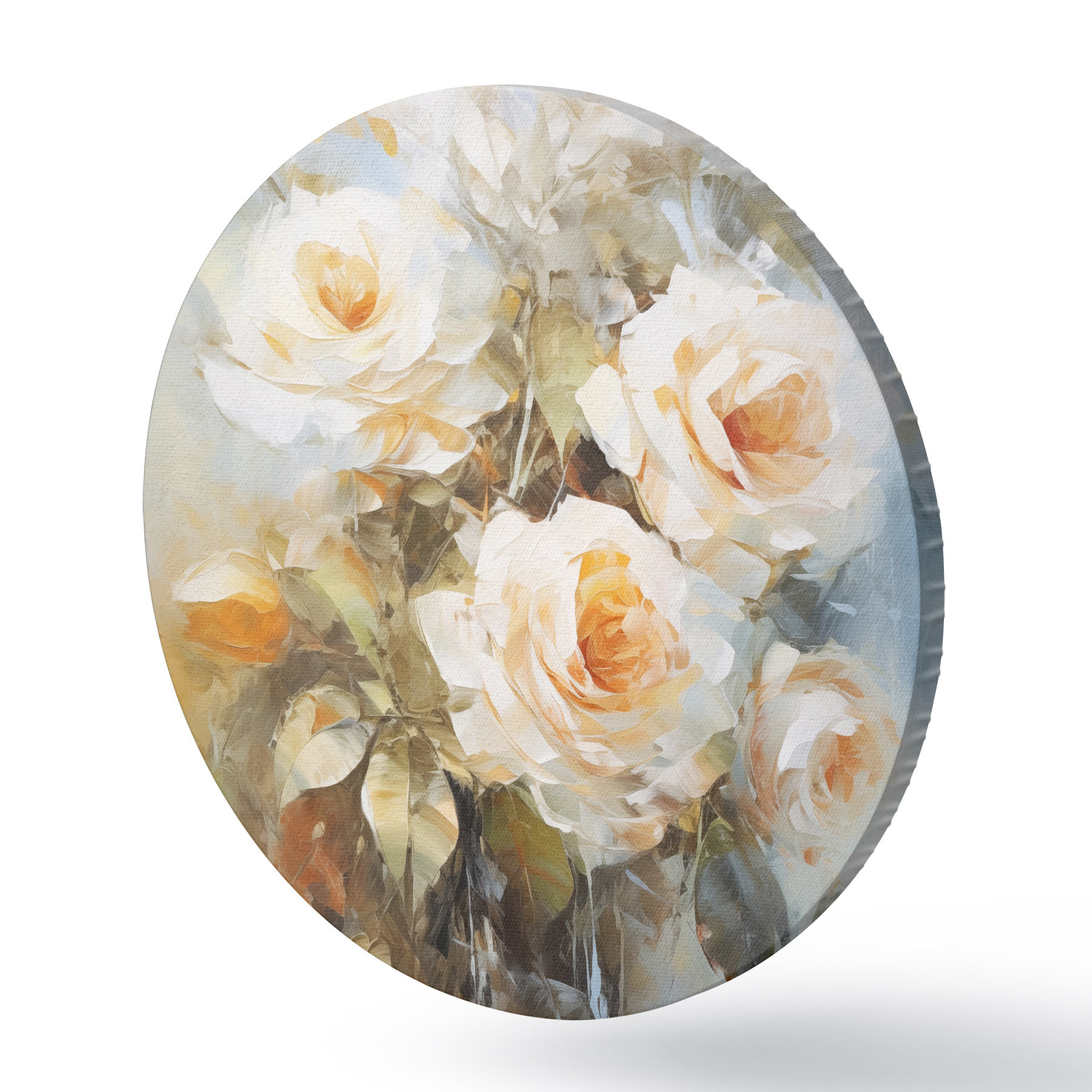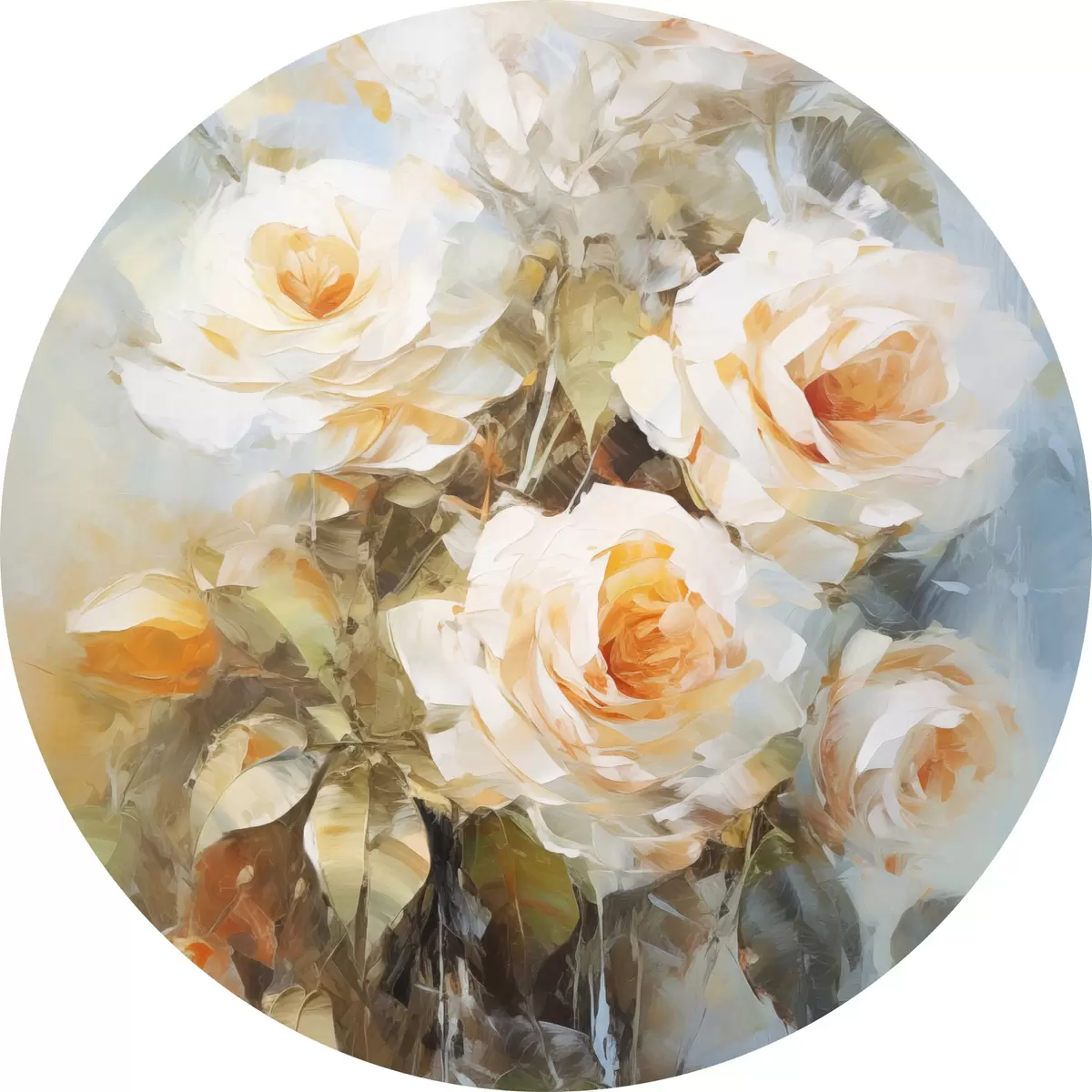 Tableaux ronds Roses blanches avec orange, sur un fond bleu clair doux, avec des coups de pinceau visibles et un style pictural r43175