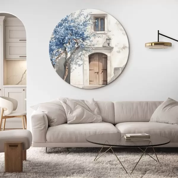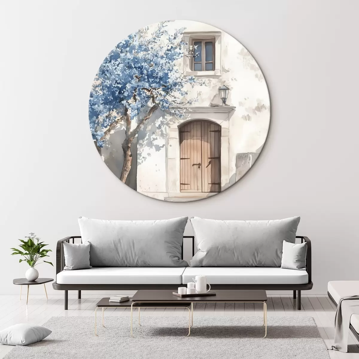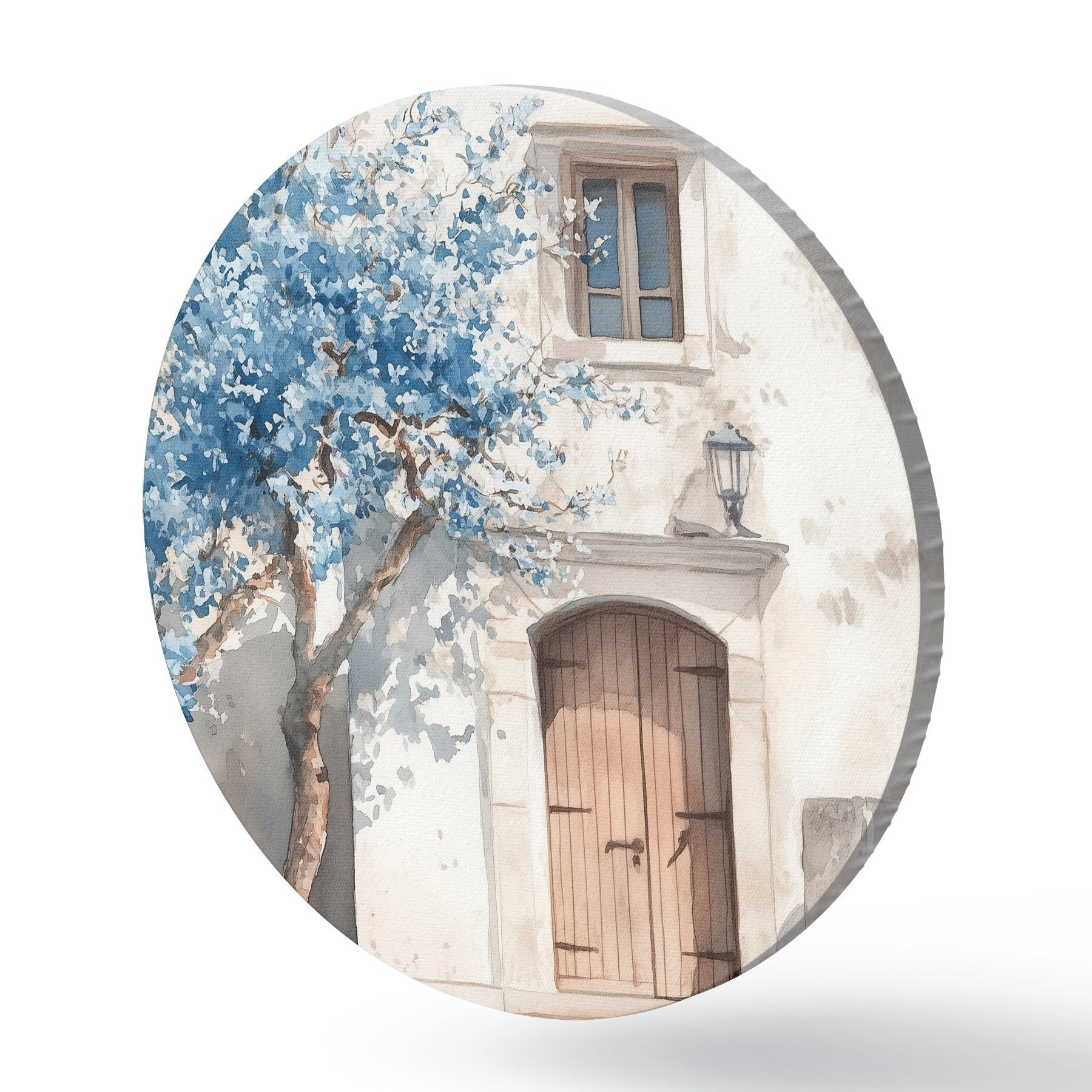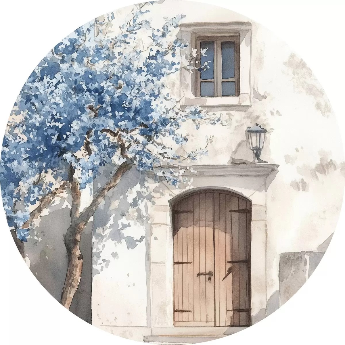 Tableaux ronds Maison grecque avec un bel arbre, architecture, style aquarelle r43178