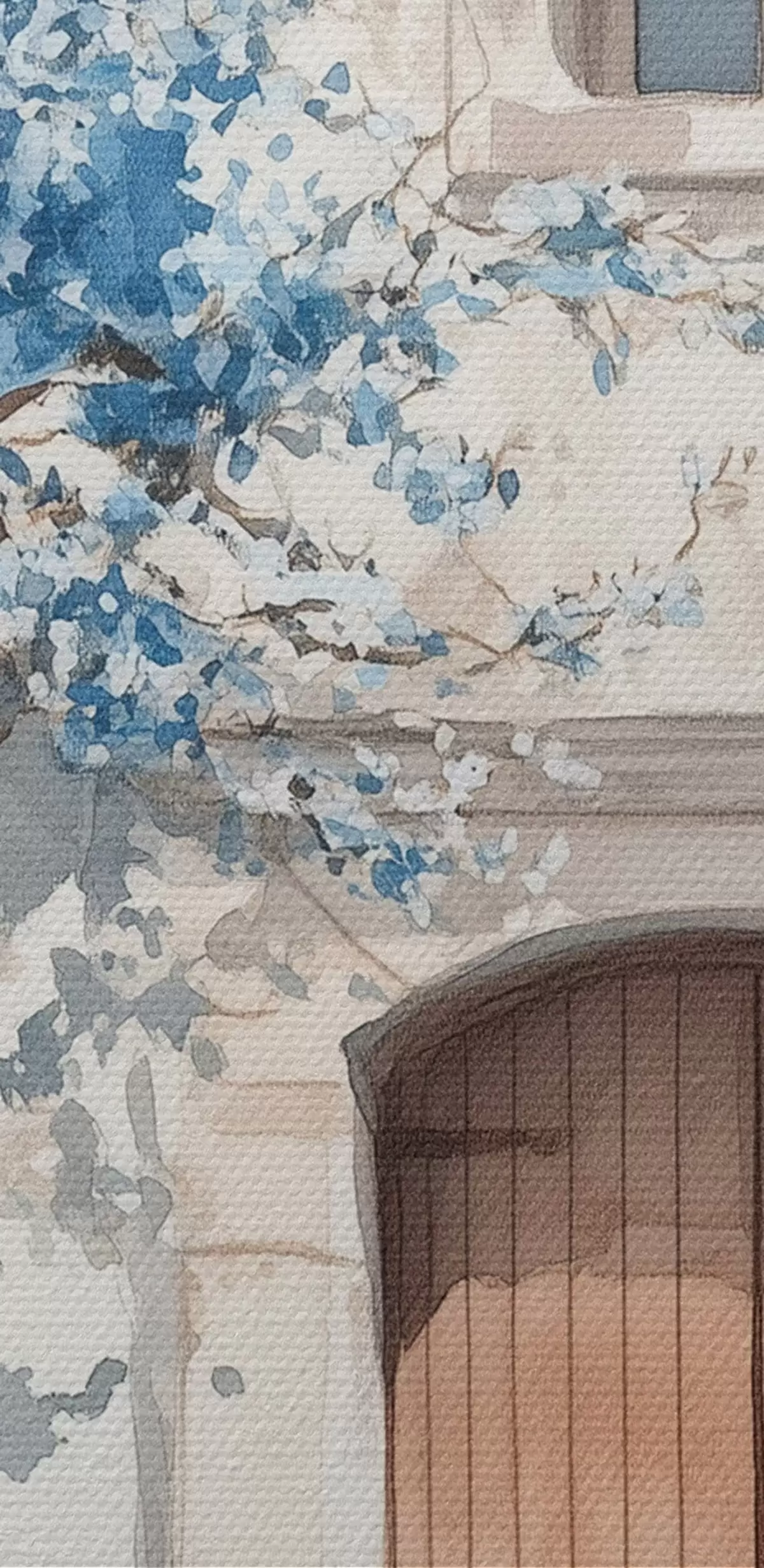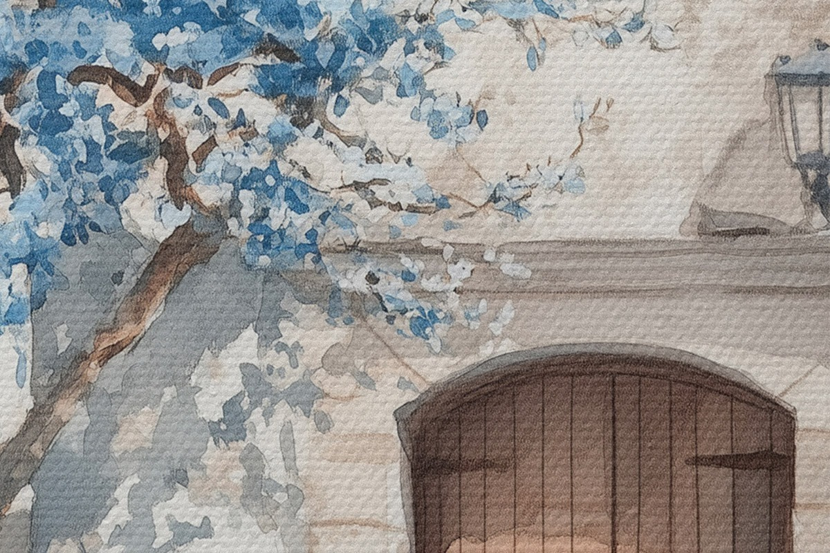 Image Maison grecque avec un bel arbre, architecture, style aquarelle Nr r43178