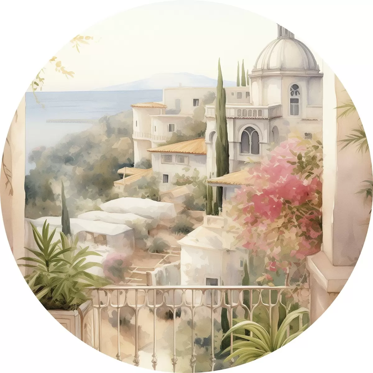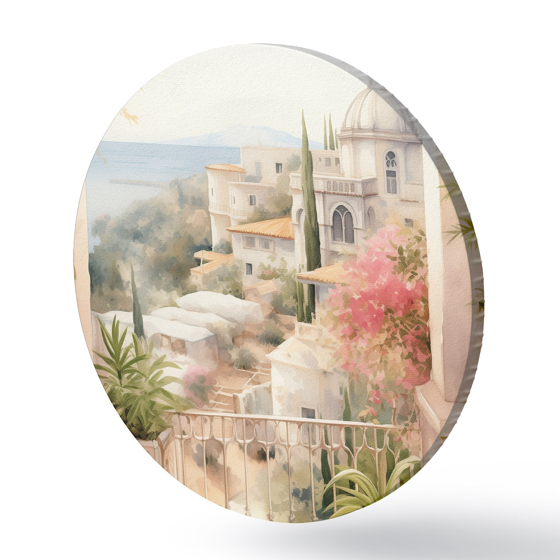 Tableaux ronds Espagne, paysage d'été, architecture méditerranéenne, style aquarelle r43181