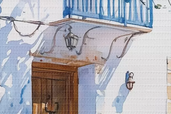 Image Aquarelle, maison grecque, arbre en fleurs, architecture Nr r43182