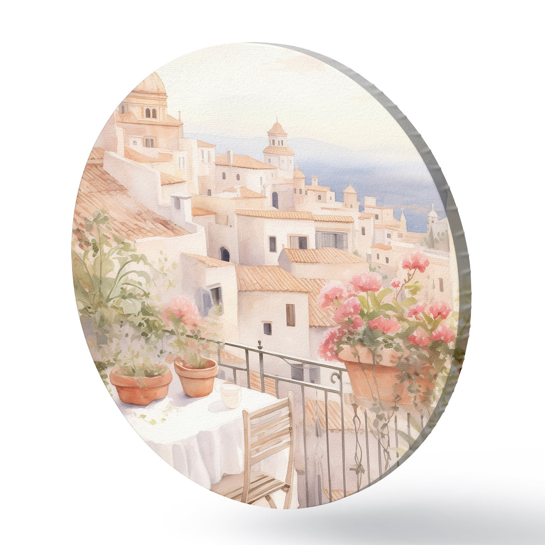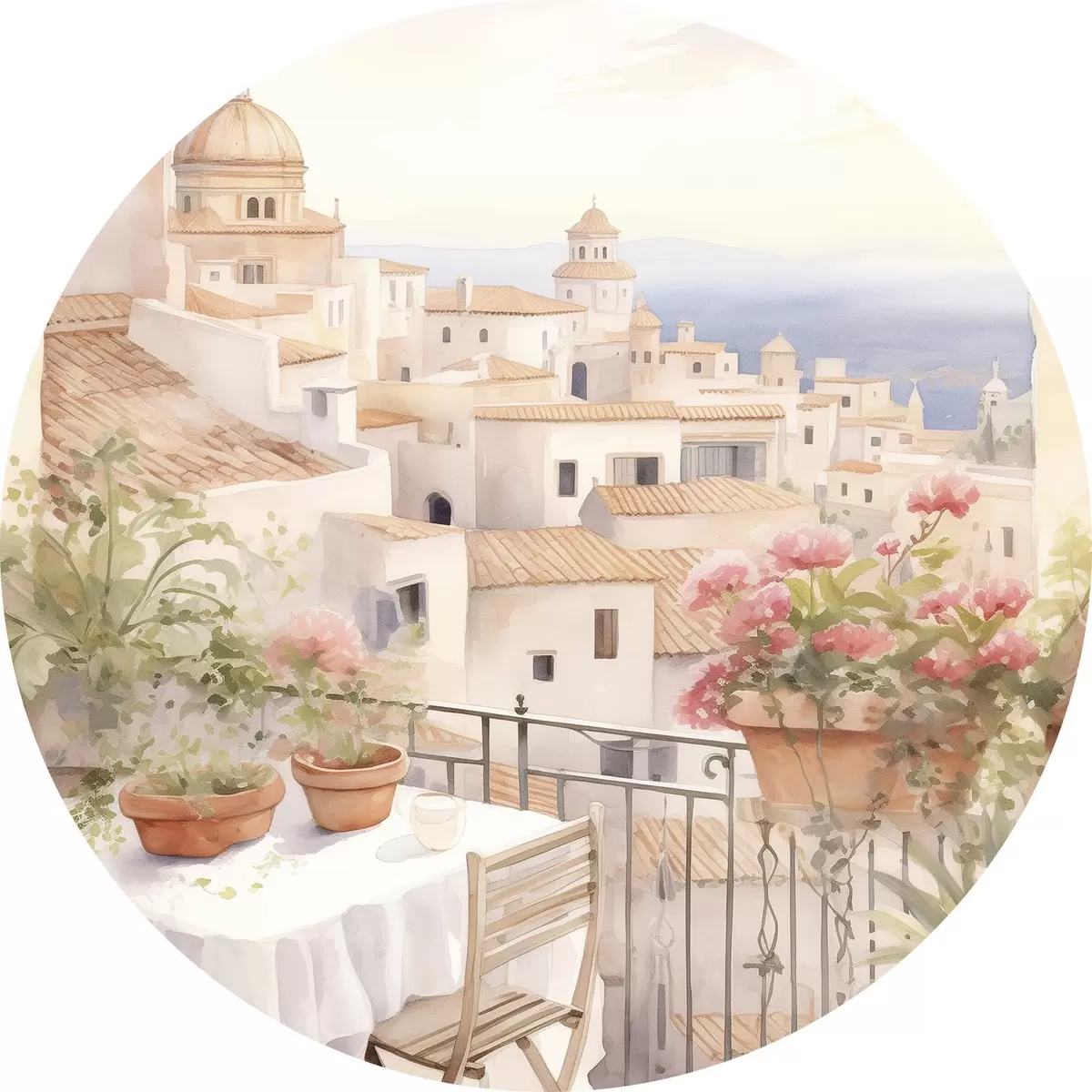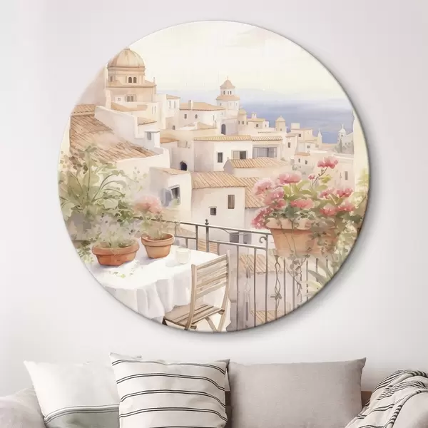 Tableaux ronds Coucher de soleil sur le balcon, Italie, architecture, fleurs épanouies, style aquarelle r43184