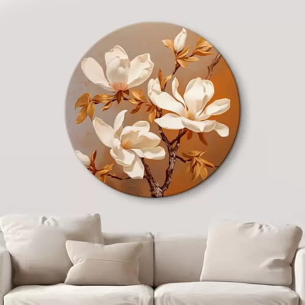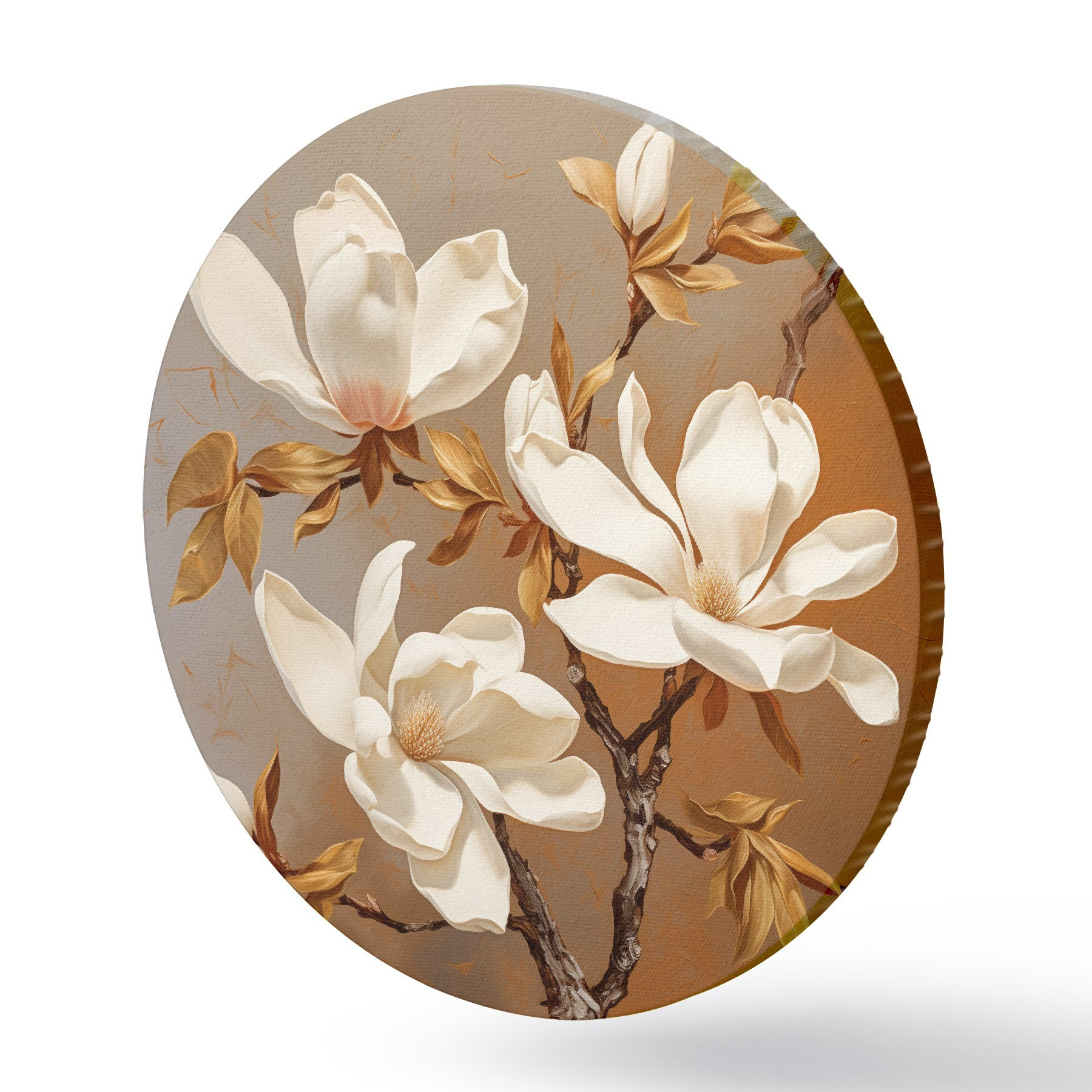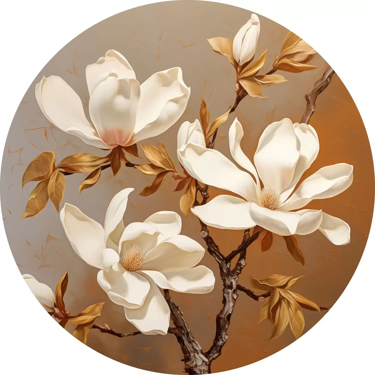 Tableaux ronds Peinture à l'huile avec un magnolia blanc sur une branche sur un fond jaune r43361