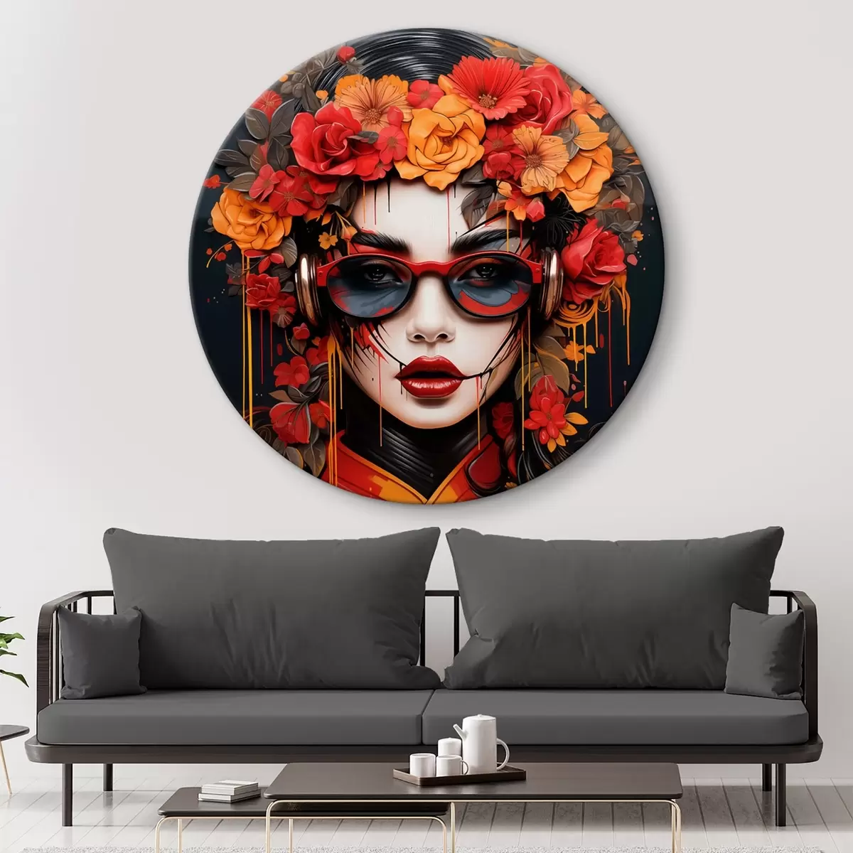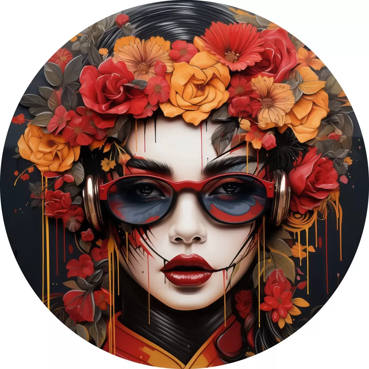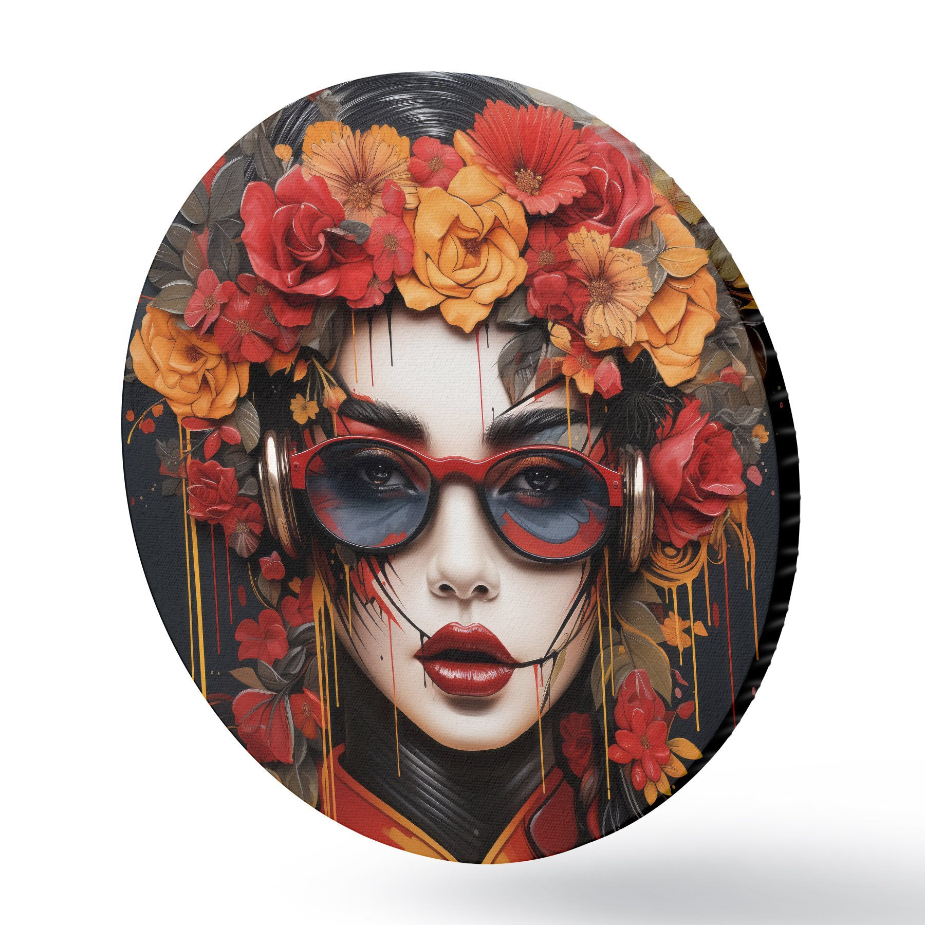Tableaux ronds Femme avec des fleurs sur la tête, style street art r43362