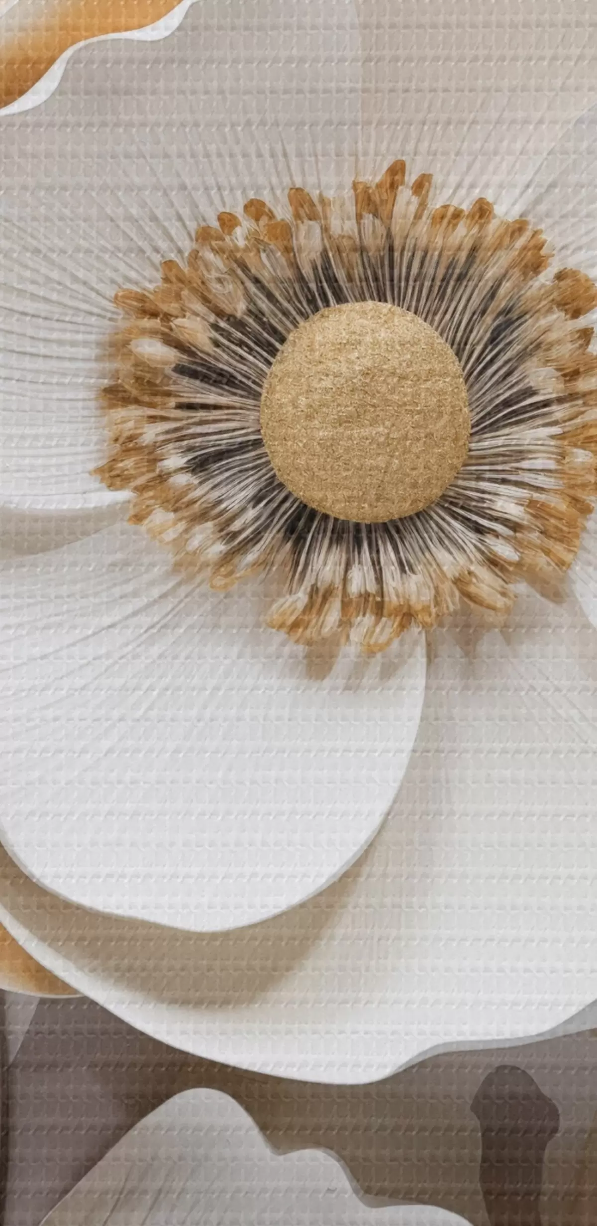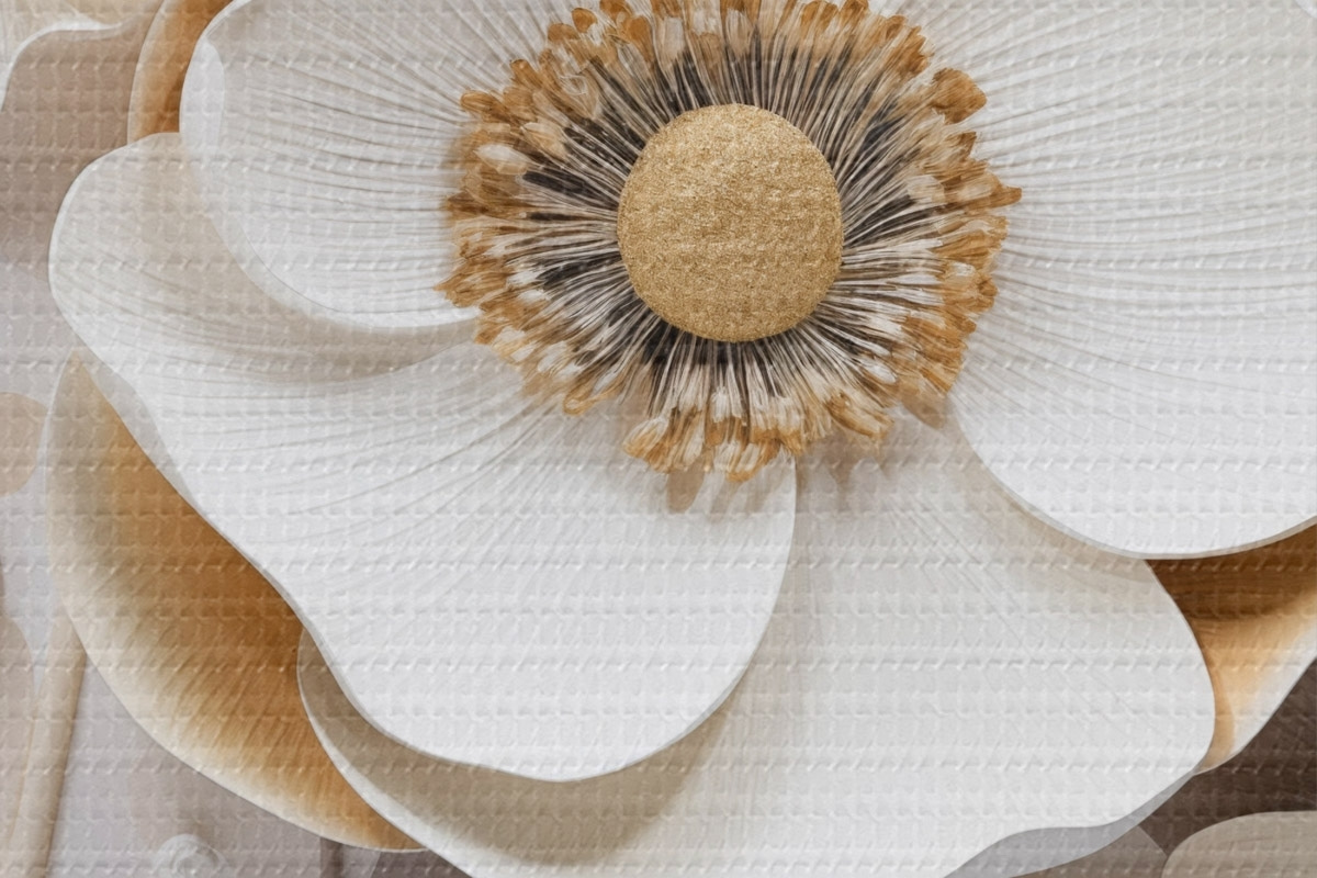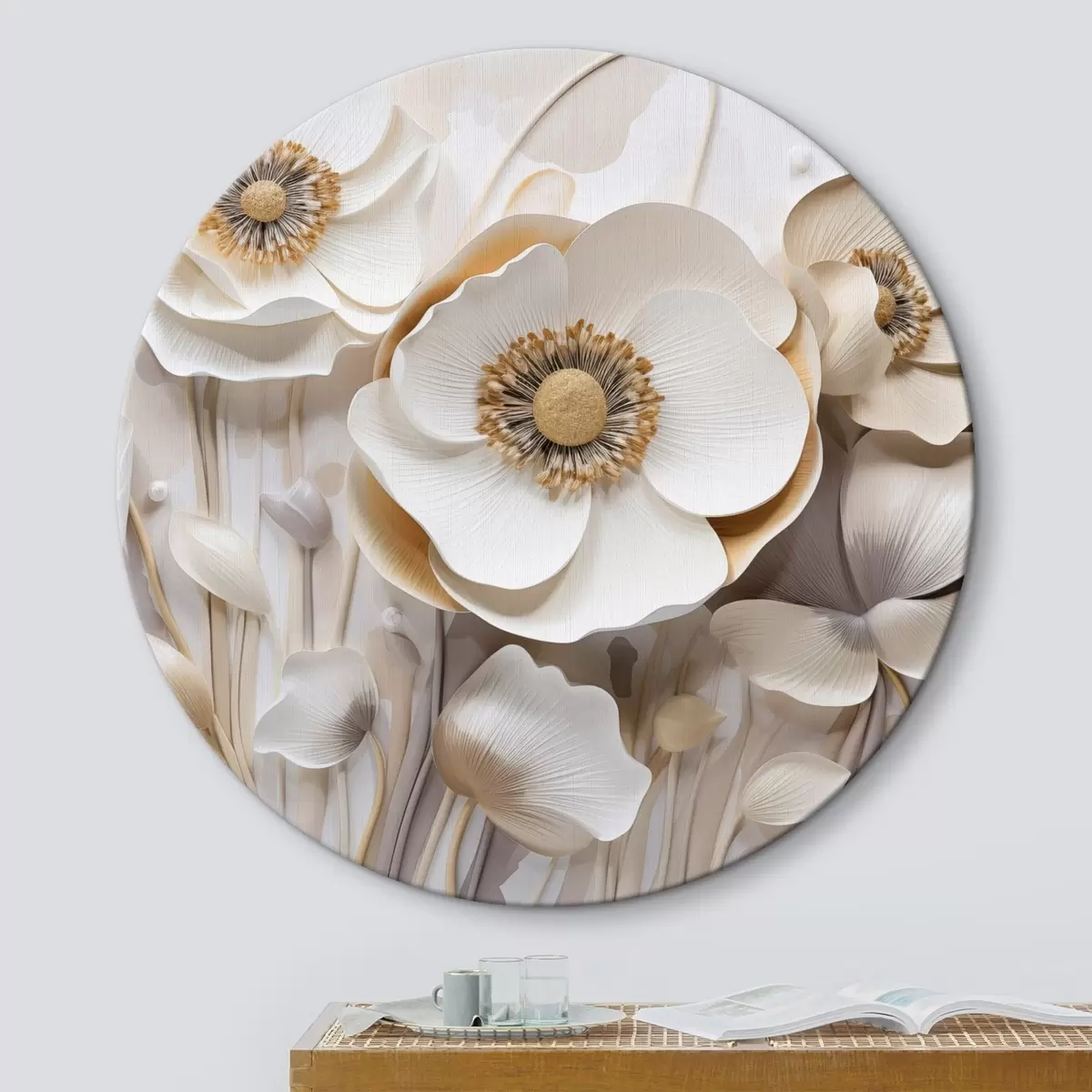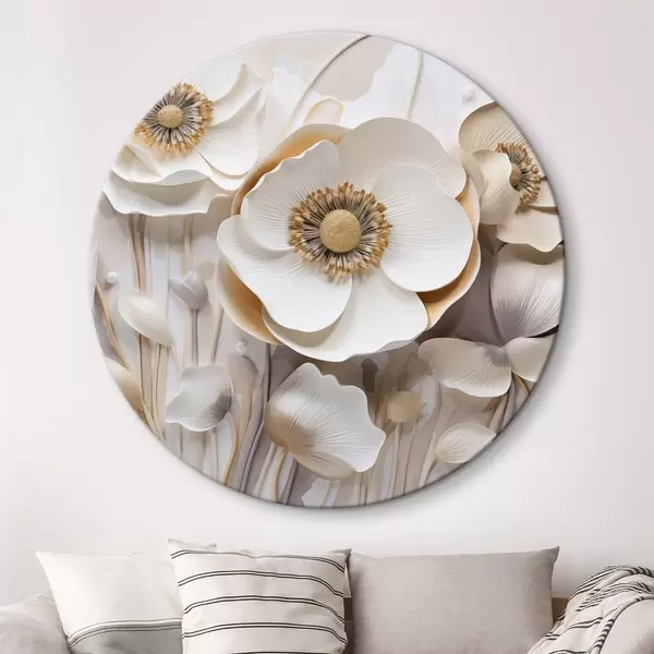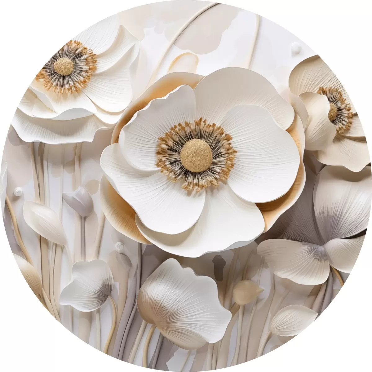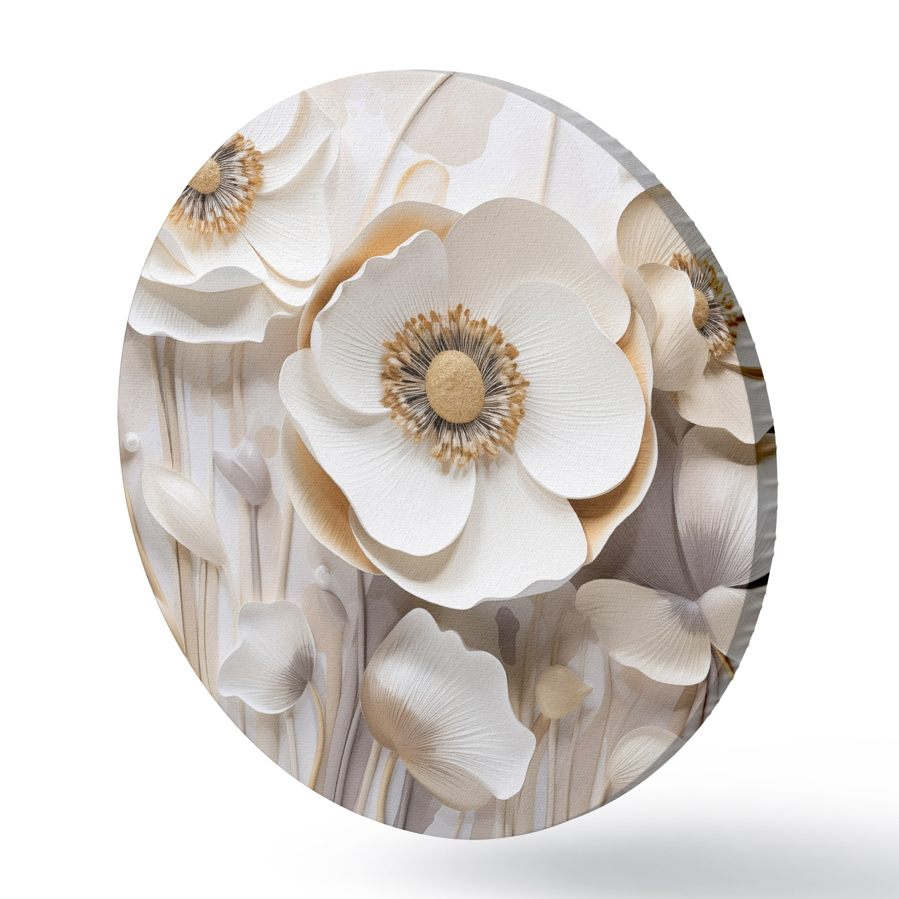 Tableaux ronds Fleurs d'anémones blanches à centre jaune, sur fond minimaliste, créant un motif floral délicat r43400