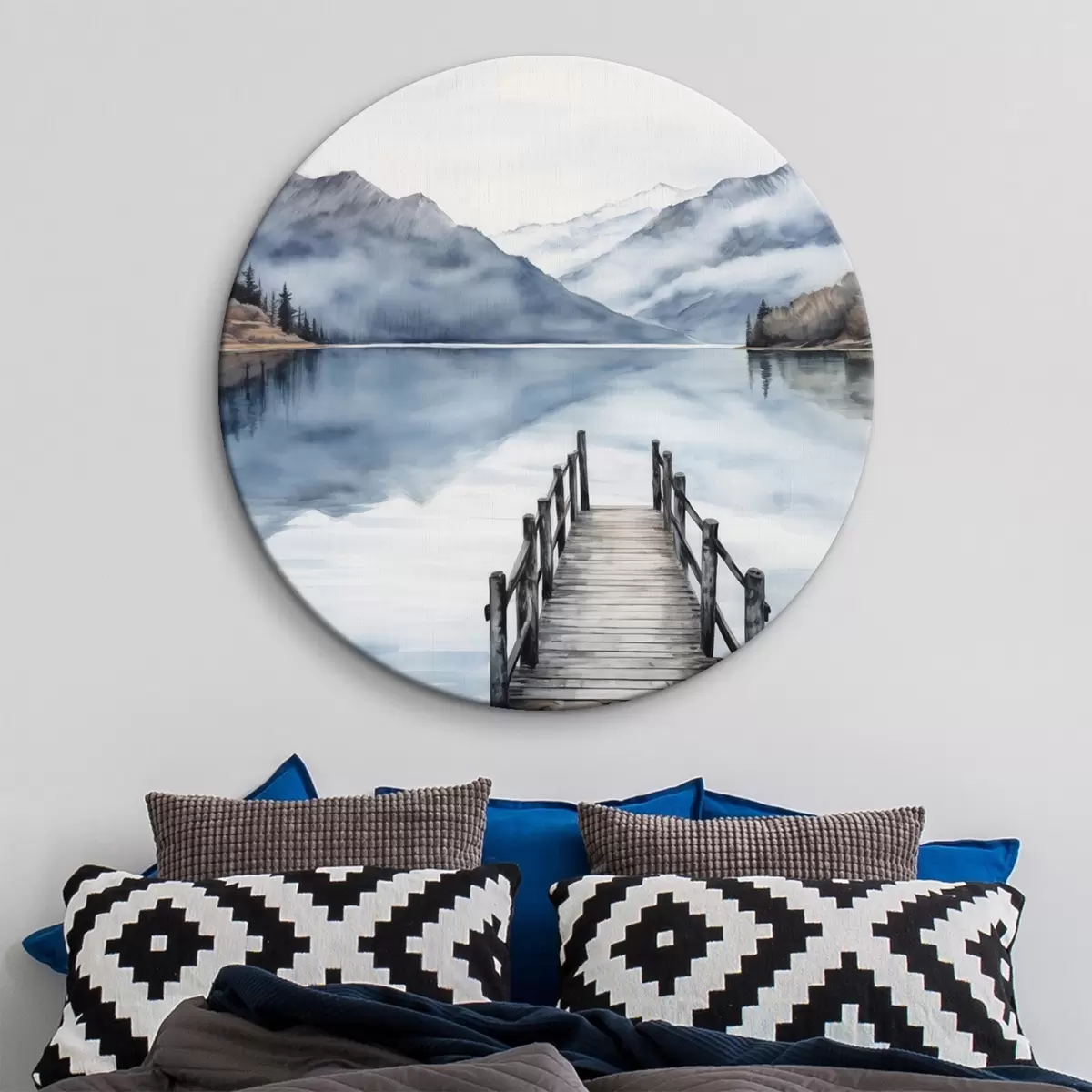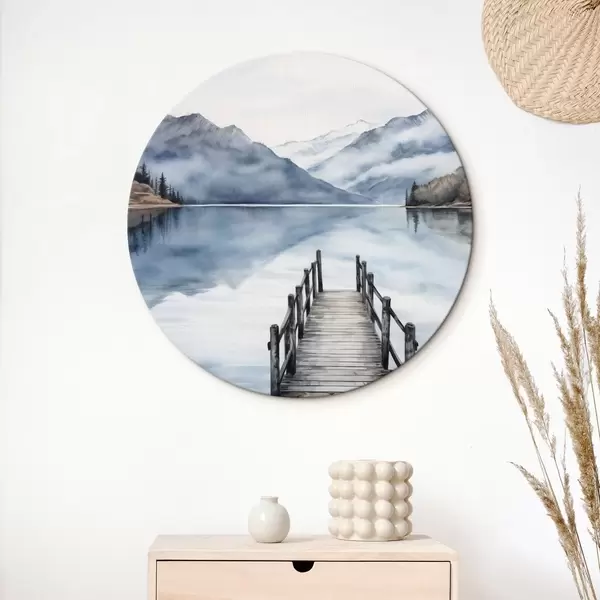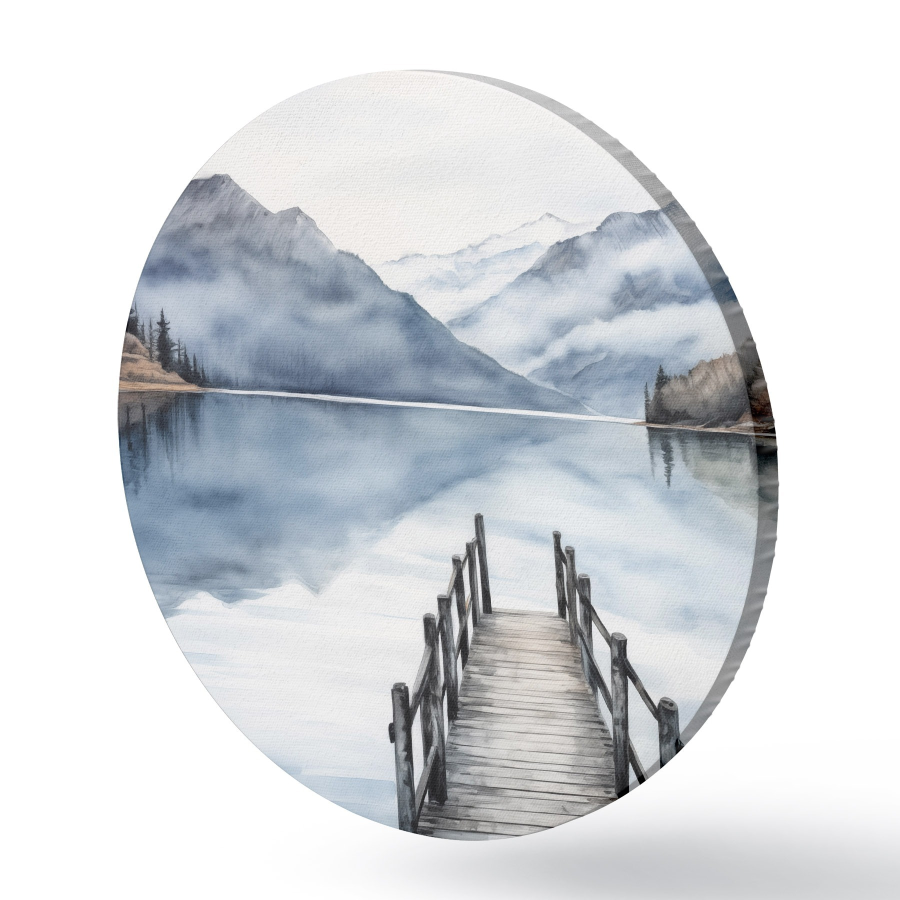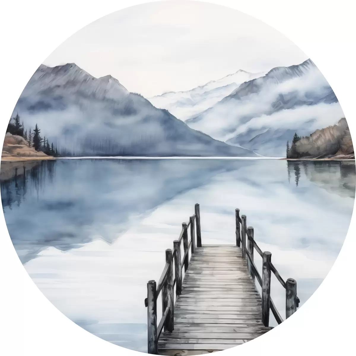 Tableaux ronds Un quai en bois s'étend sur un lac calme, entouré de montagnes et d'arbres à feuilles persistantes, style aquarelle r43405