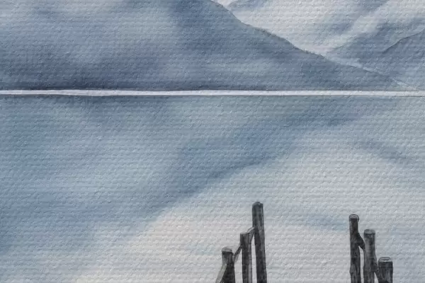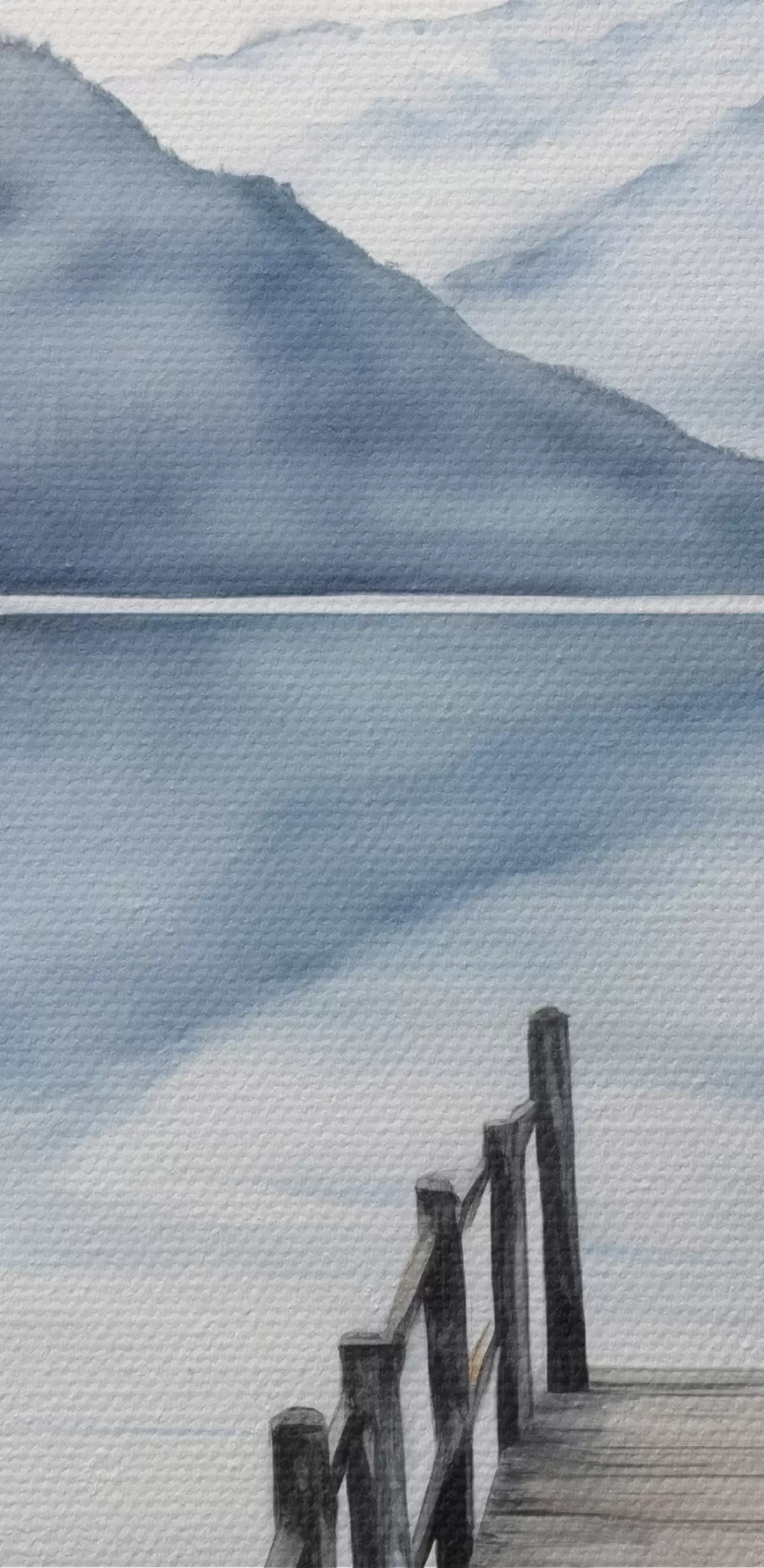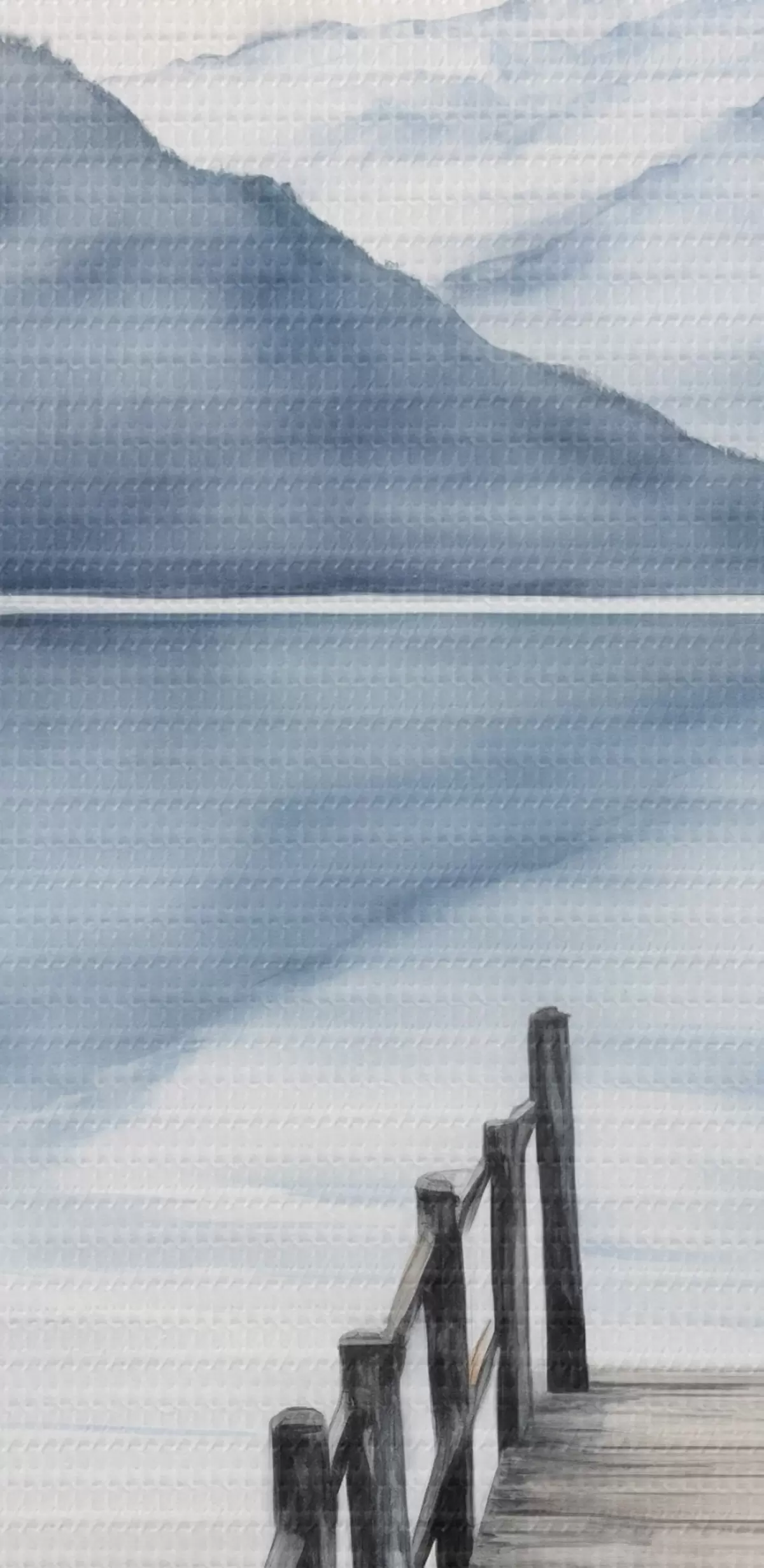 Image Un quai en bois s'étend sur un lac calme, entouré de montagnes et d'arbres à feuilles persistantes, style aquarelle Nr r43405