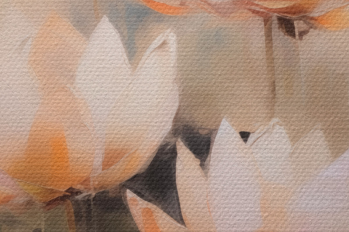 Trois types de matériaux peuvent être commandés : Economic Canvas - matériau dense et durable pour l'impression numérique, identique à la toile de peintre, surface imperméable, reproduction réaliste des détails, matériau à grain moyen. Premium Canvas - la texture ressemble à celle d'une toile de peintre (petits fils entrelacés). Reproduction douce et détaillée de l'image sur une surface mate. Eco-Premium - tissu 100 % coton de haute qualité. Grâce aux fibres naturelles de coton, le matériau est durable et résistant à l'usure. Excellente reproduction des couleurs et des détails.