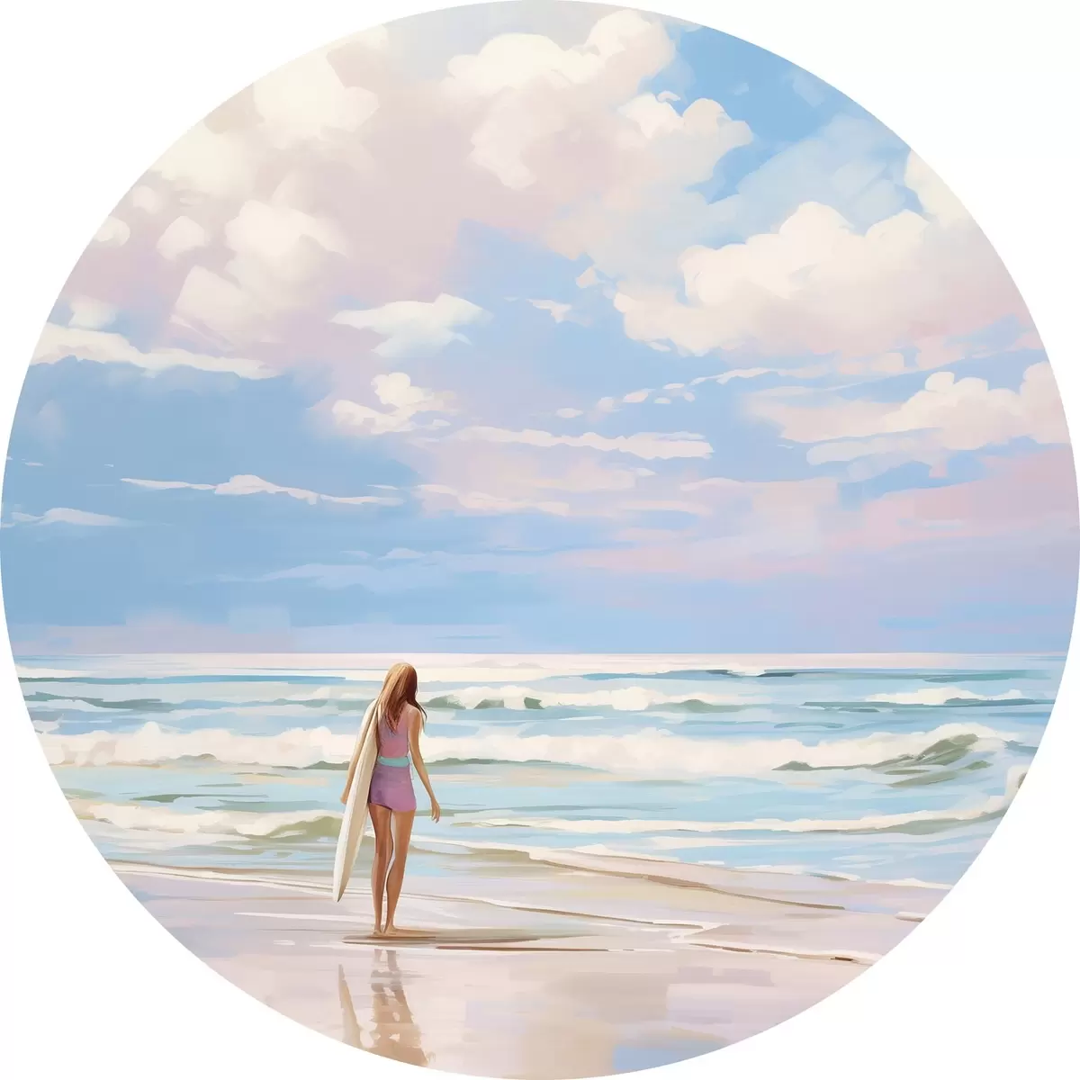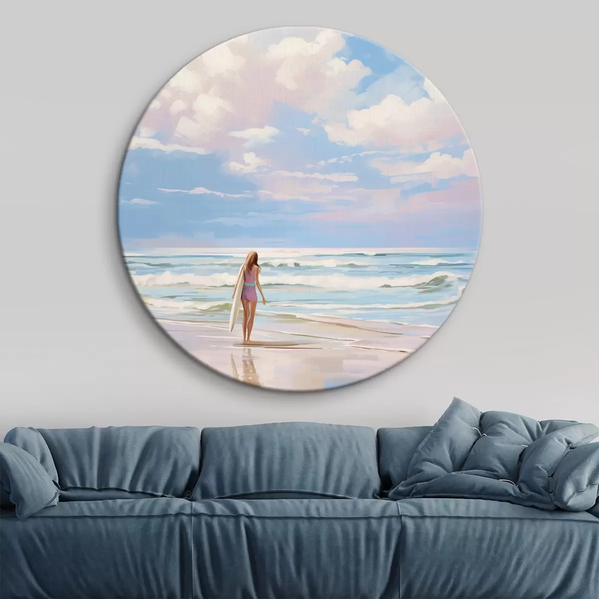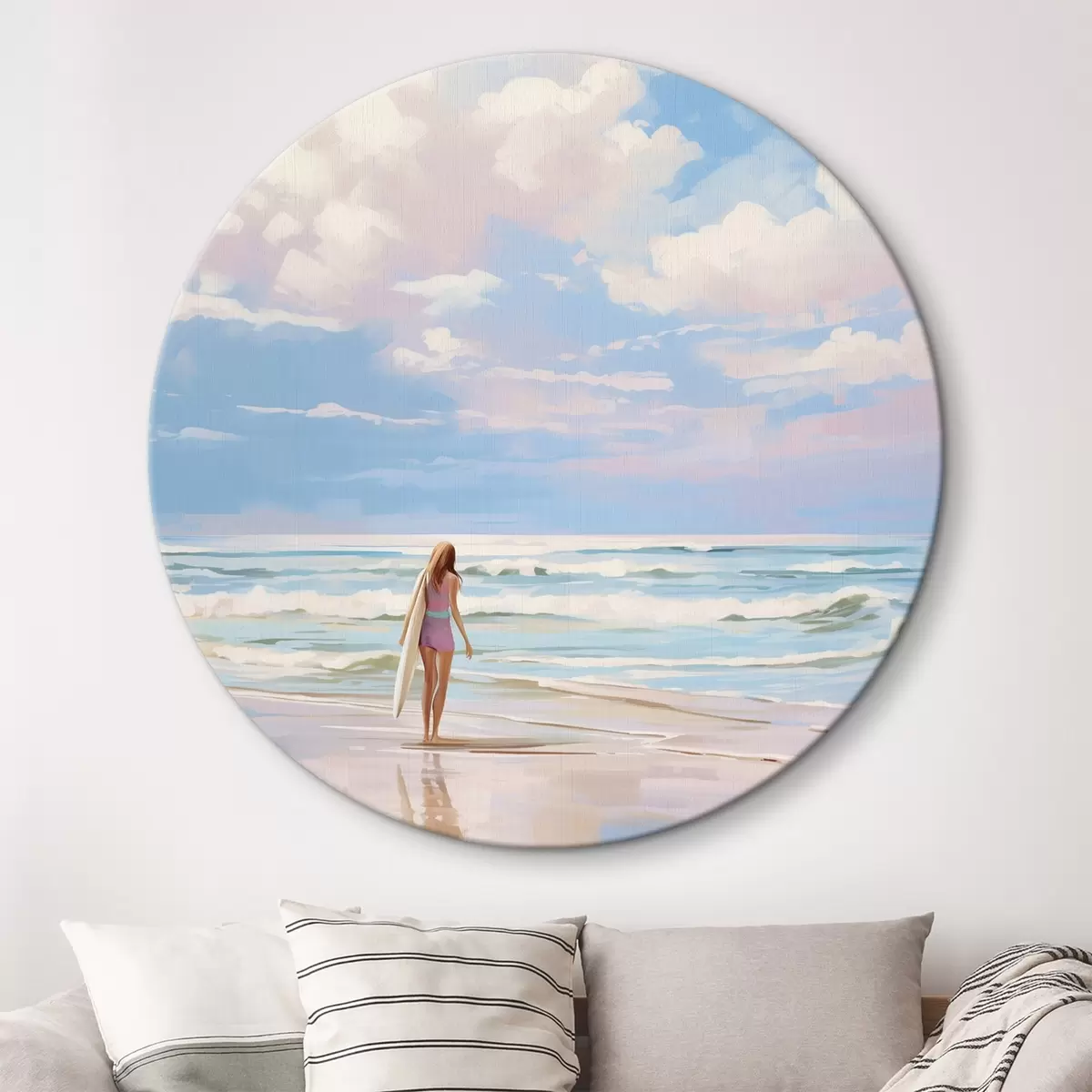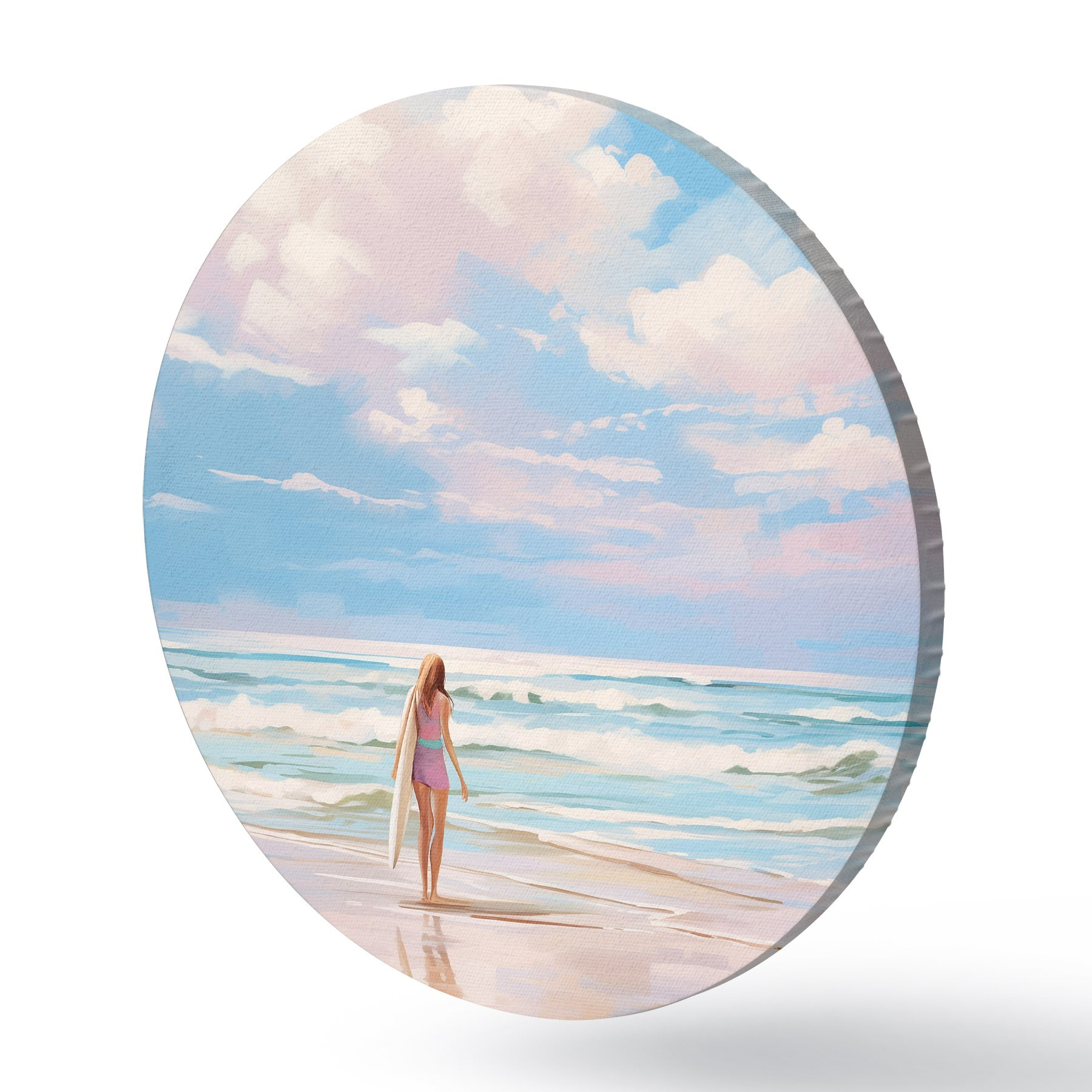 Tableaux ronds Fille surfant dans l'océan, été, vagues, style acrylique r43882