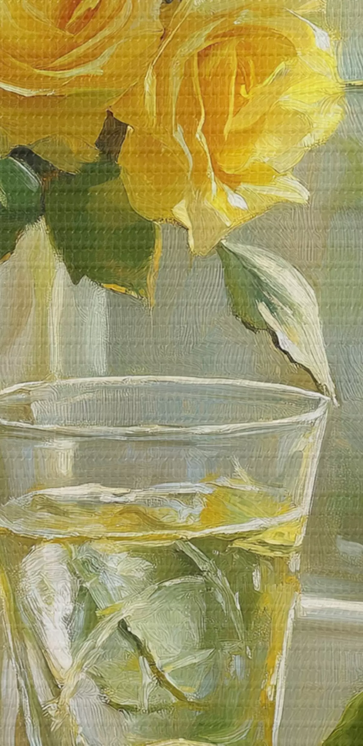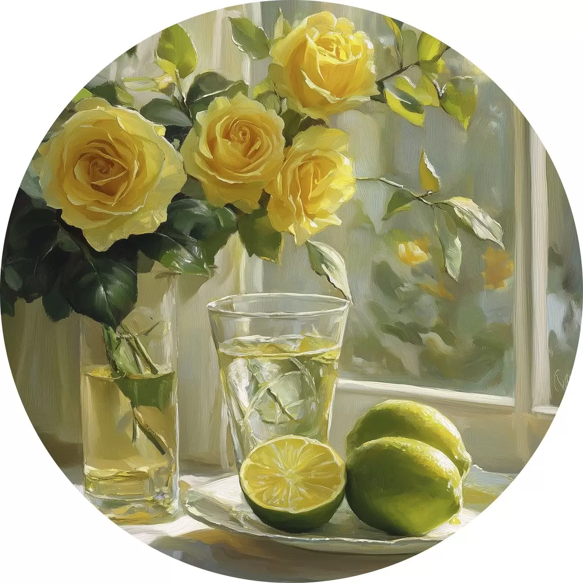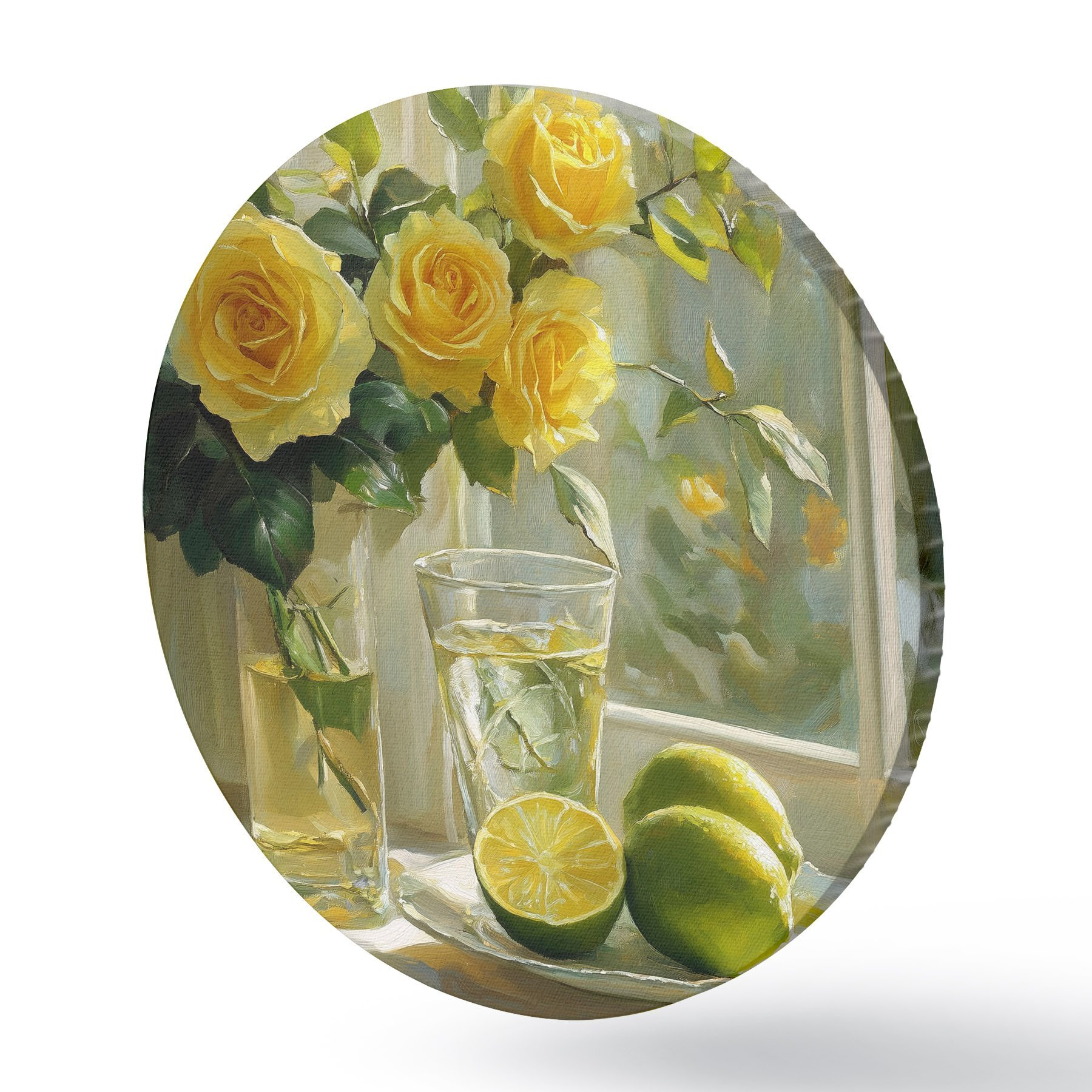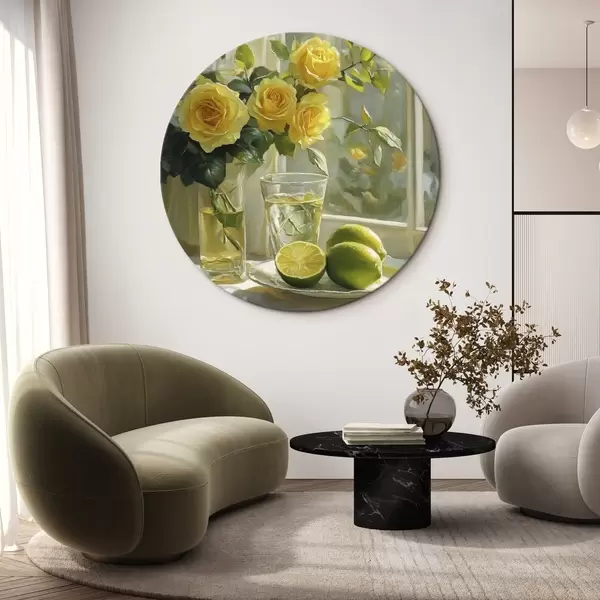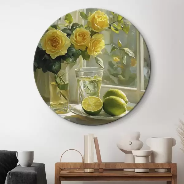 Tableaux ronds De belles roses jaunes dans le vase près de la fenêtre, arrosées de citrons verts r43886