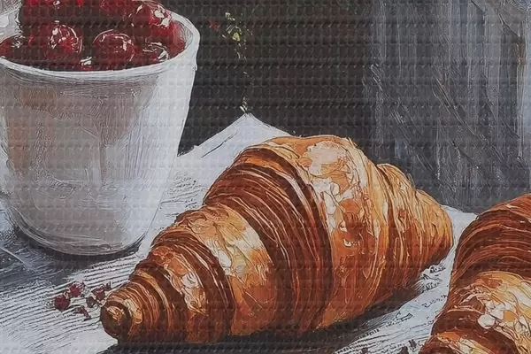 Image Paris matin, café avec croissants, vue de la ville, dessin à l'huile Nr r43892