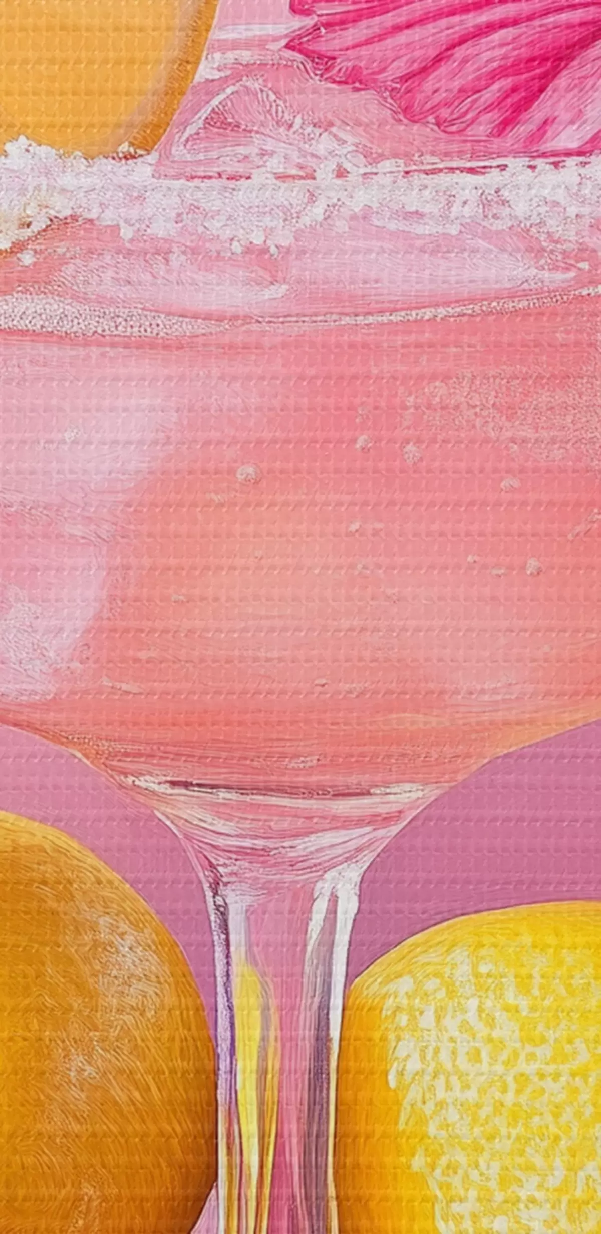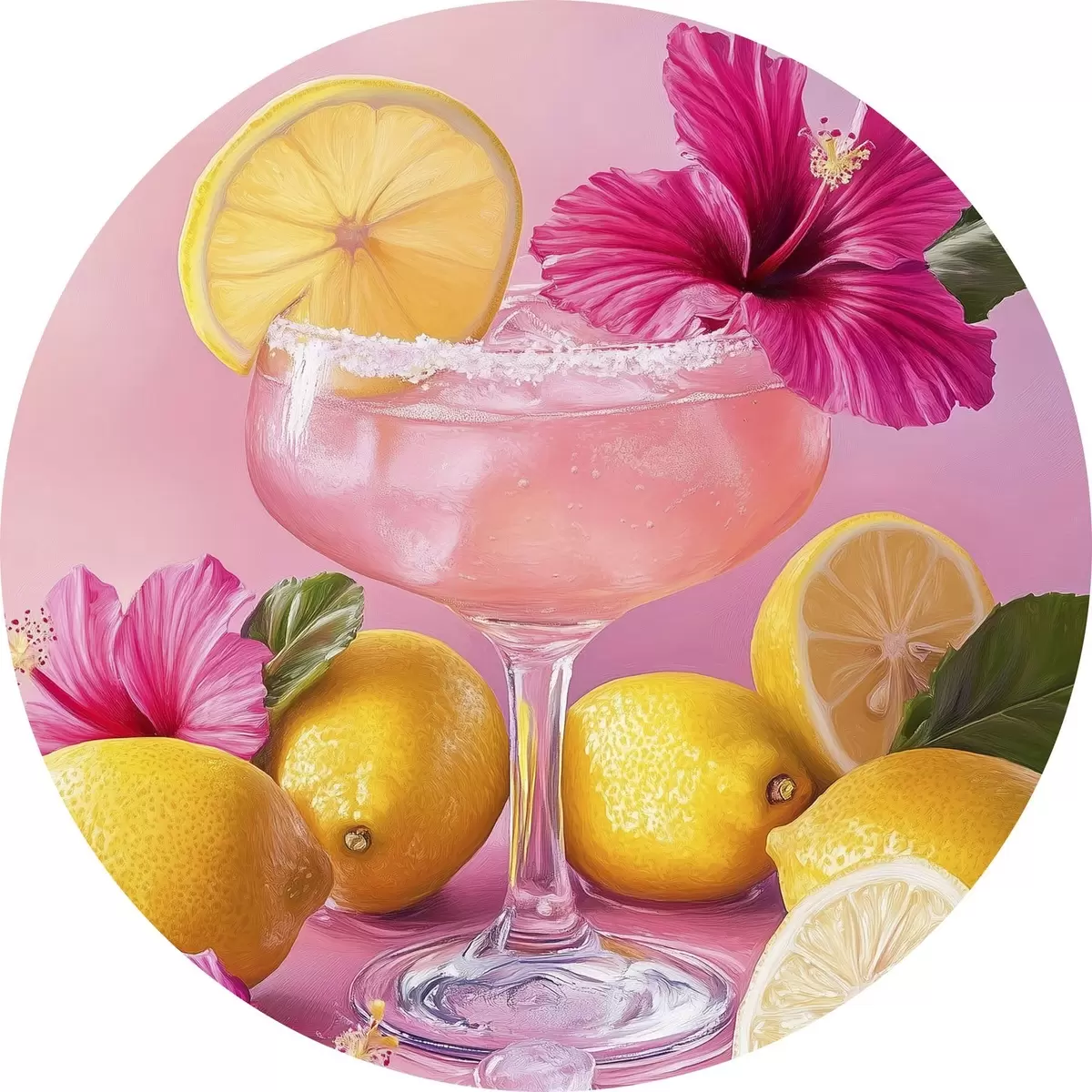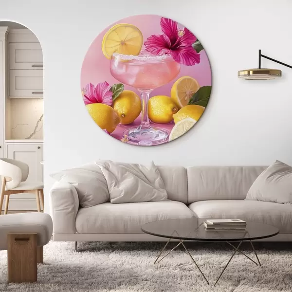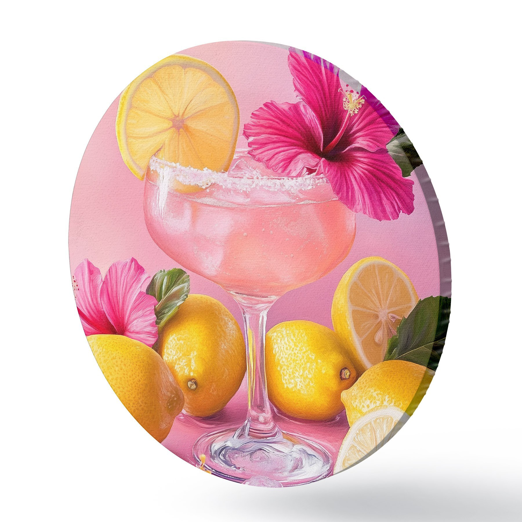 Tableaux ronds Cocktail d'été avec fleurs et citrons, couleurs roses, style aquarelle r43895