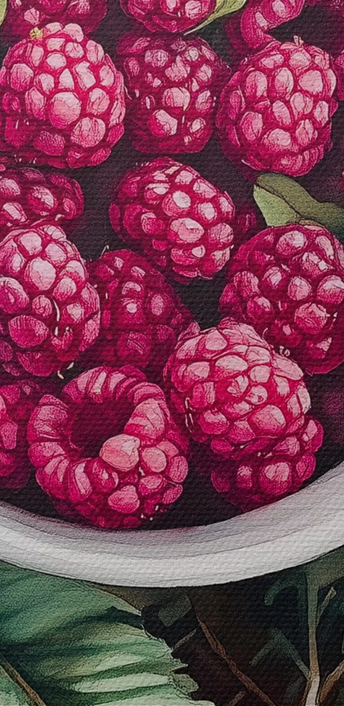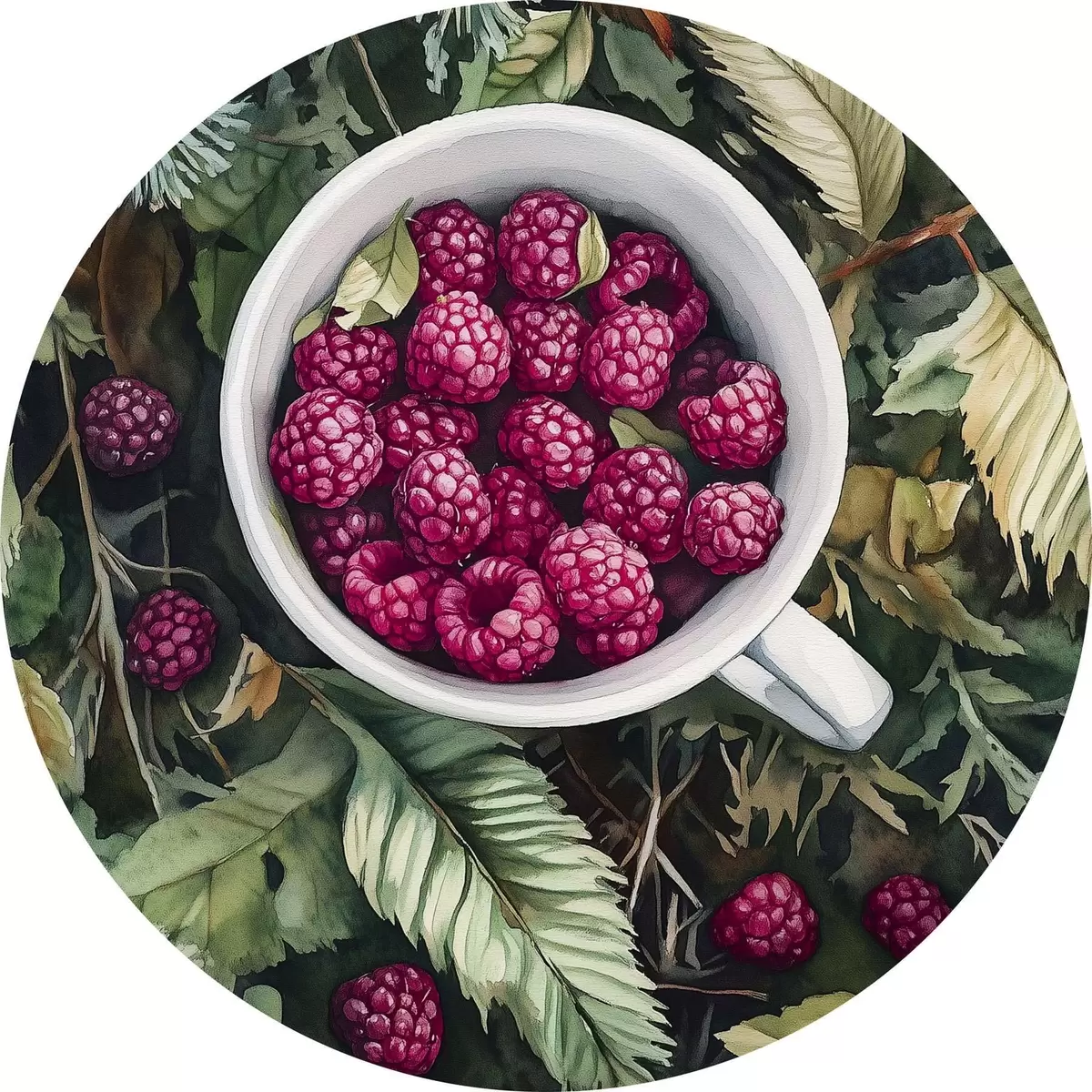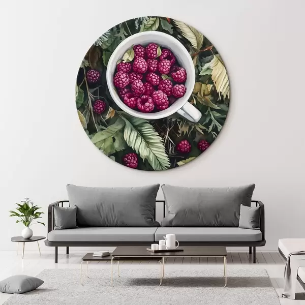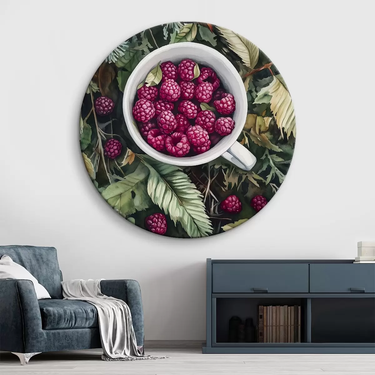 Tableaux ronds Framboises juteuses dans la forêt, rustique, feuilles, style aquarelle r44023