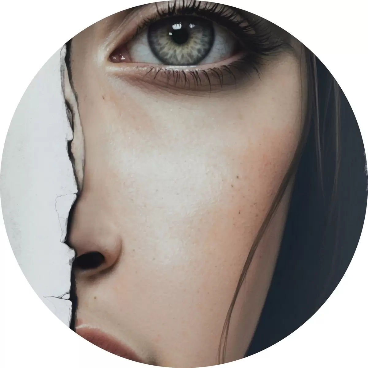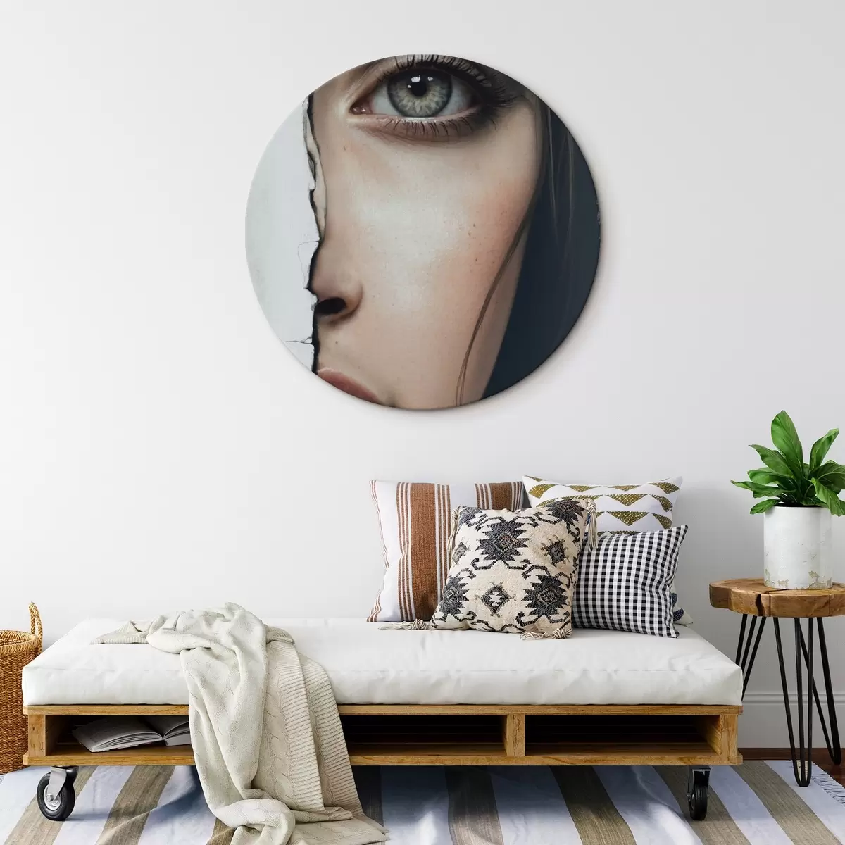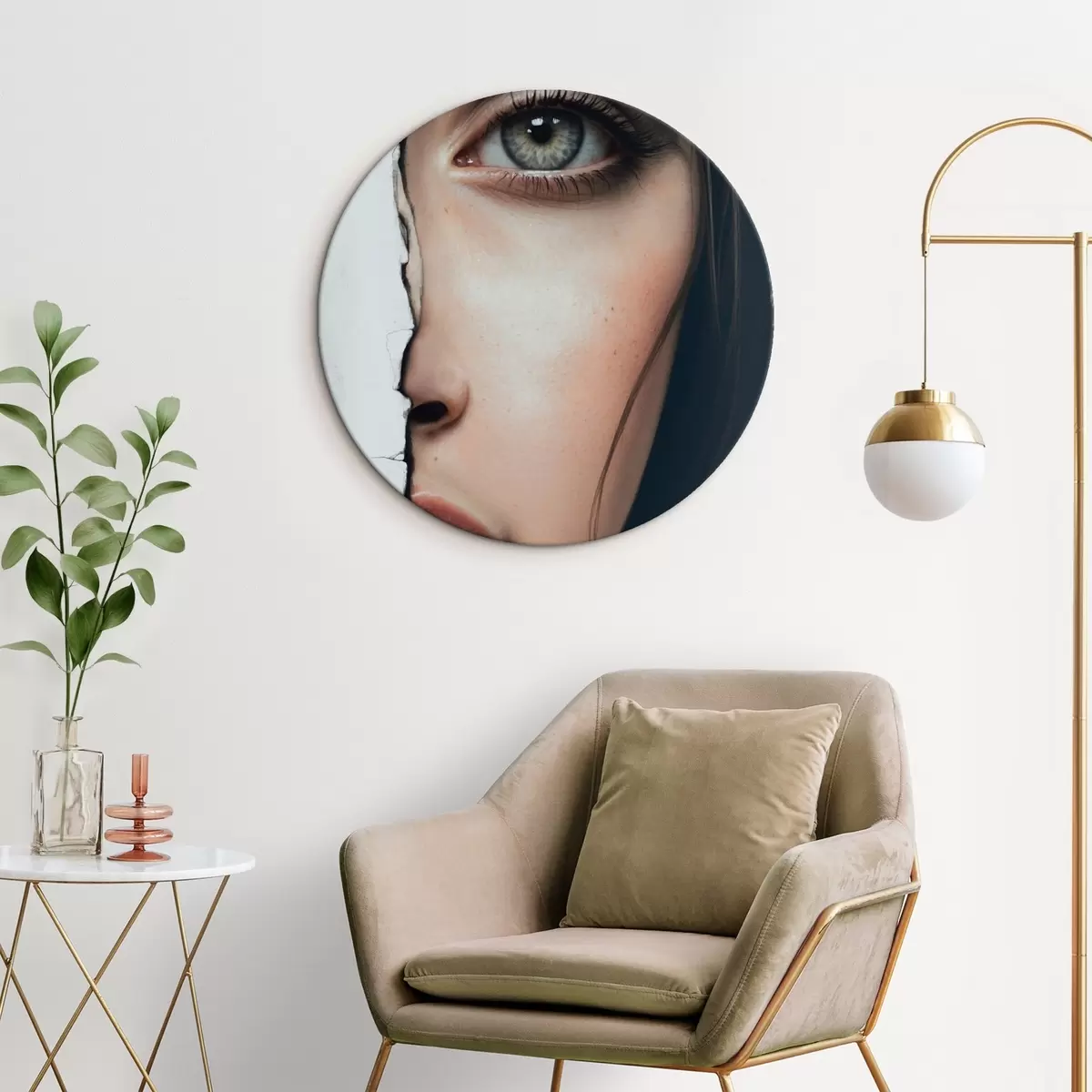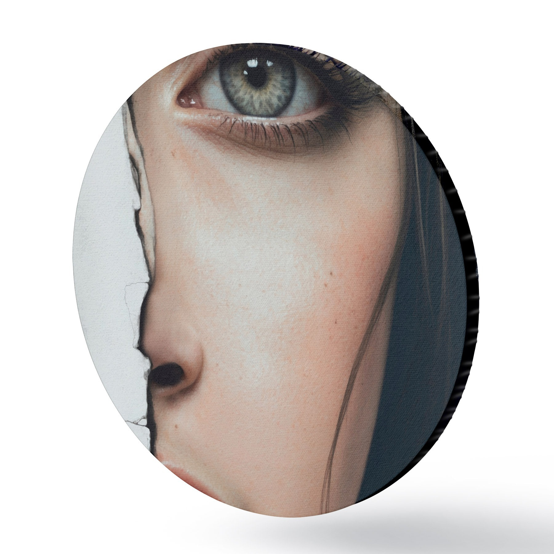 Tableaux ronds Visage de fille derrière un mur blanc r44083
