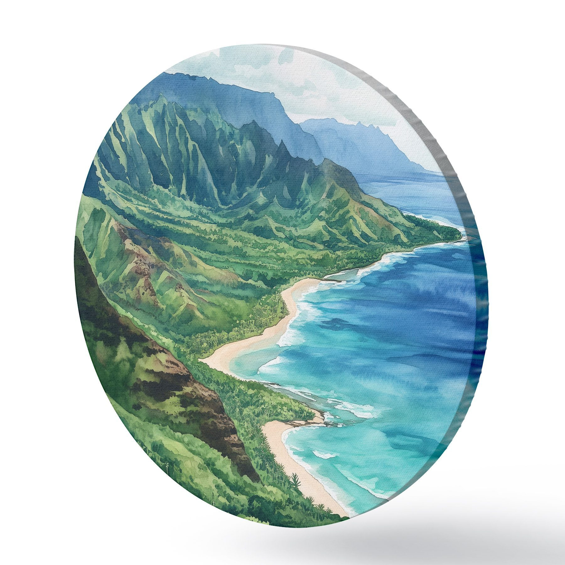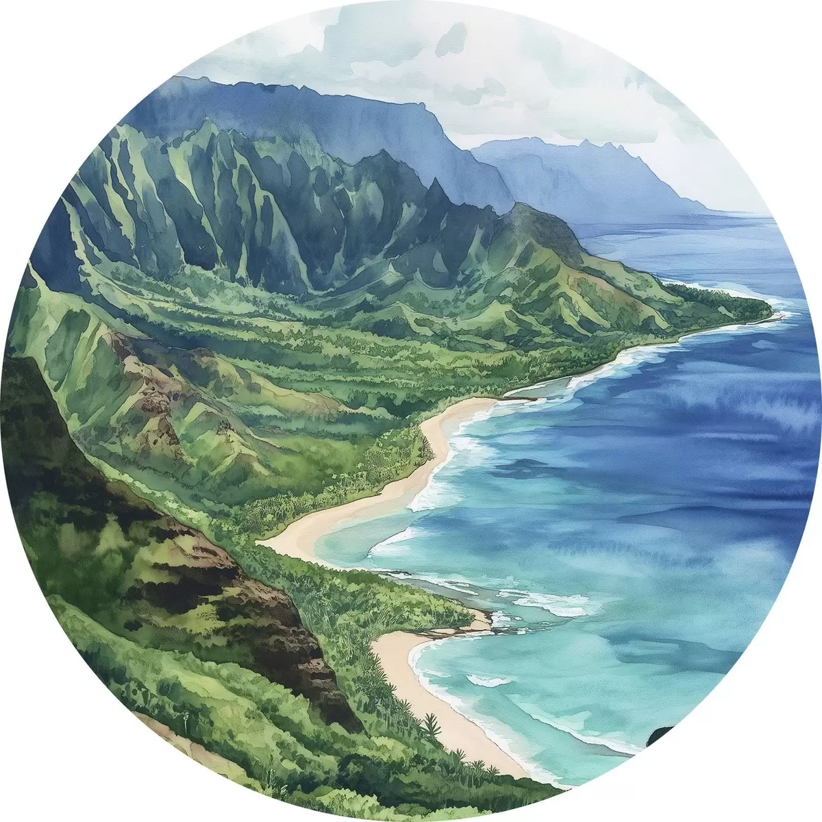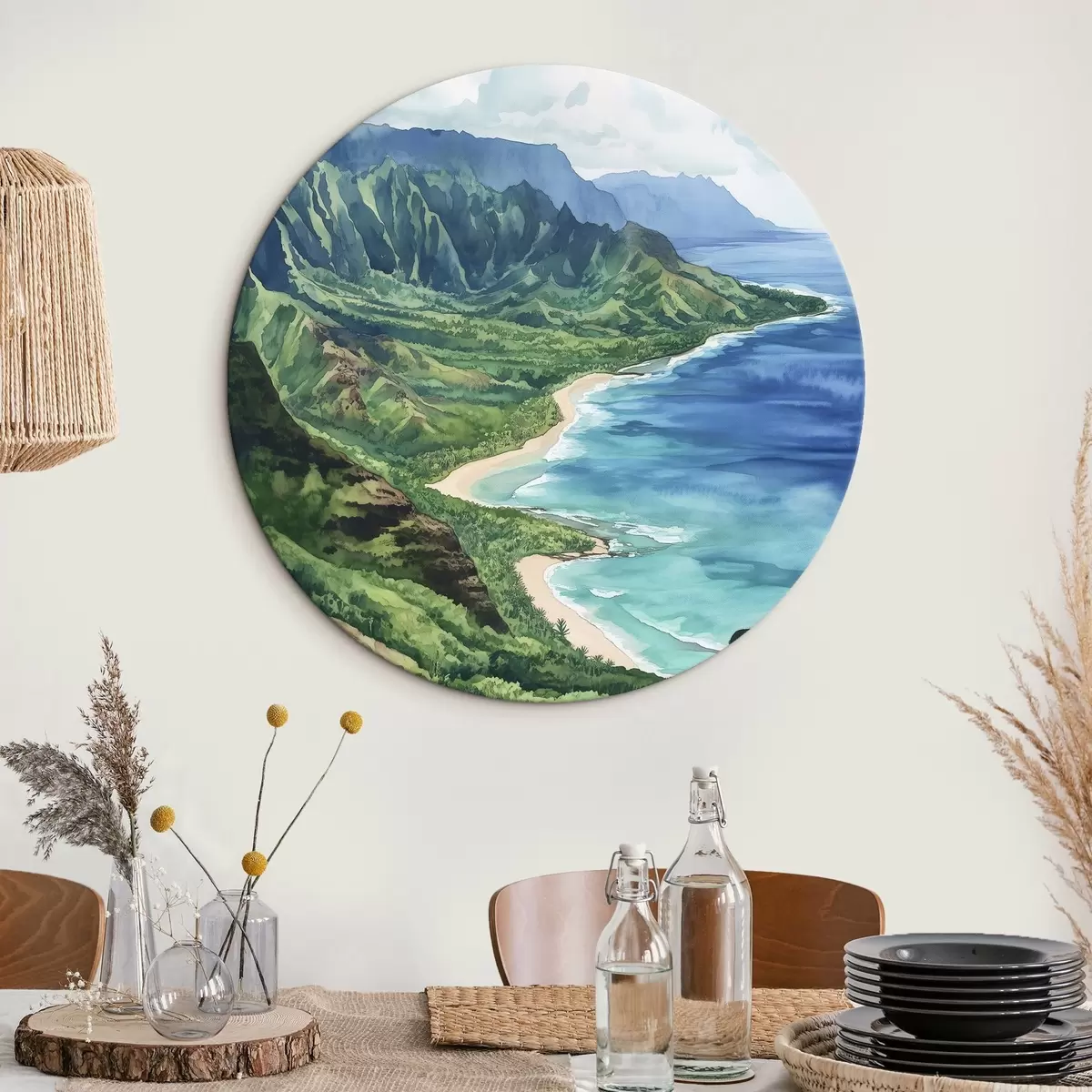 Tableaux ronds Montagnes vertes, Hawaï, océan, tropical, aquarelle r44143