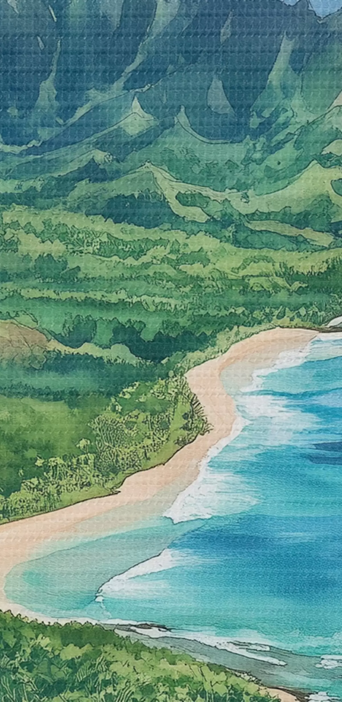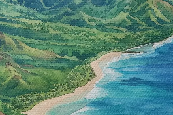 Image Montagnes vertes, Hawaï, océan, tropical, aquarelle Nr r44143